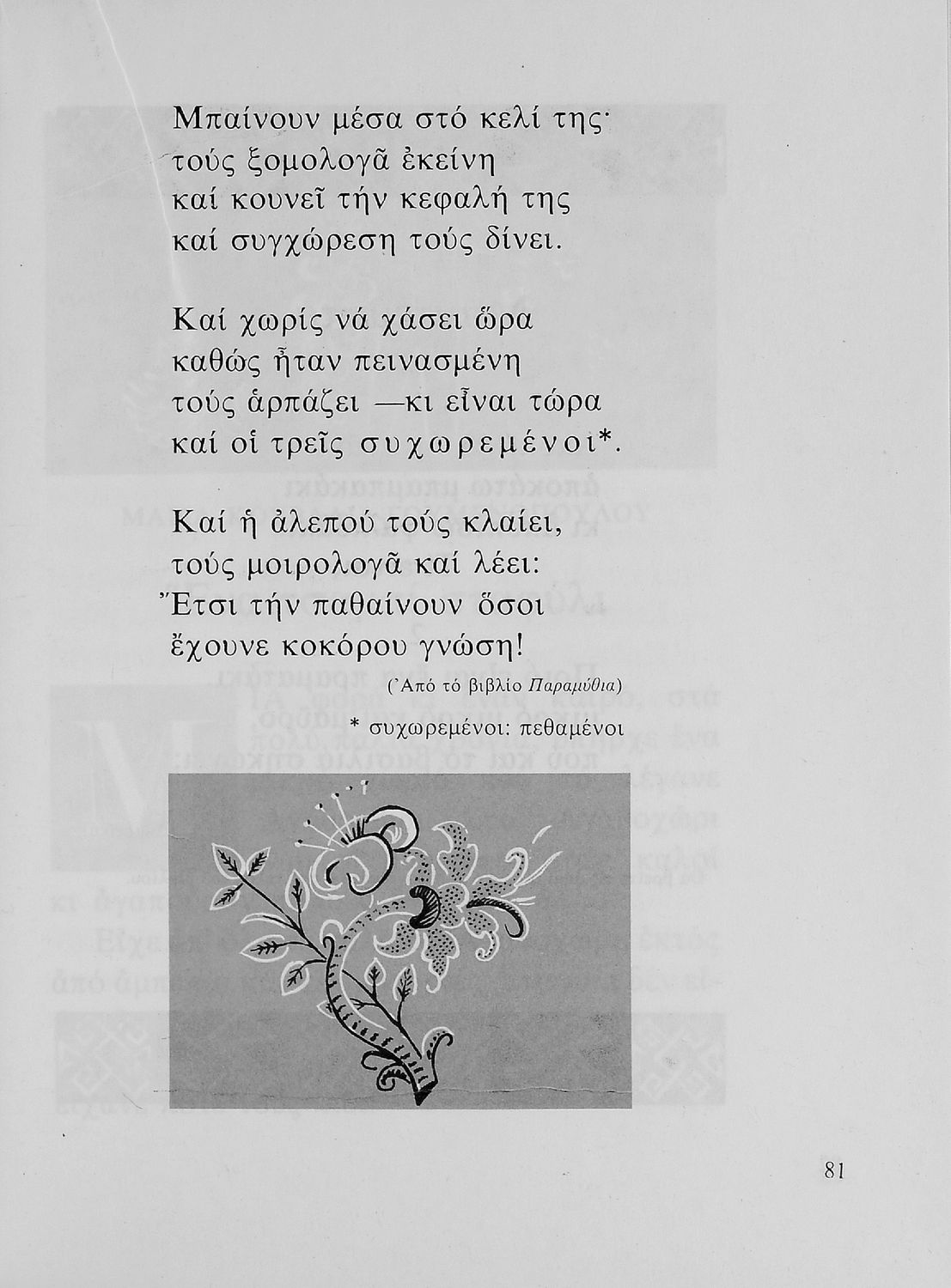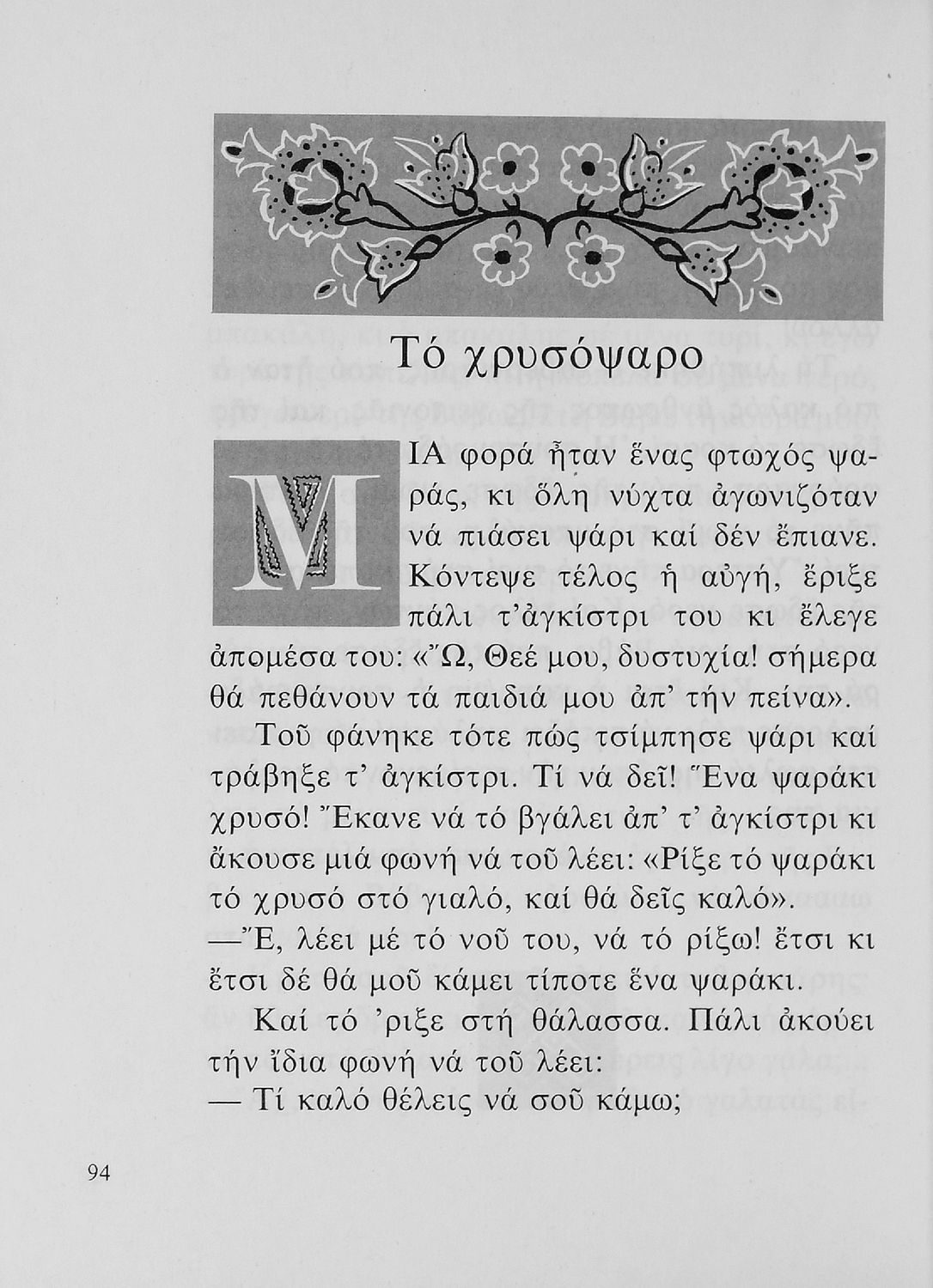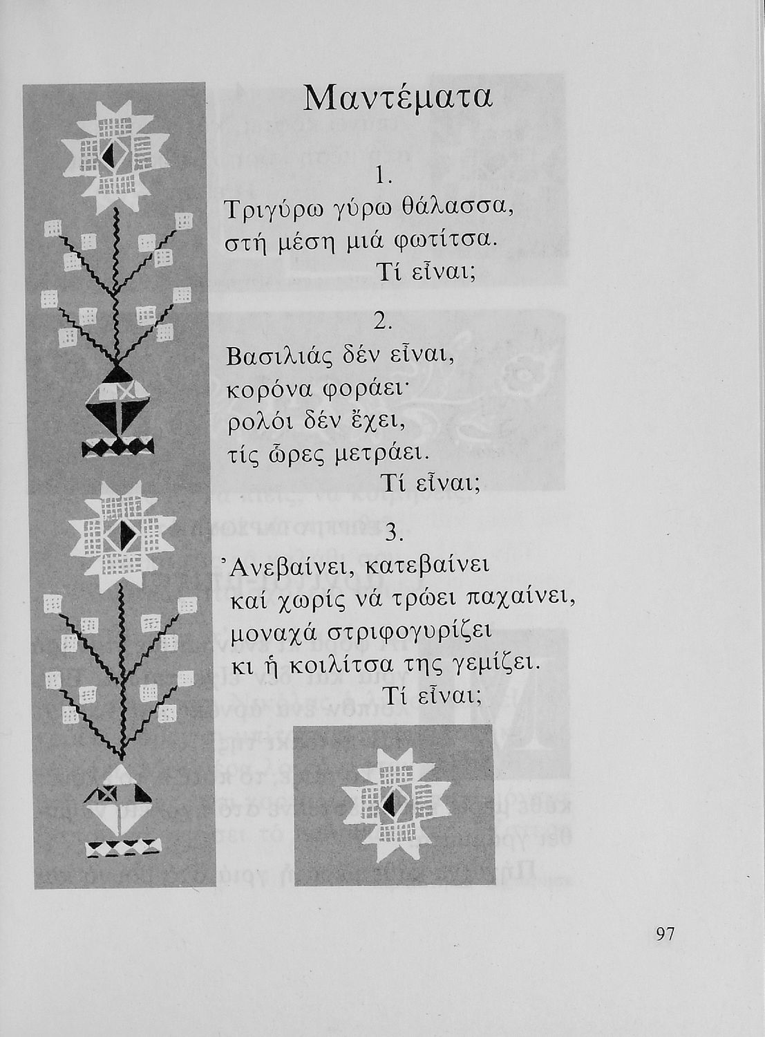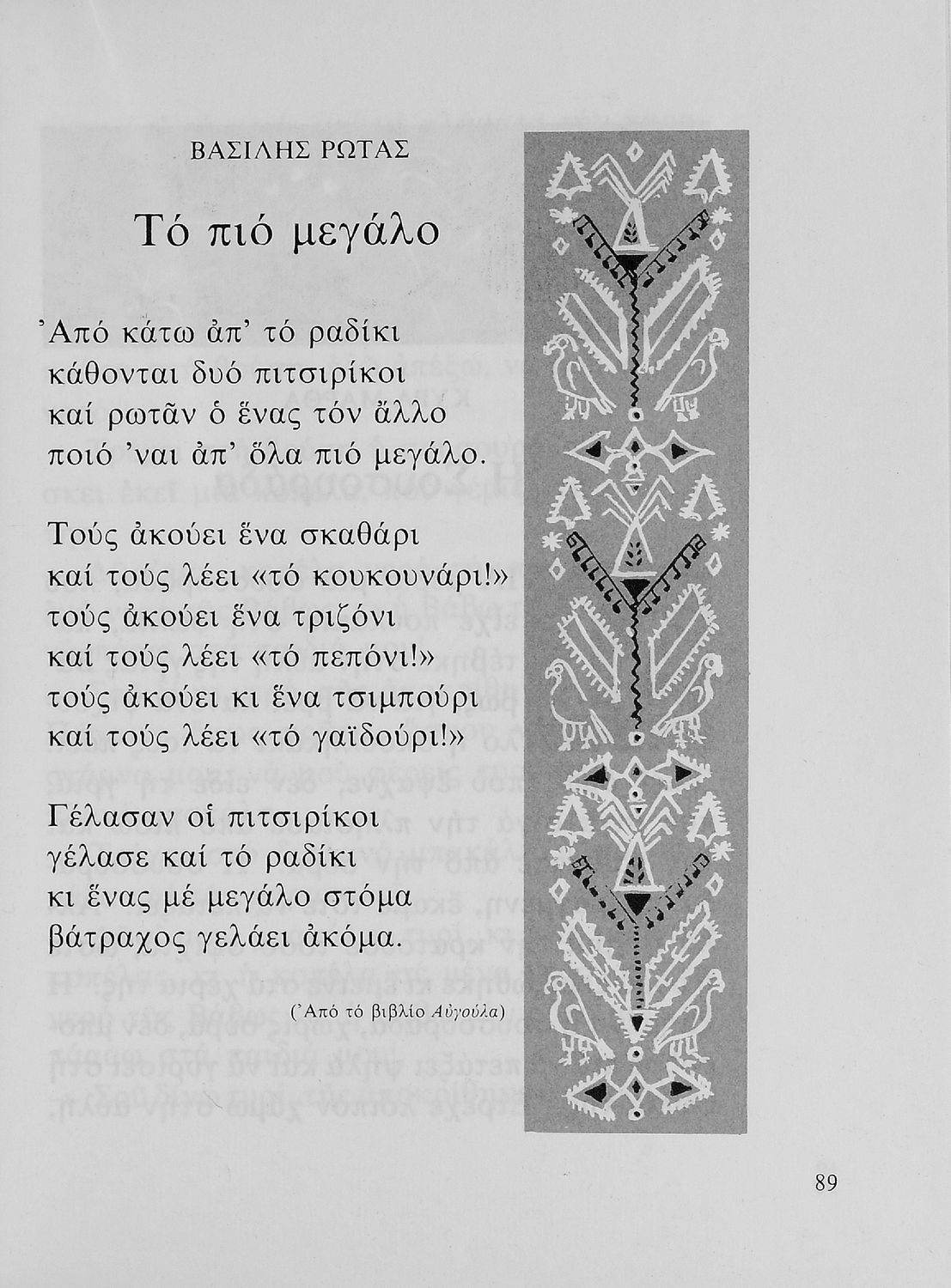 Αναγνωστικό που περιλαμβάνει πεζά και ποιήματα της νέας ελληνικής λογοτεχνίας για τους μαθητές του Δημοτικού. Το βιβλίο είναι αφιερωμένο στη μνήμη του Ζαχαρία Παπαντωνίου και αναδημοσιεύει αρκετά κείμενα από τα αναγνωστικά των εκπαιδευτικών μεταρρυθμίσεων του Ελευθερίου Βενιζέλου.