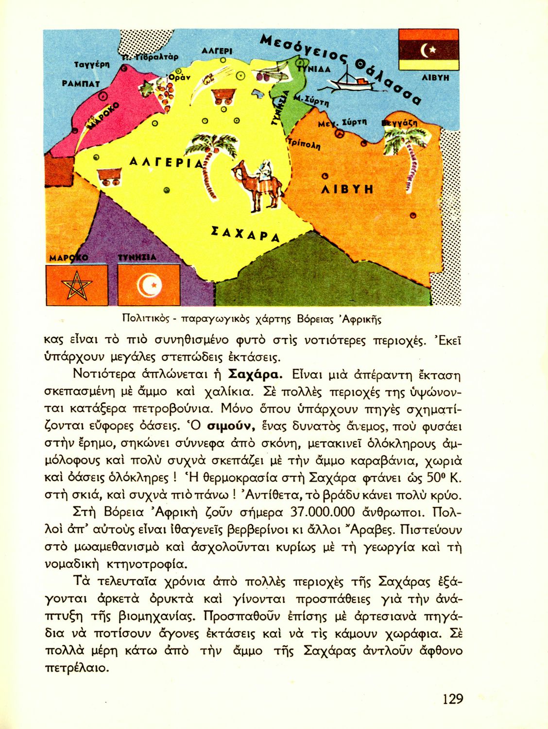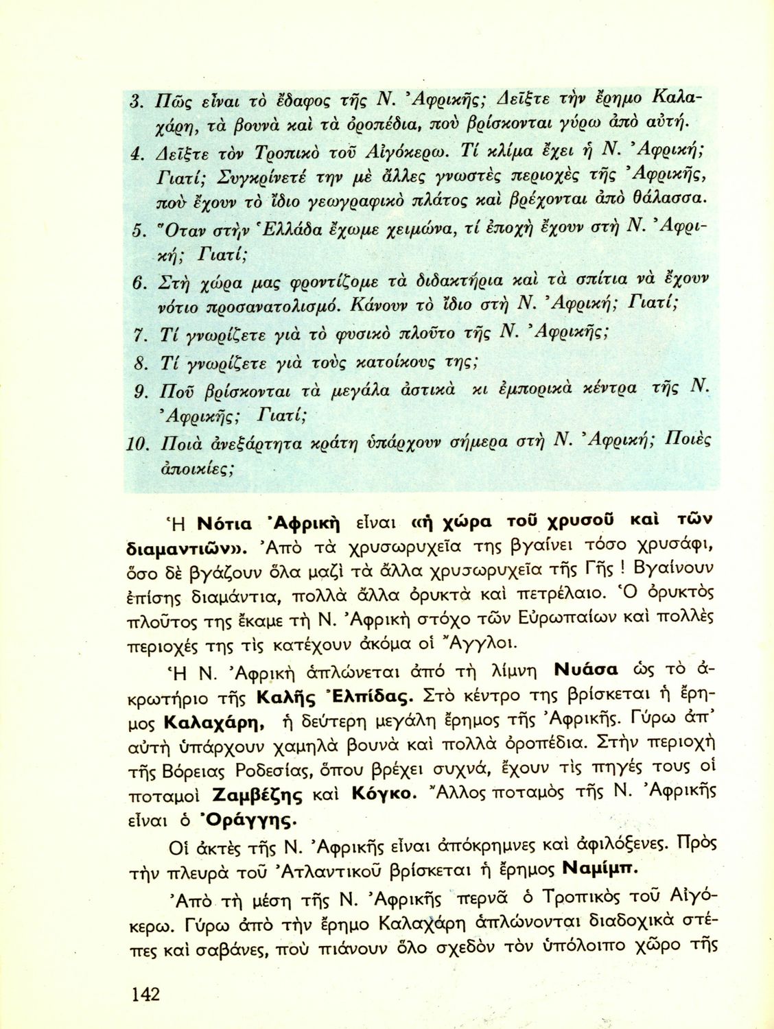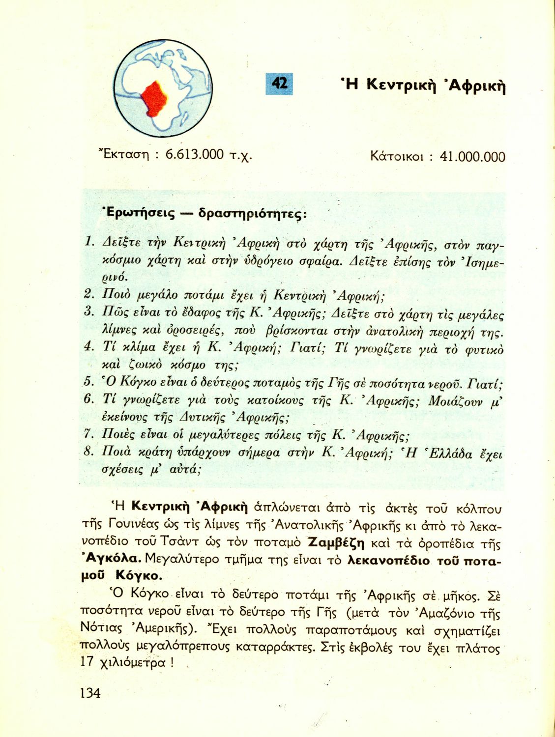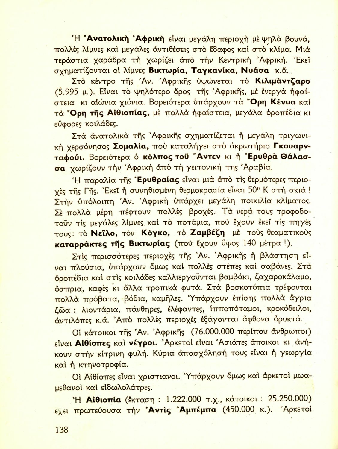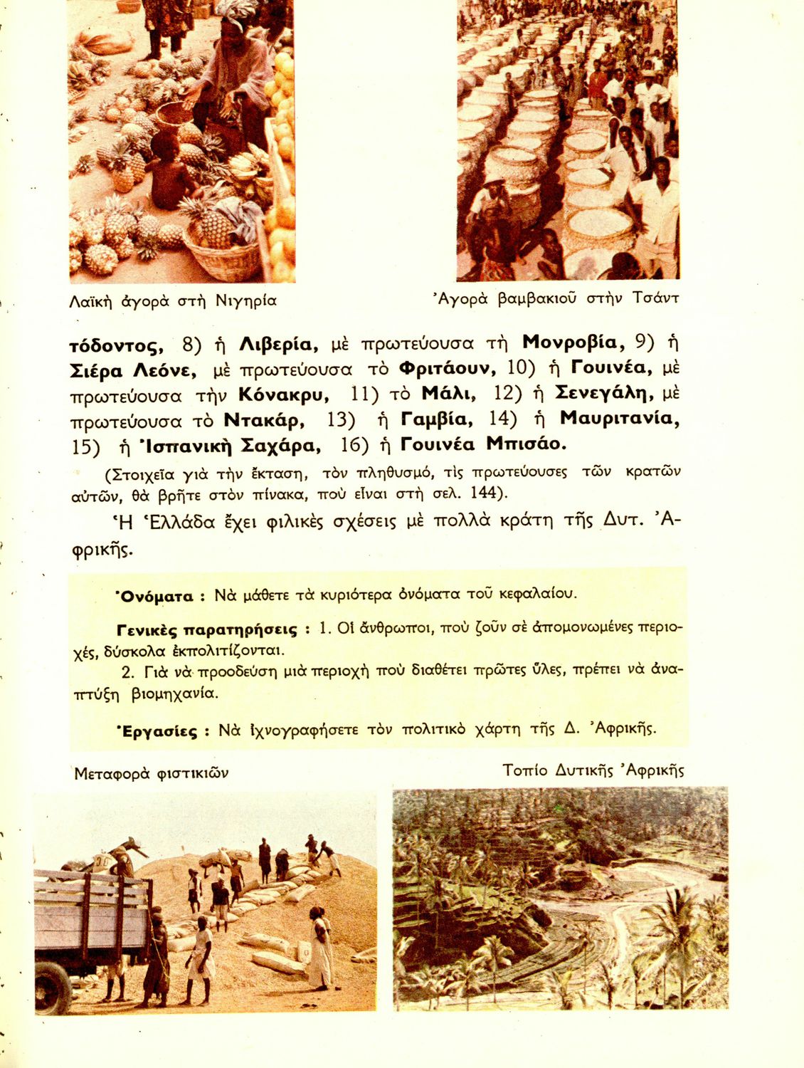 Σχολικό εγχειρίδιο Γεωγραφίας που εξετάζει ενδεικτικές χώρες και περιοχές από τις πέντε ηπείρους εκτός της Ευρώπης από γεωφυσική και οικονομική πλευρά. Φέρει το σύμβολο της δικτατορίας.