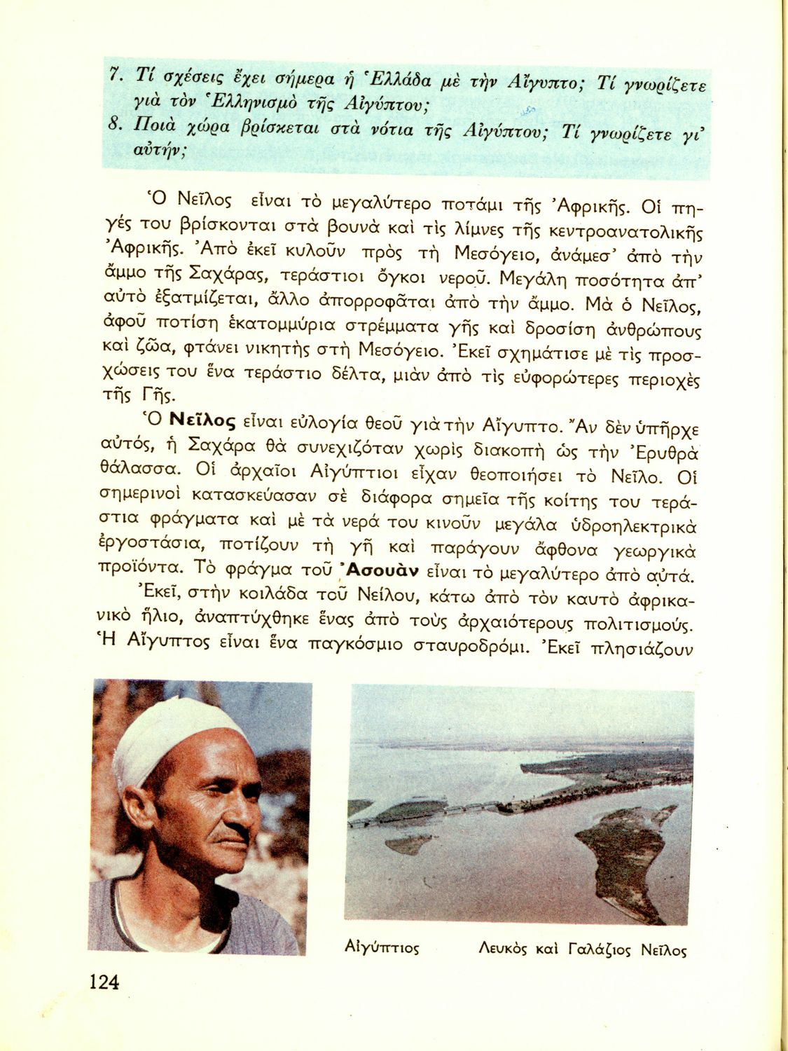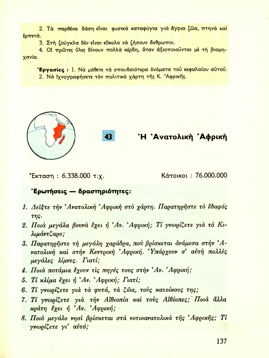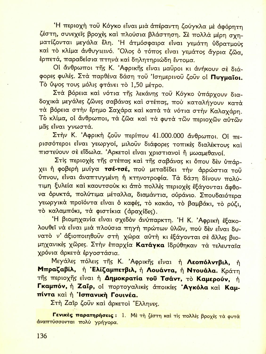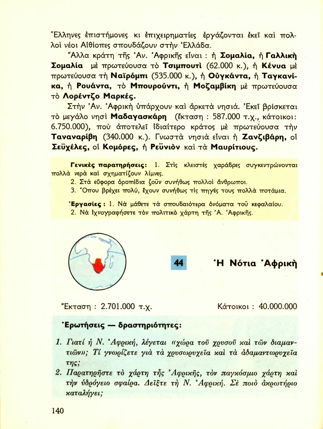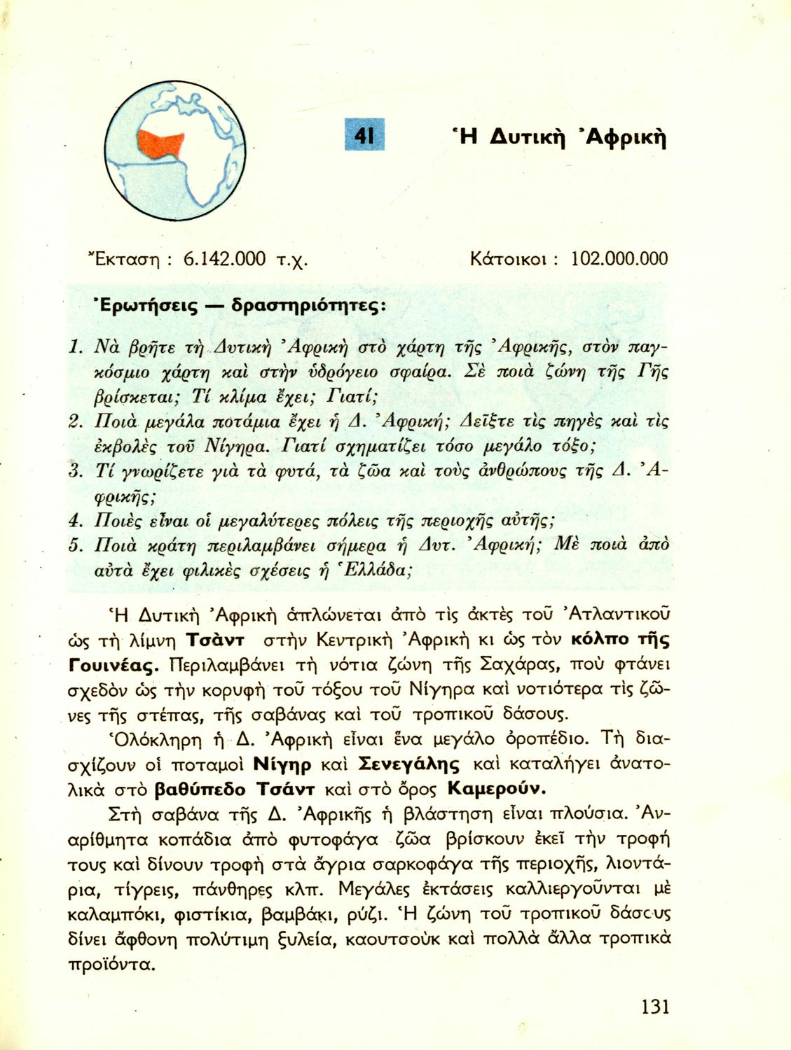 Σχολικό εγχειρίδιο Γεωγραφίας που εξετάζει ενδεικτικές χώρες και περιοχές από τις πέντε ηπείρους εκτός της Ευρώπης από γεωφυσική και οικονομική πλευρά. Φέρει το σύμβολο της δικτατορίας.