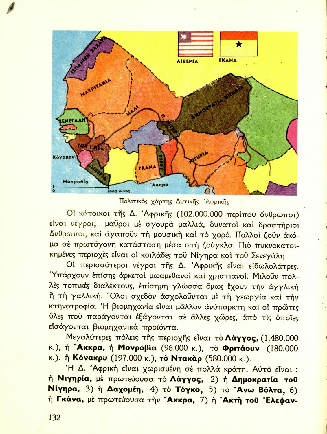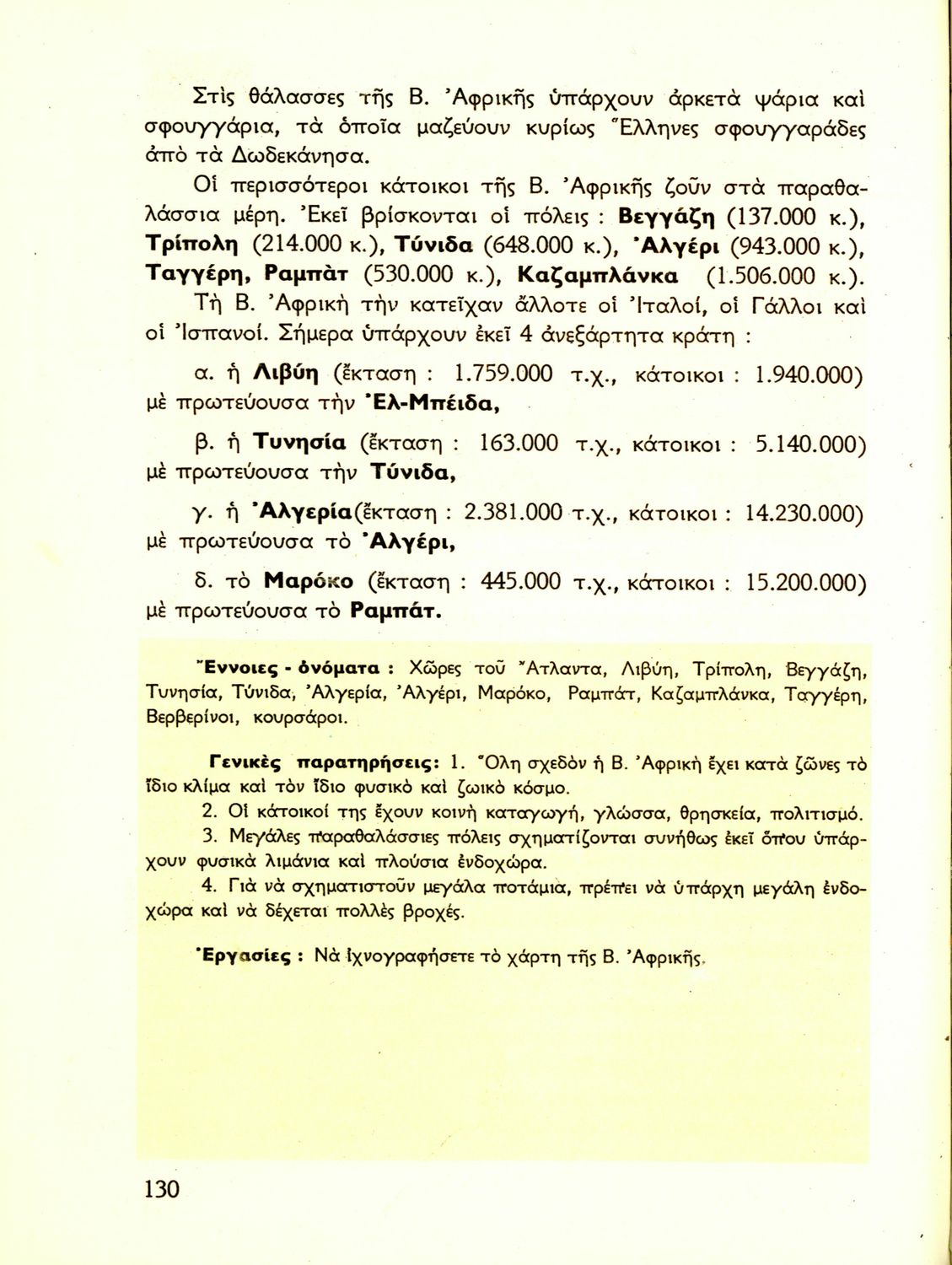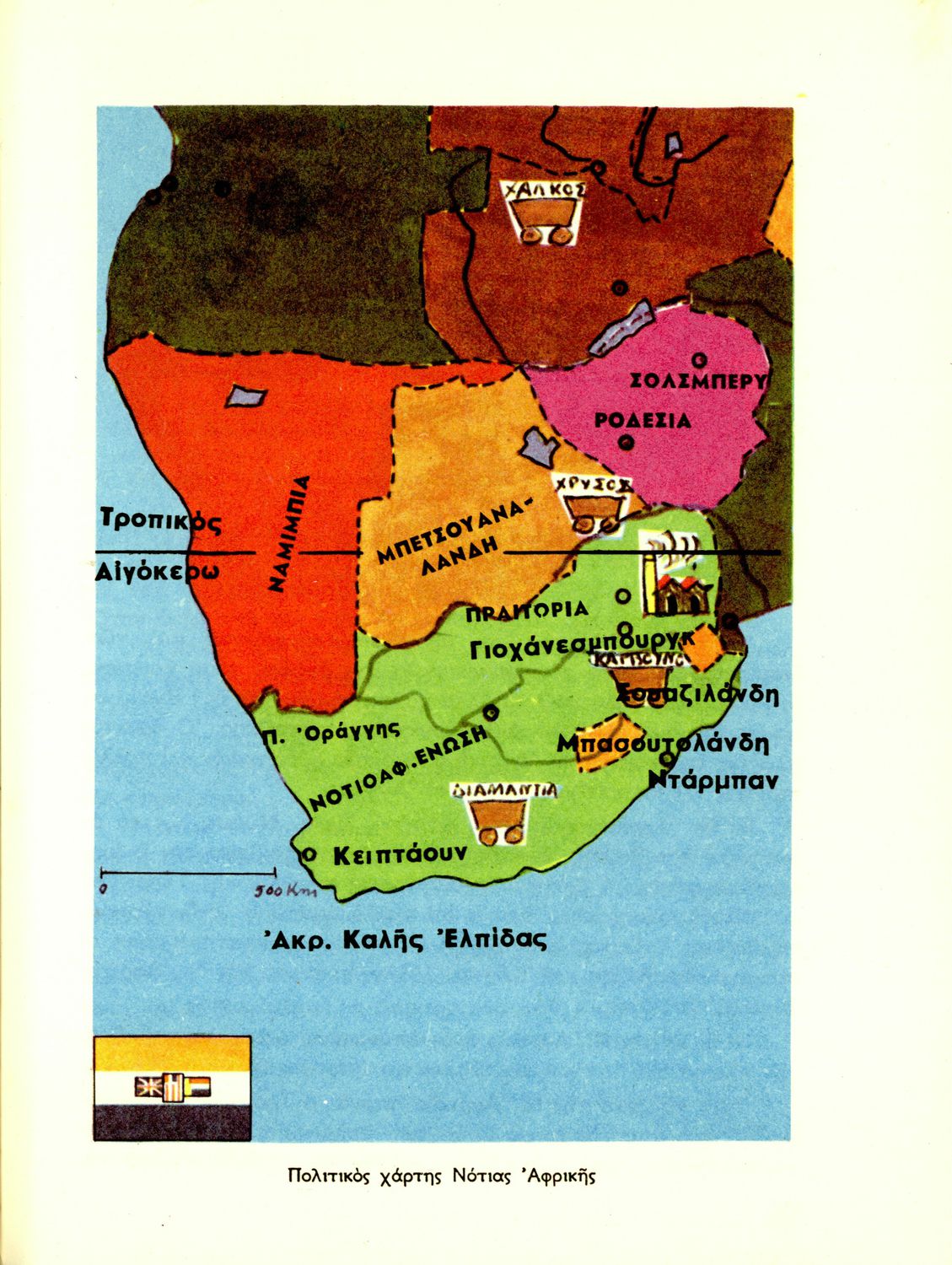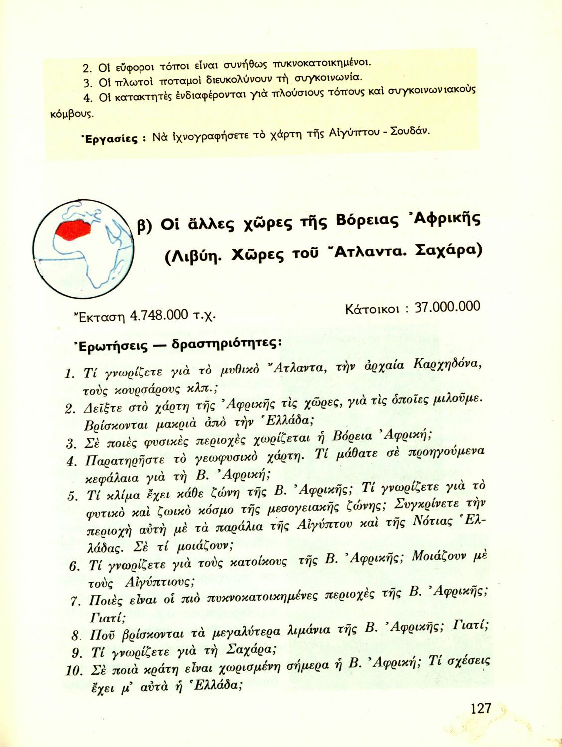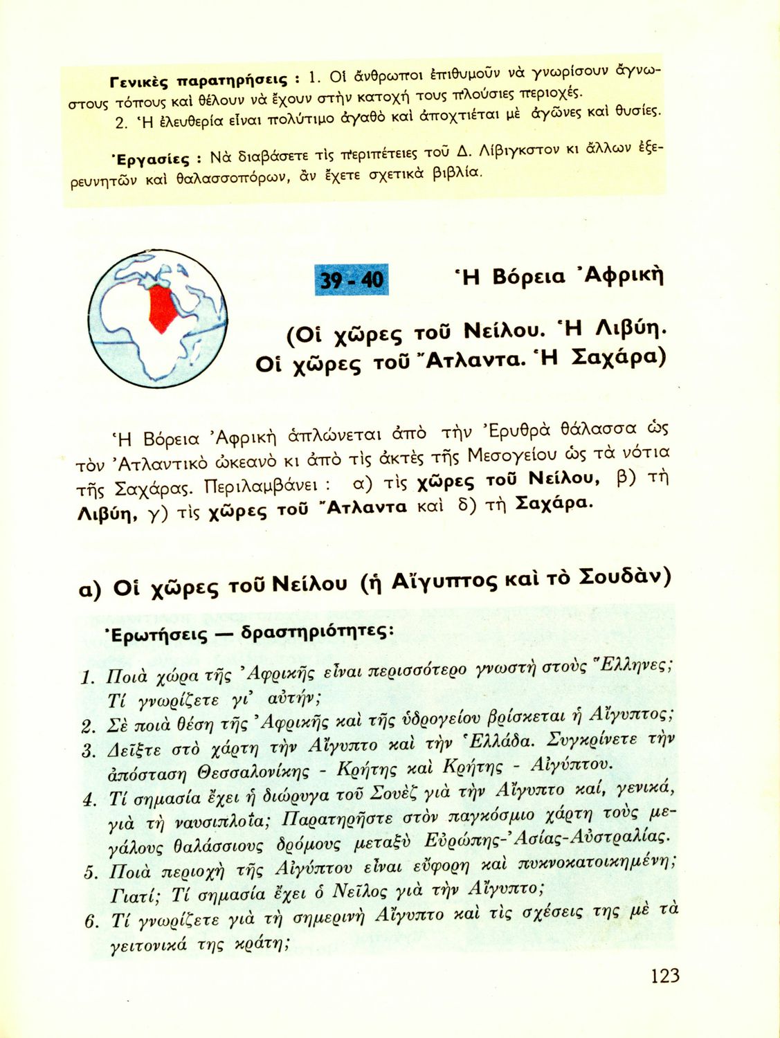 Σχολικό εγχειρίδιο Γεωγραφίας που εξετάζει ενδεικτικές χώρες και περιοχές από τις πέντε ηπείρους εκτός της Ευρώπης από γεωφυσική και οικονομική πλευρά. Φέρει το σύμβολο της δικτατορίας.