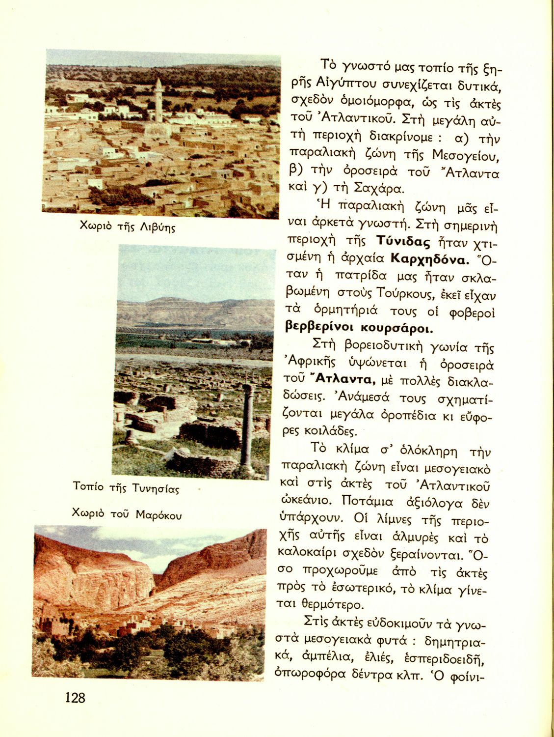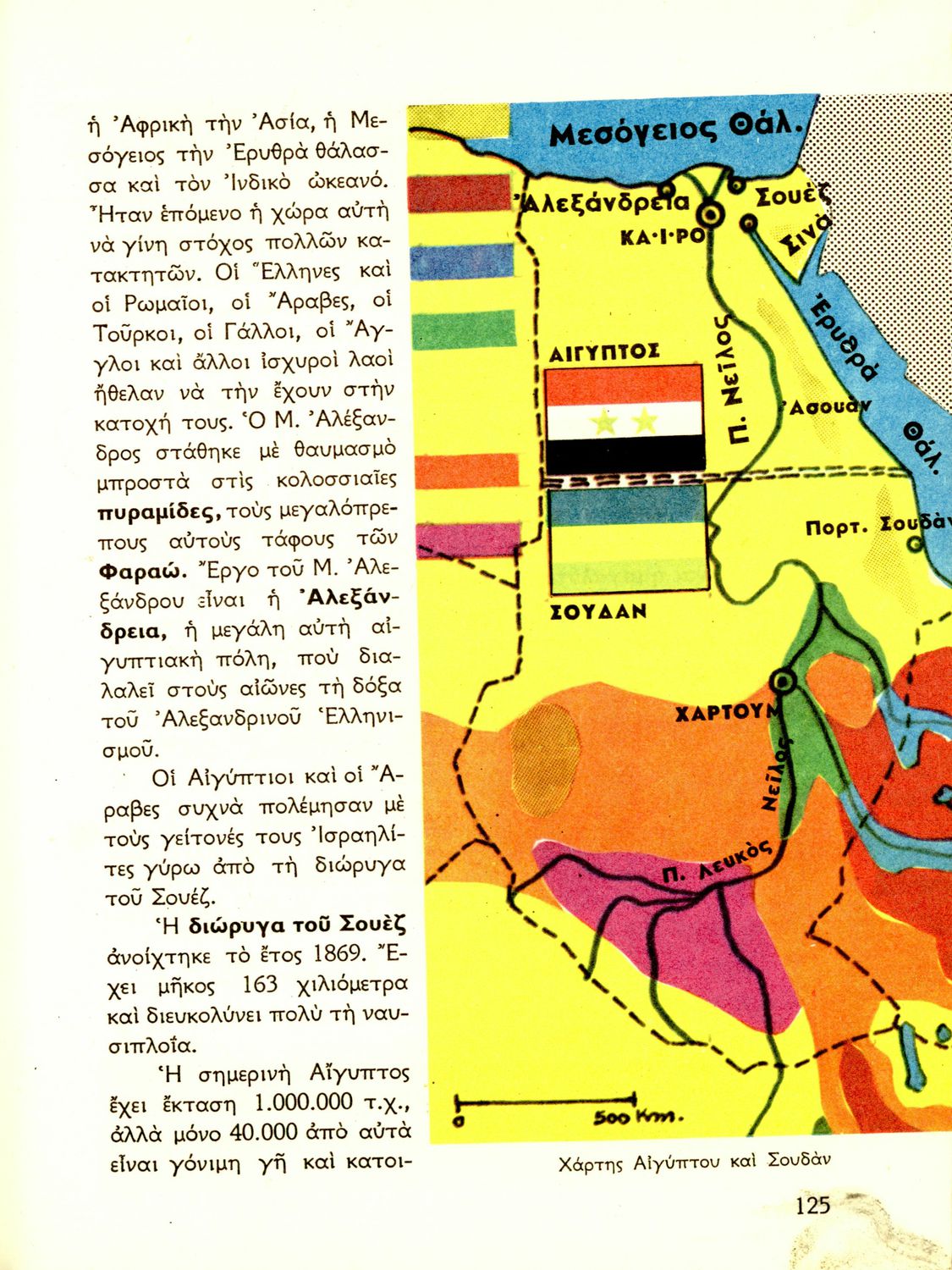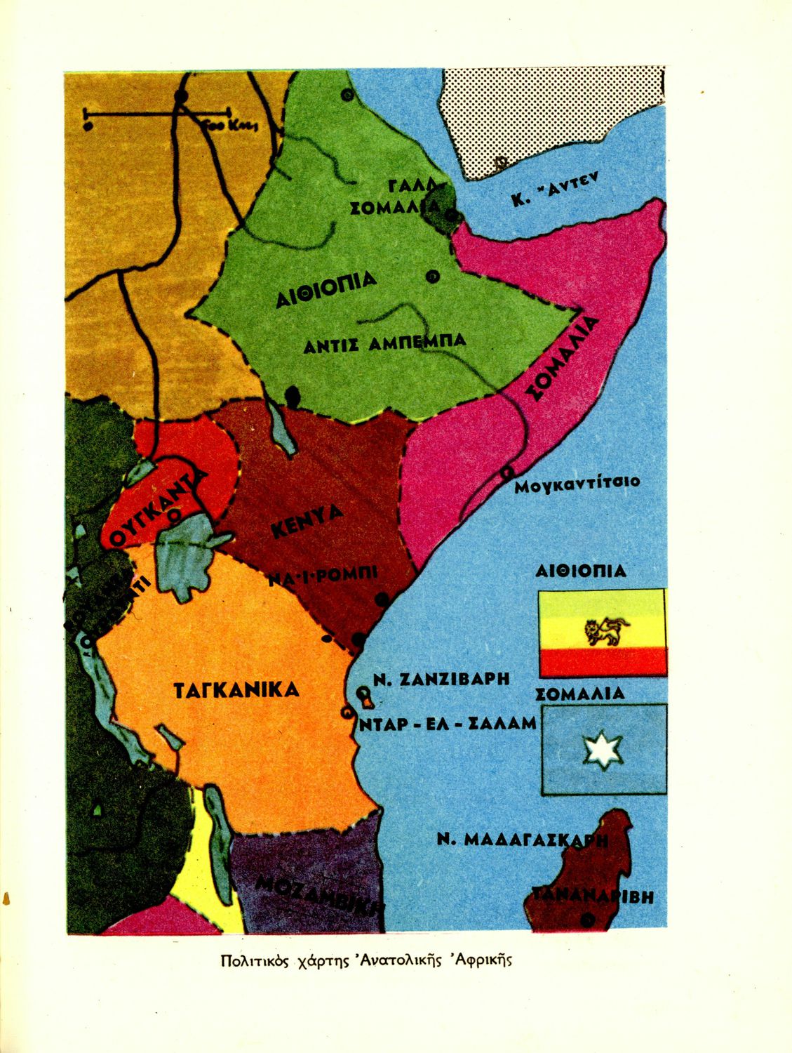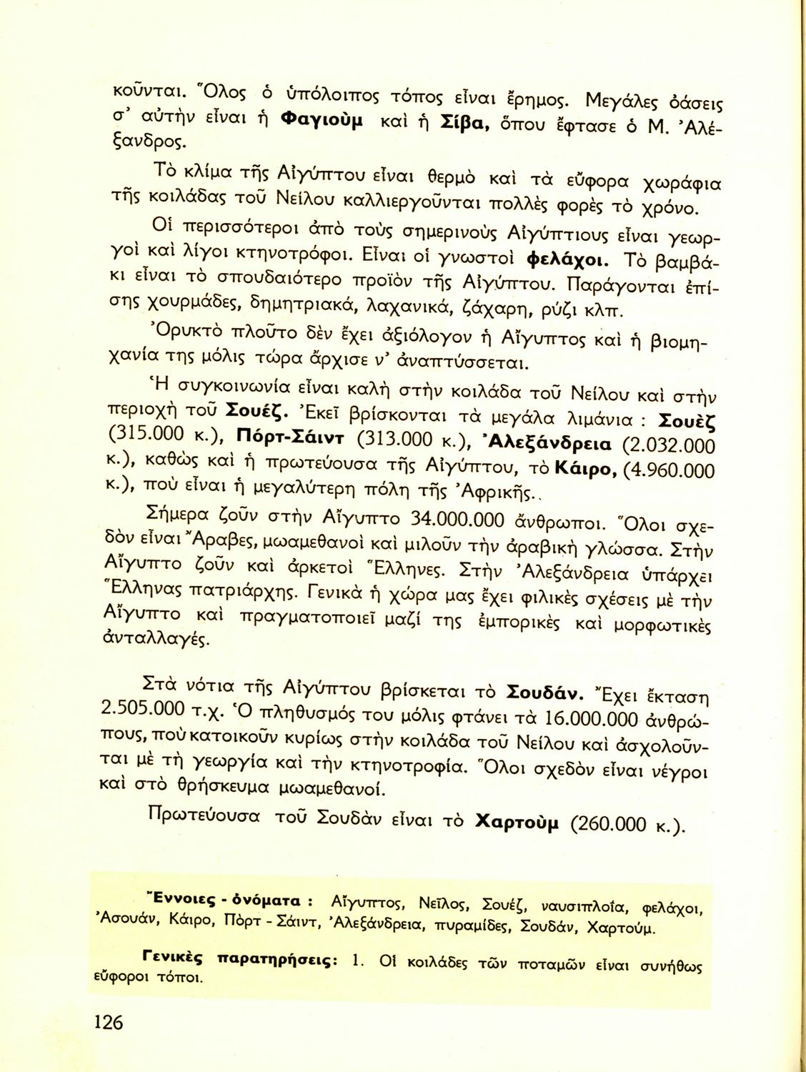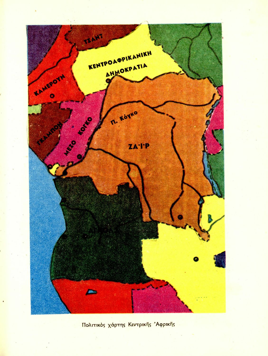 Σχολικό εγχειρίδιο Γεωγραφίας που εξετάζει ενδεικτικές χώρες και περιοχές από τις πέντε ηπείρους εκτός της Ευρώπης από γεωφυσική και οικονομική πλευρά. Φέρει το σύμβολο της δικτατορίας.