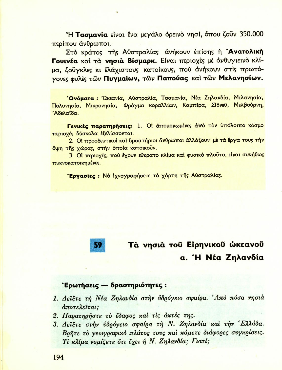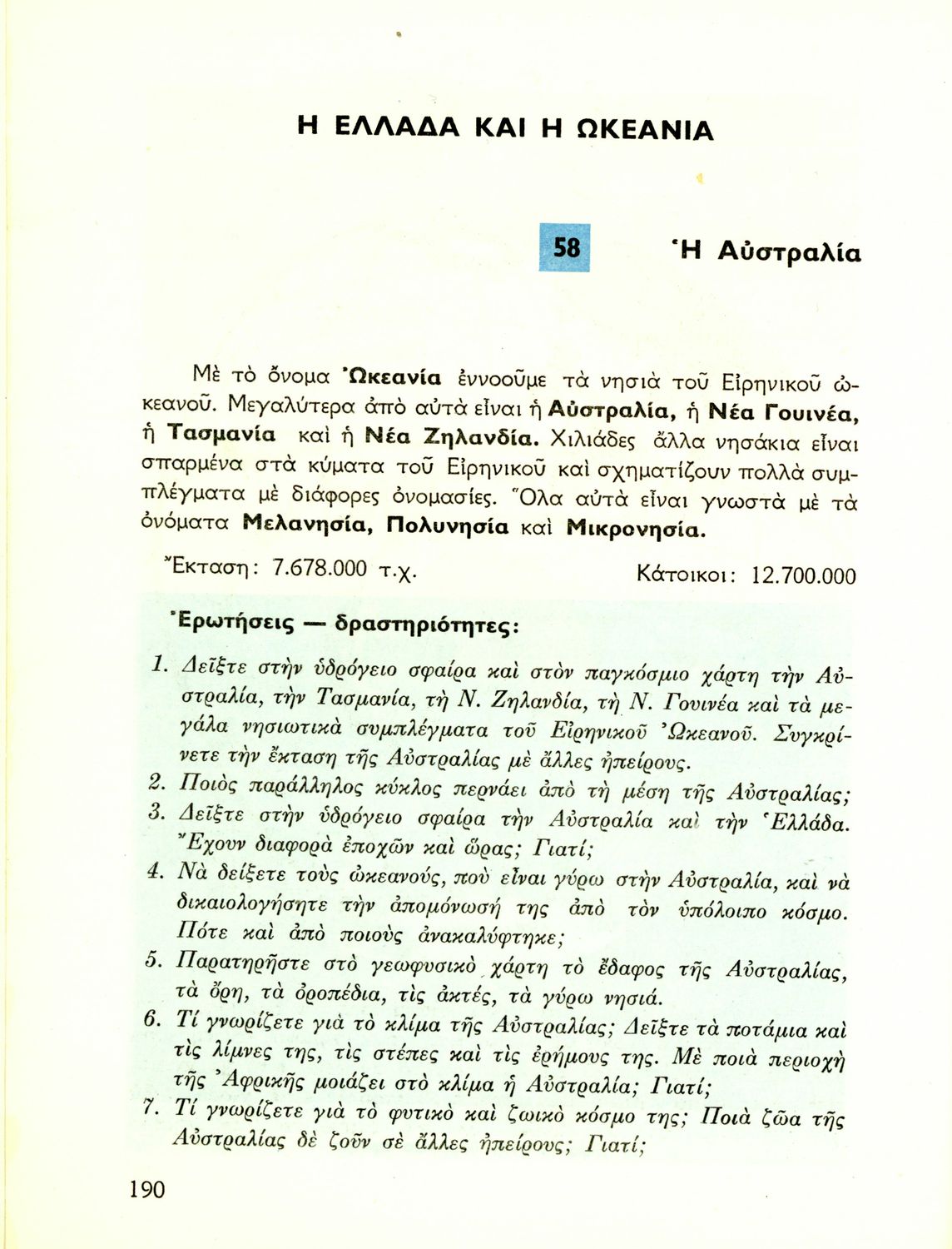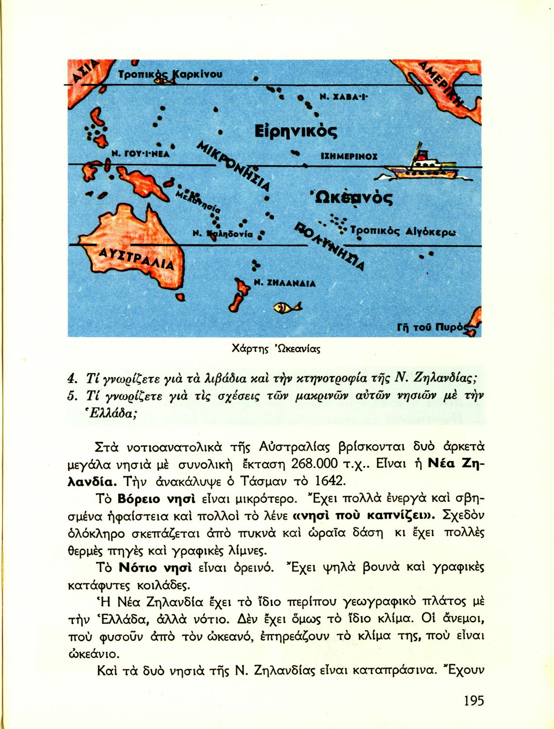 Βαθμίδα εκπαίδευσης: Πρωτοβάθμια Τάξη: Ε' Δημοτικού Μάθημα: Γεωγραφία Γλώσσα: Δημοτική Παρουσίαση περιεχομένου: Σχολικό εγχειρίδιο Γεωγραφίας Ε΄ Δημοτικού που περιλαμβάνει στοιχεία φυσικής, μαθηματικής και πολιτικής γεωγραφίας και εστιάζει στη γεωμορφολογική και γεωπολιτική κατάσταση της Ασίας, της Αφρικής, της Αμερικής, Ανταρκτικής και της Ωκεανίας. |