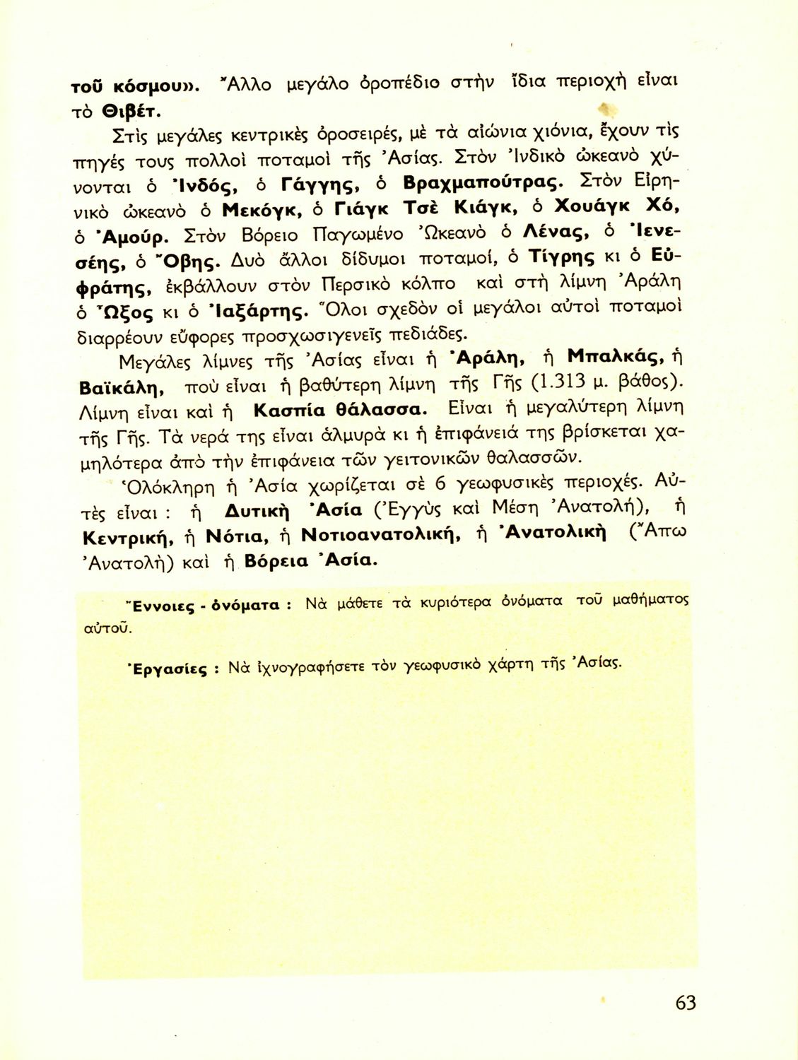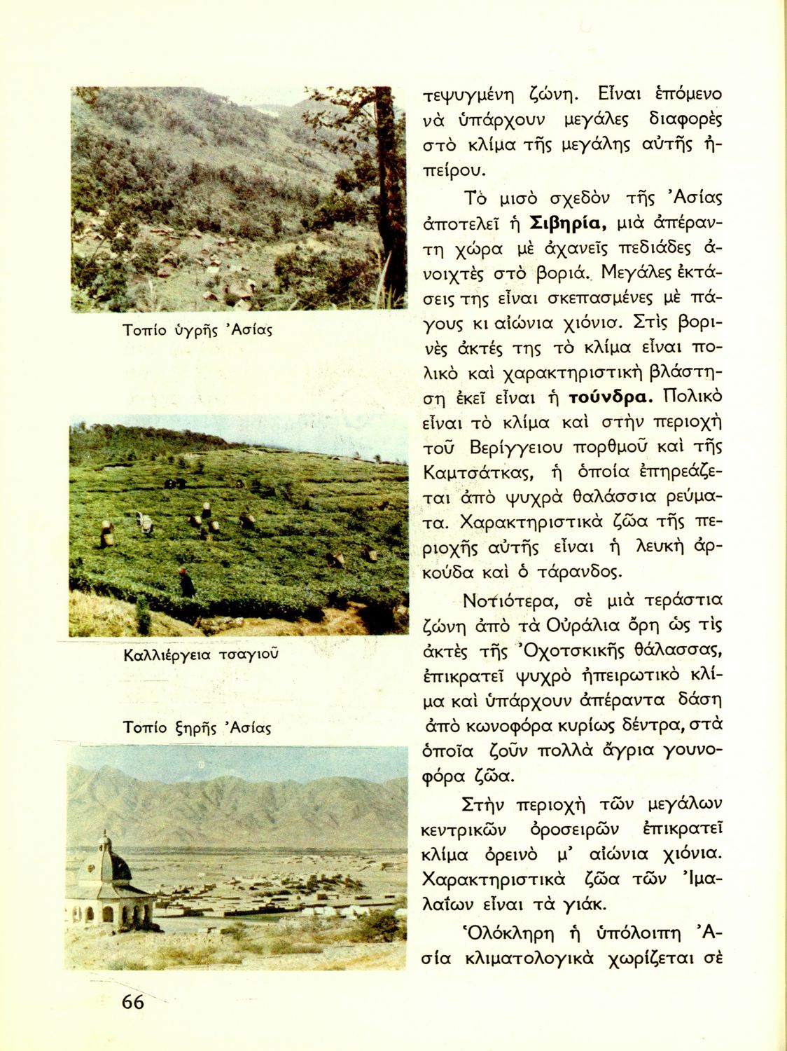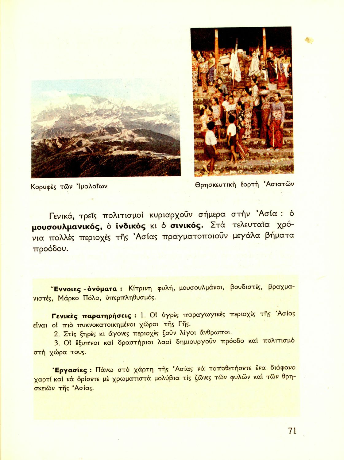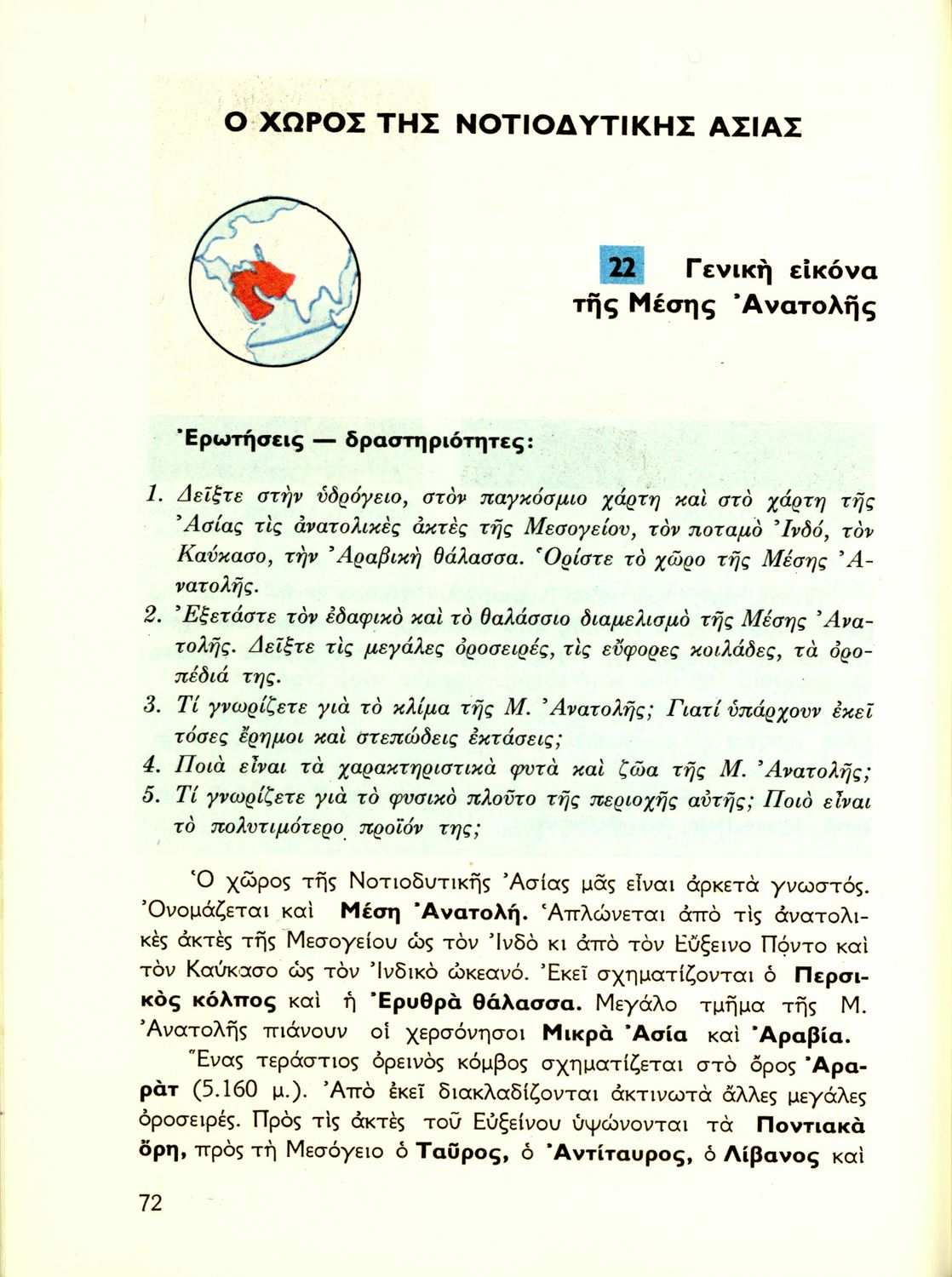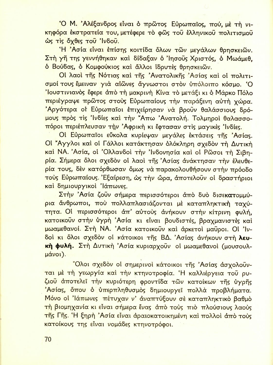 Σχολικό εγχειρίδιο Γεωγραφίας που εξετάζει ενδεικτικές χώρες και περιοχές από τις πέντε ηπείρους εκτός της Ευρώπης από γεωφυσική και οικονομική πλευρά. Φέρει το σύμβολο της δικτατορίας.