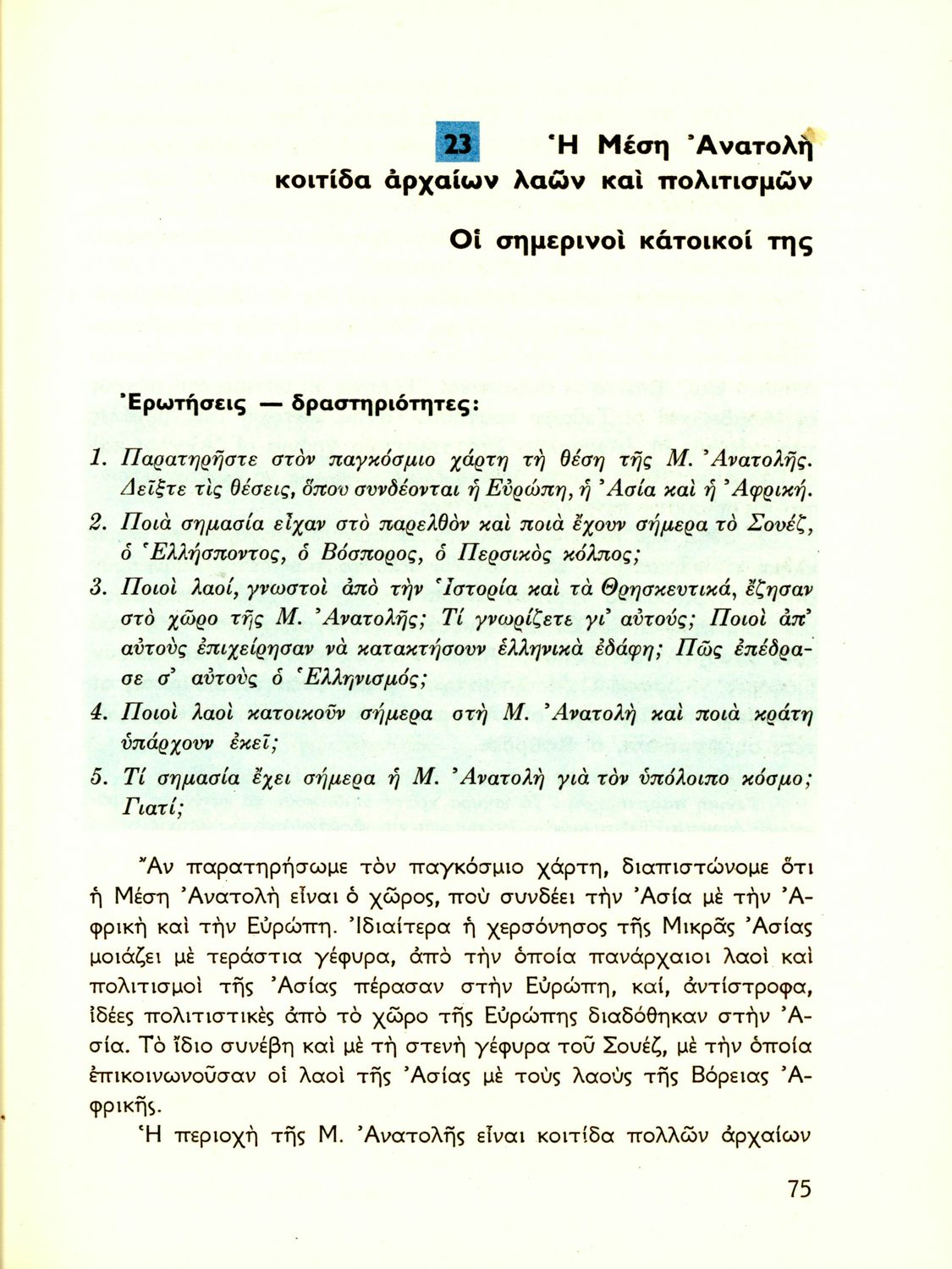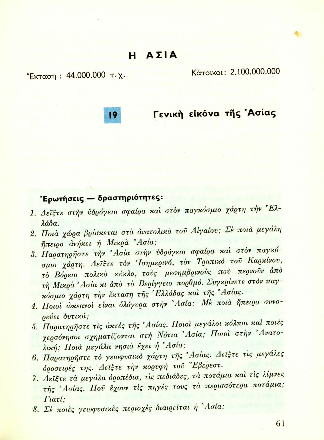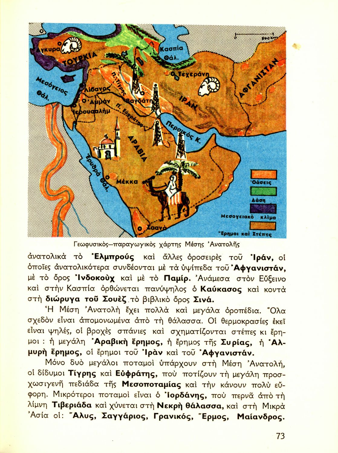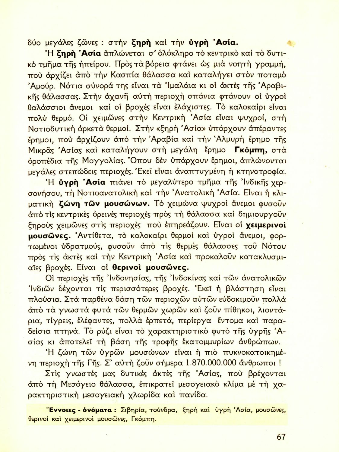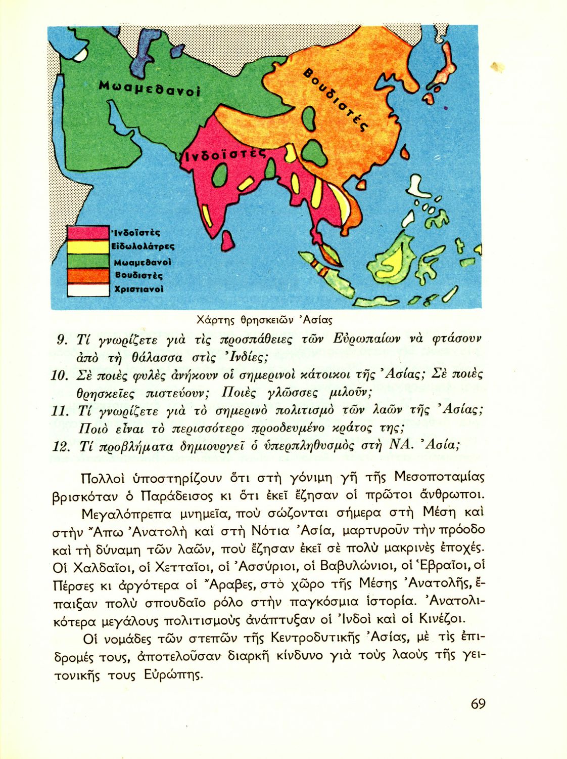 Σχολικό εγχειρίδιο Γεωγραφίας που εξετάζει ενδεικτικές χώρες και περιοχές από τις πέντε ηπείρους εκτός της Ευρώπης από γεωφυσική και οικονομική πλευρά. Φέρει το σύμβολο της δικτατορίας.