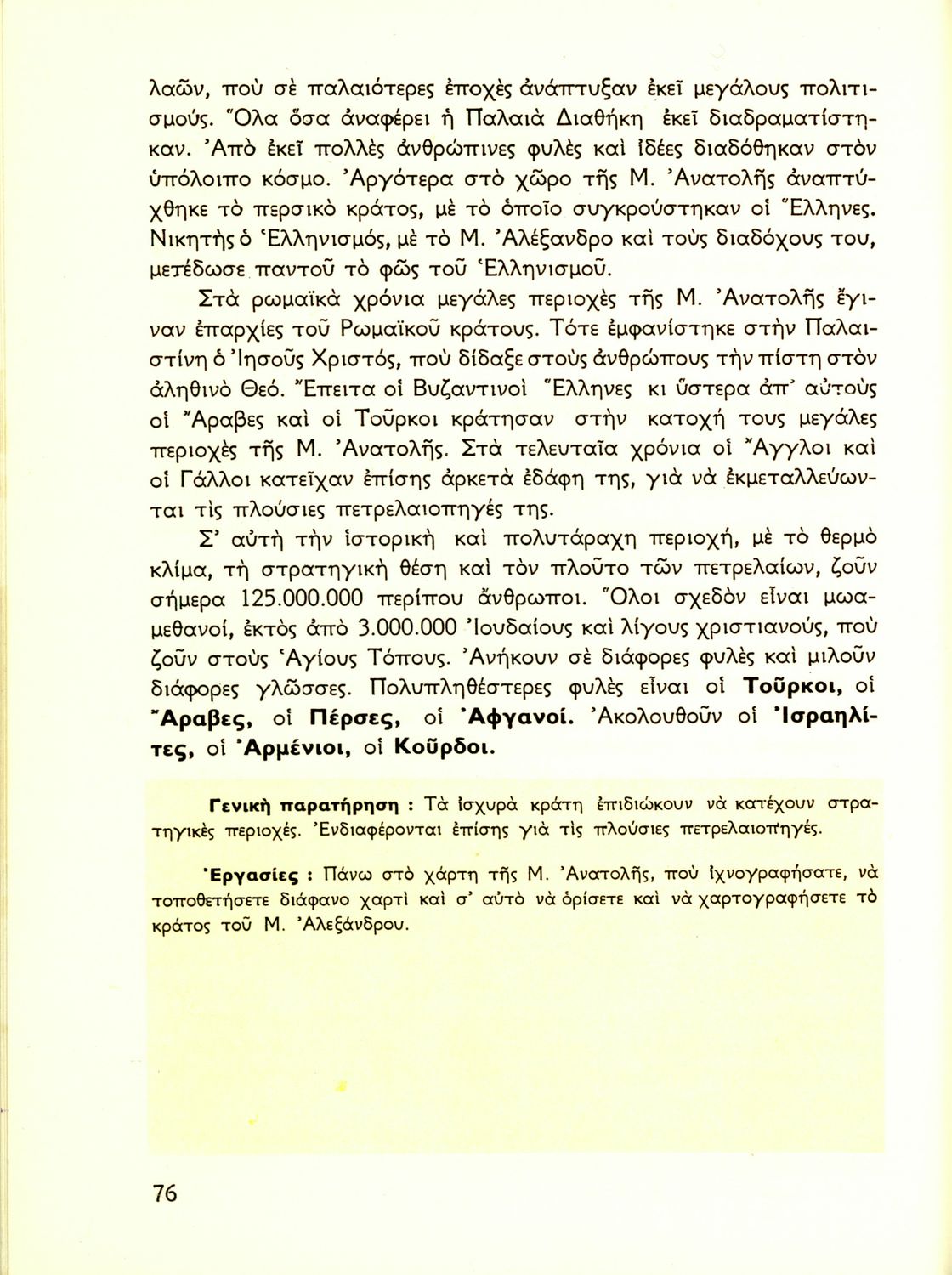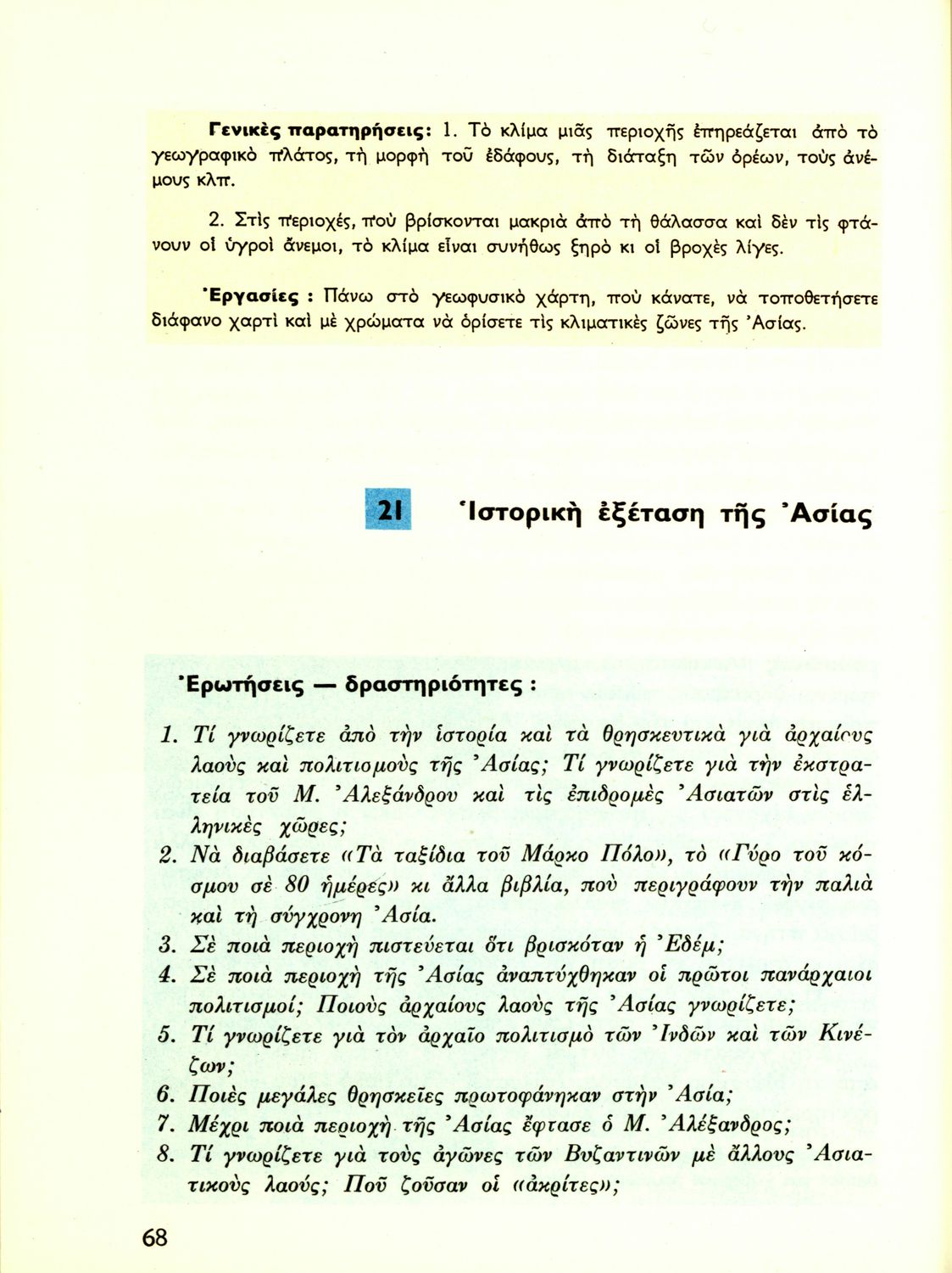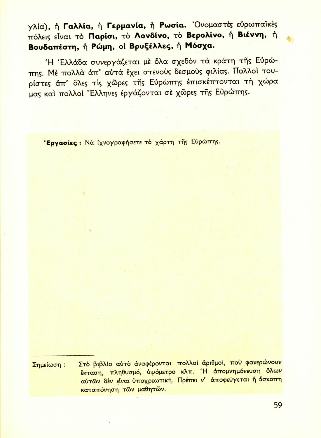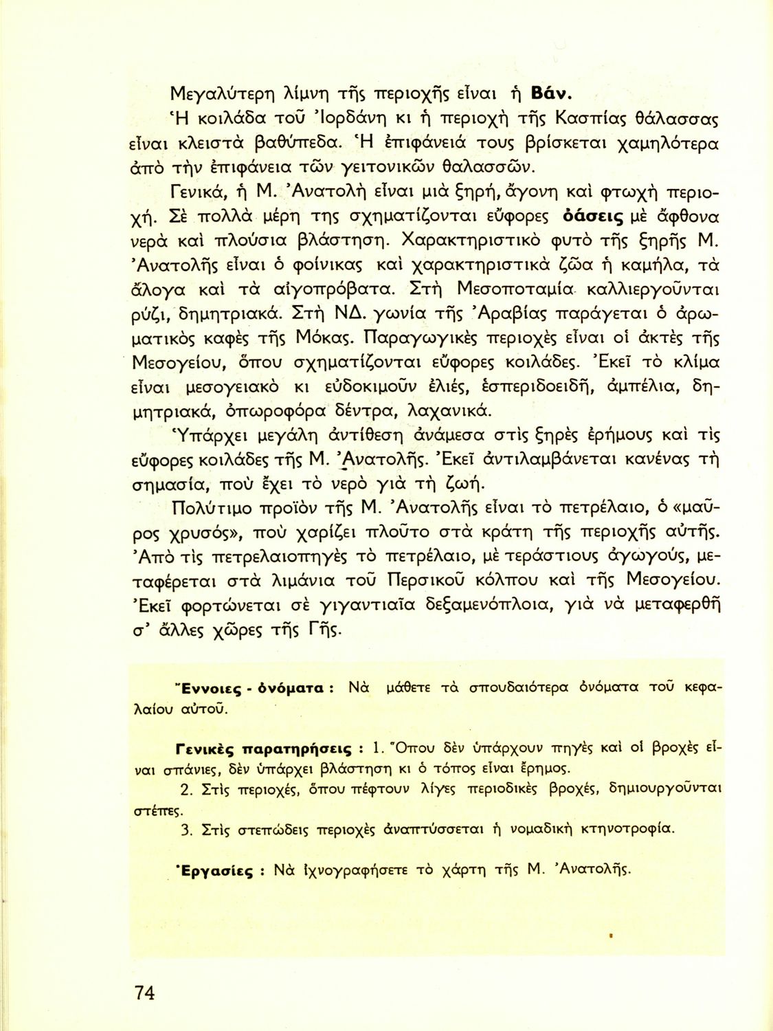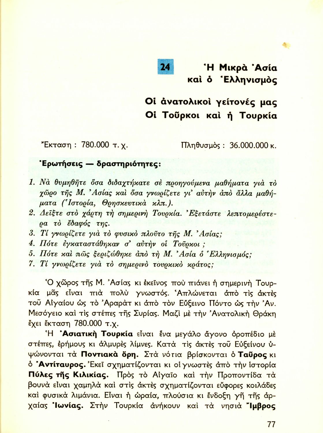 Σχολικό εγχειρίδιο Γεωγραφίας που εξετάζει ενδεικτικές χώρες και περιοχές από τις πέντε ηπείρους εκτός της Ευρώπης από γεωφυσική και οικονομική πλευρά. Φέρει το σύμβολο της δικτατορίας.
