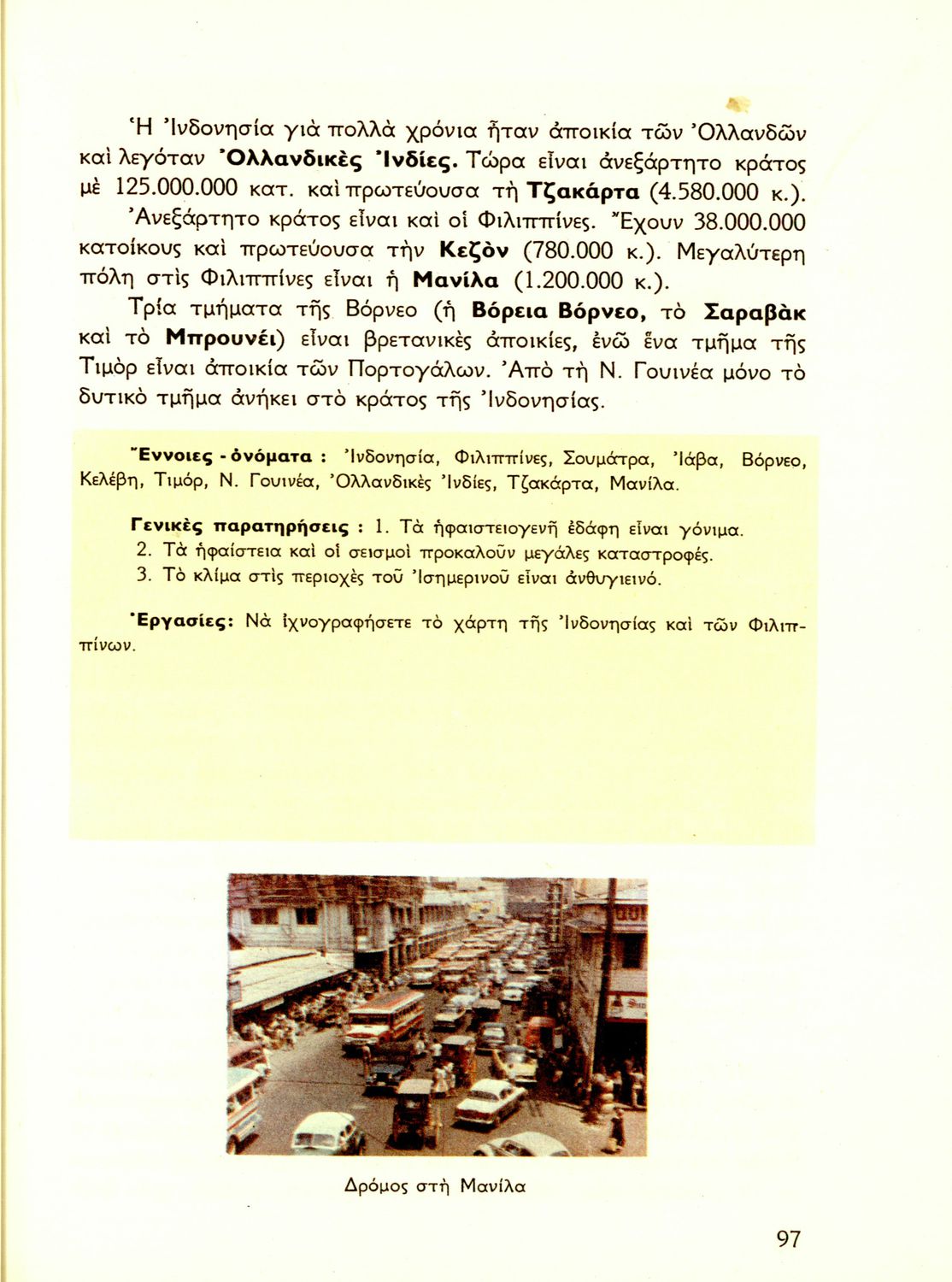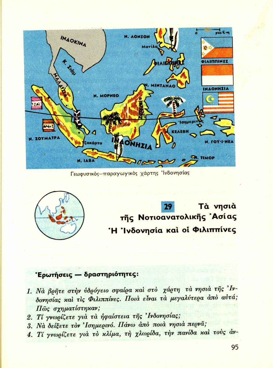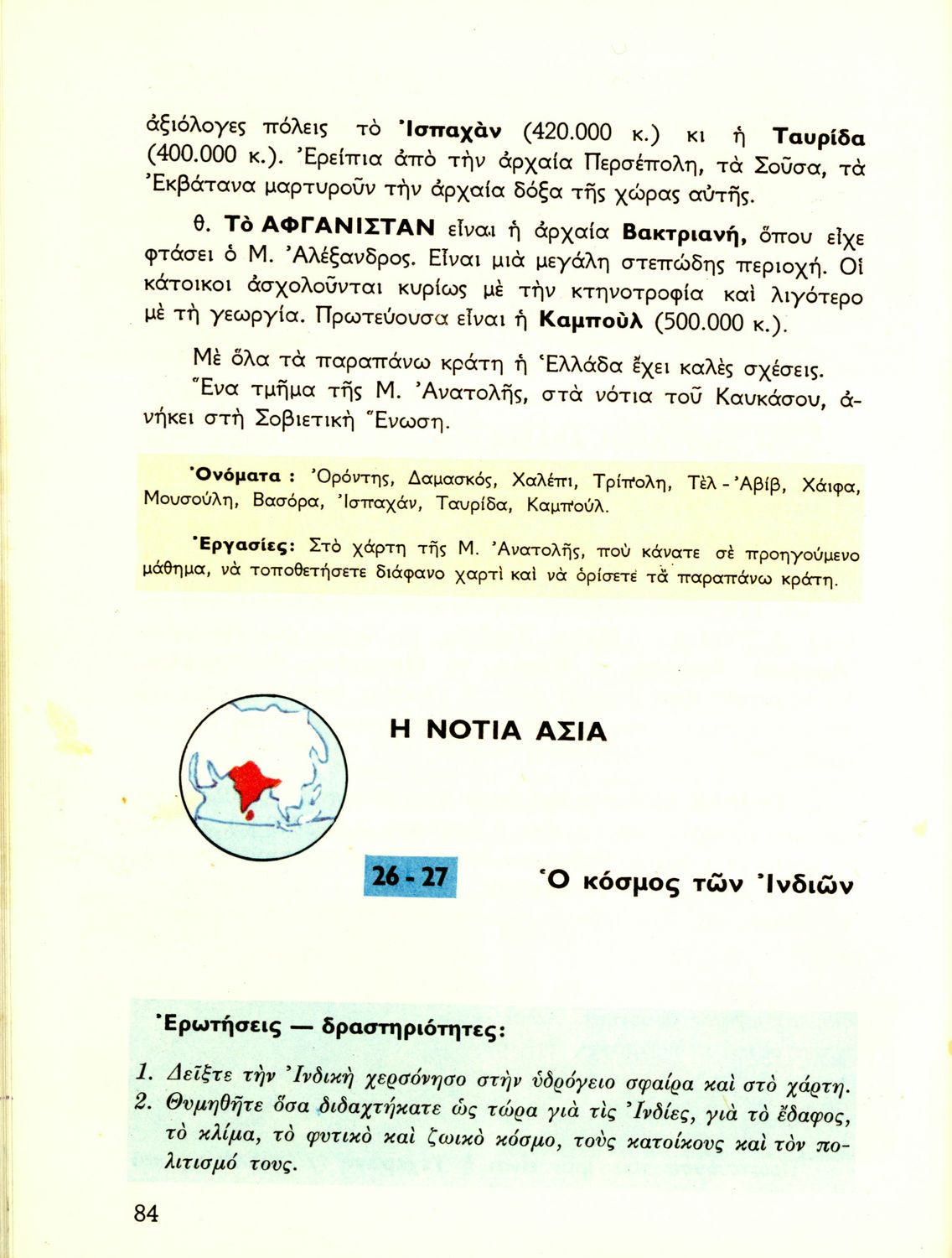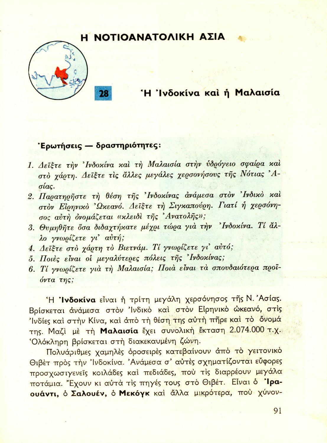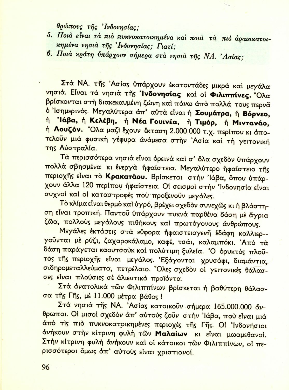 Σχολικό εγχειρίδιο Γεωγραφίας που εξετάζει ενδεικτικές χώρες και περιοχές από τις πέντε ηπείρους εκτός της Ευρώπης από γεωφυσική και οικονομική πλευρά. Φέρει το σύμβολο της δικτατορίας.