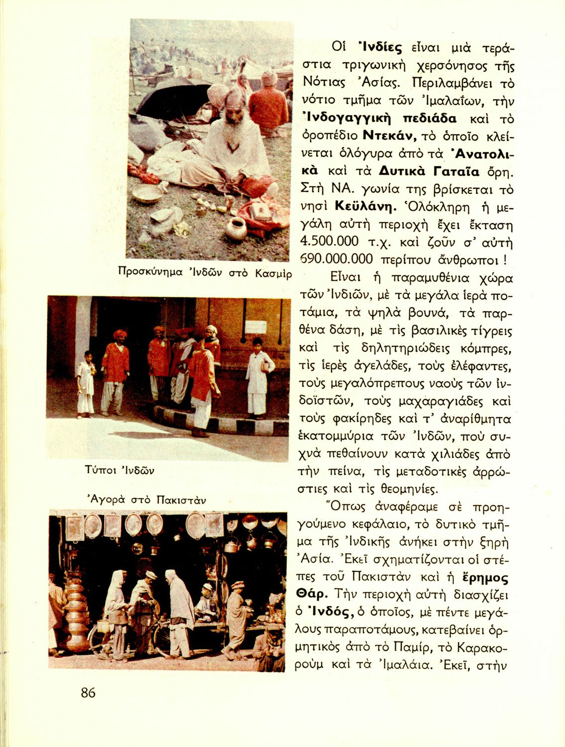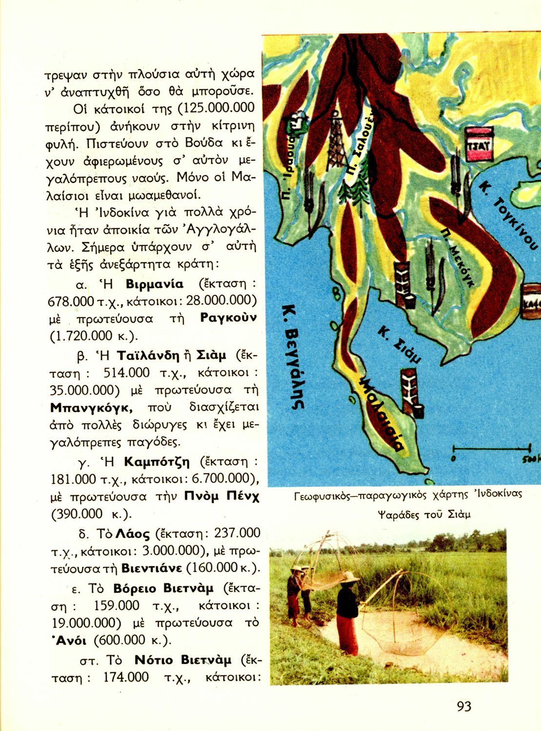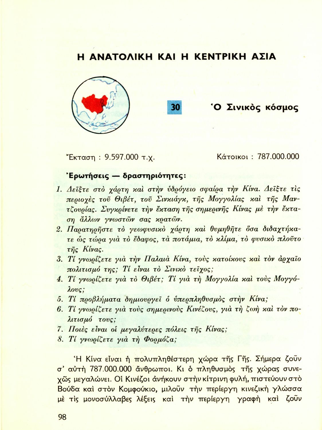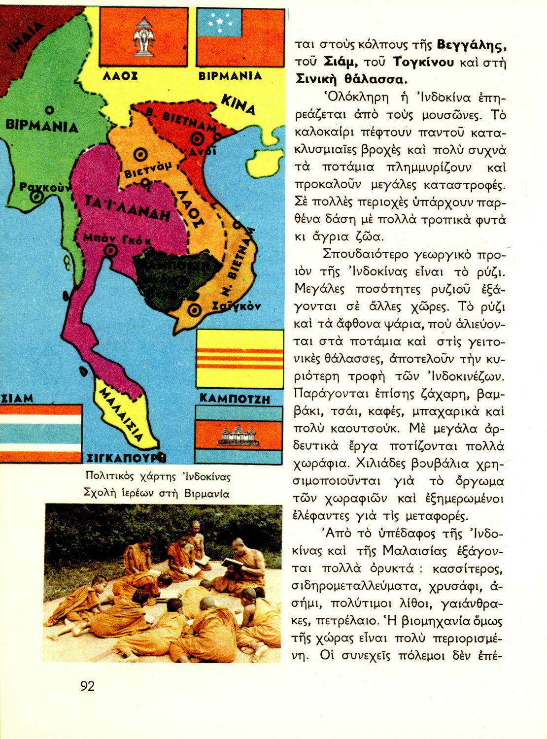 Σχολικό εγχειρίδιο Γεωγραφίας που εξετάζει ενδεικτικές χώρες και περιοχές από τις πέντε ηπείρους εκτός της Ευρώπης από γεωφυσική και οικονομική πλευρά. Φέρει το σύμβολο της δικτατορίας.