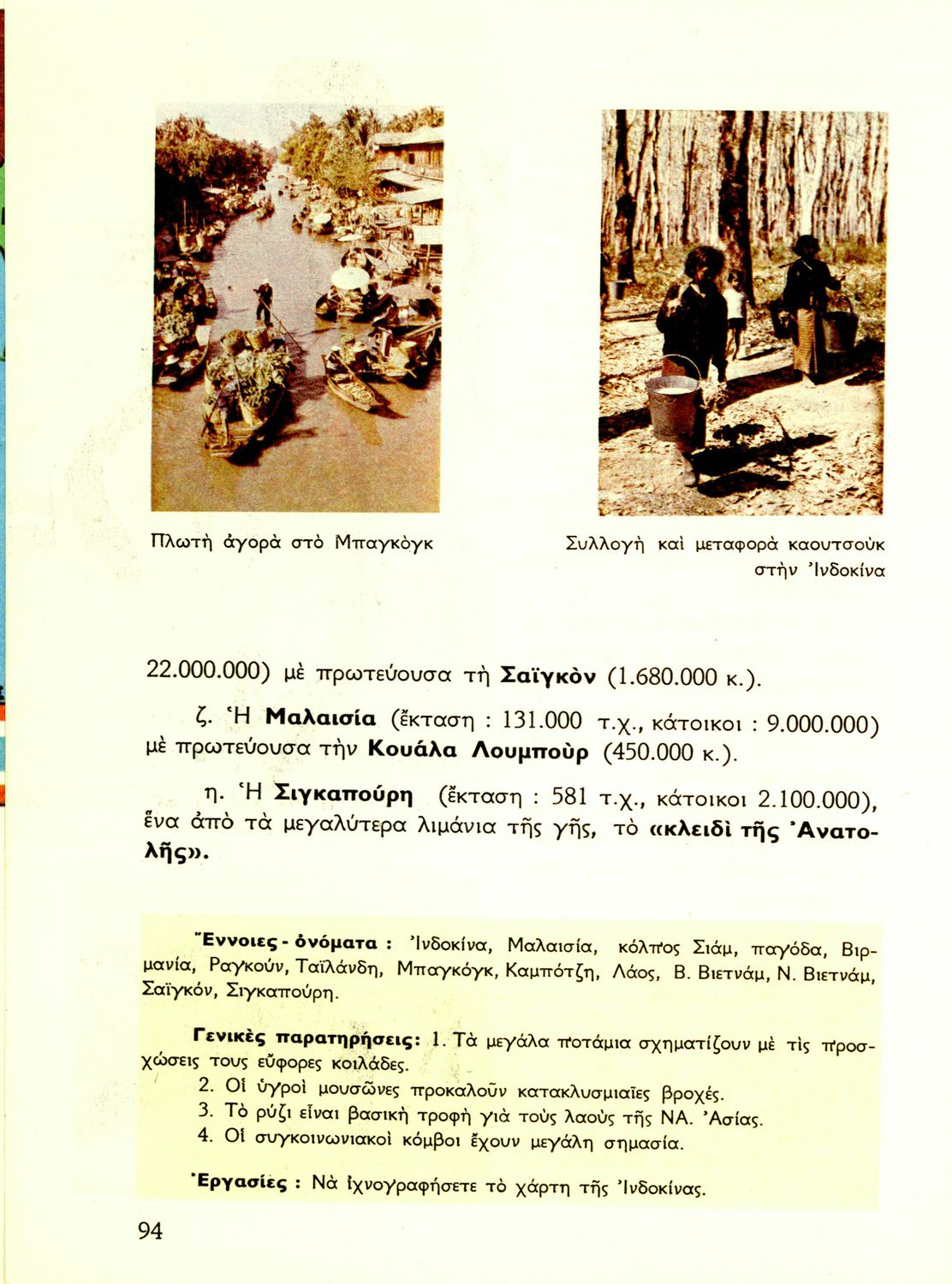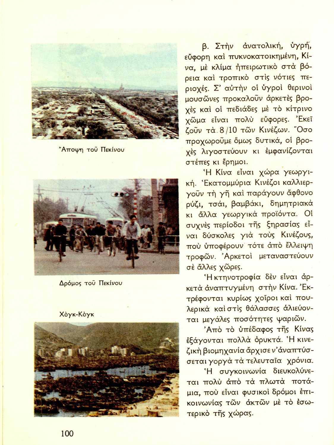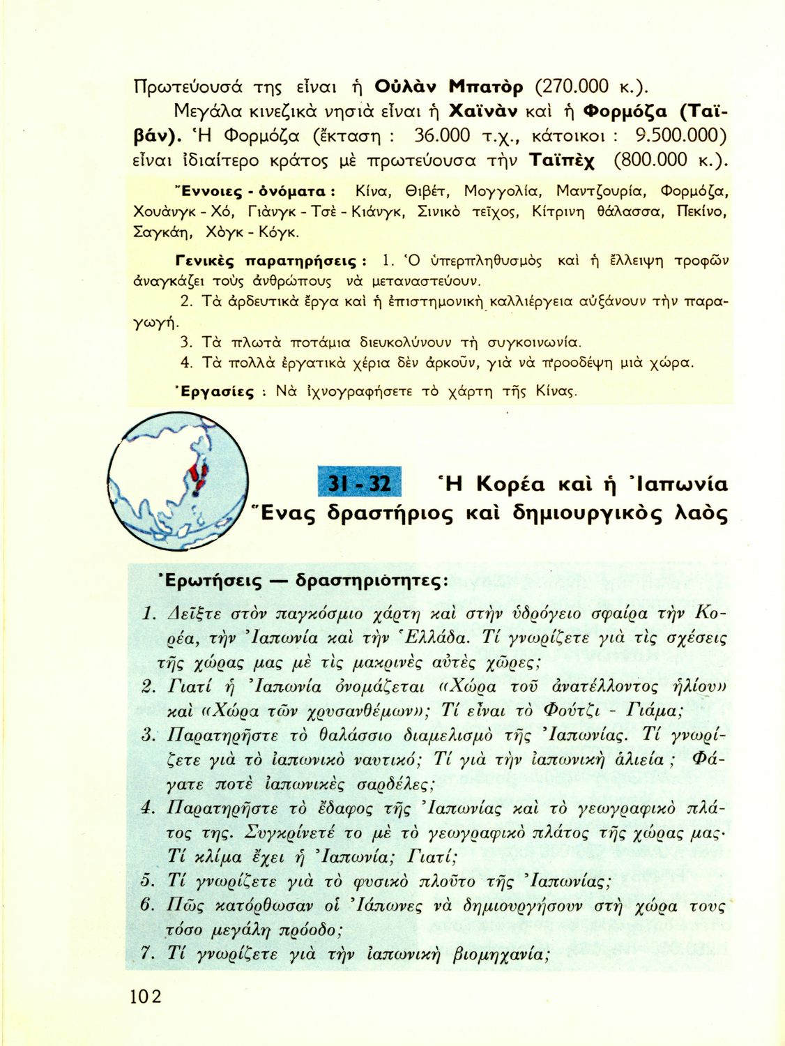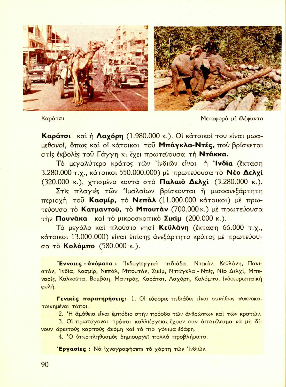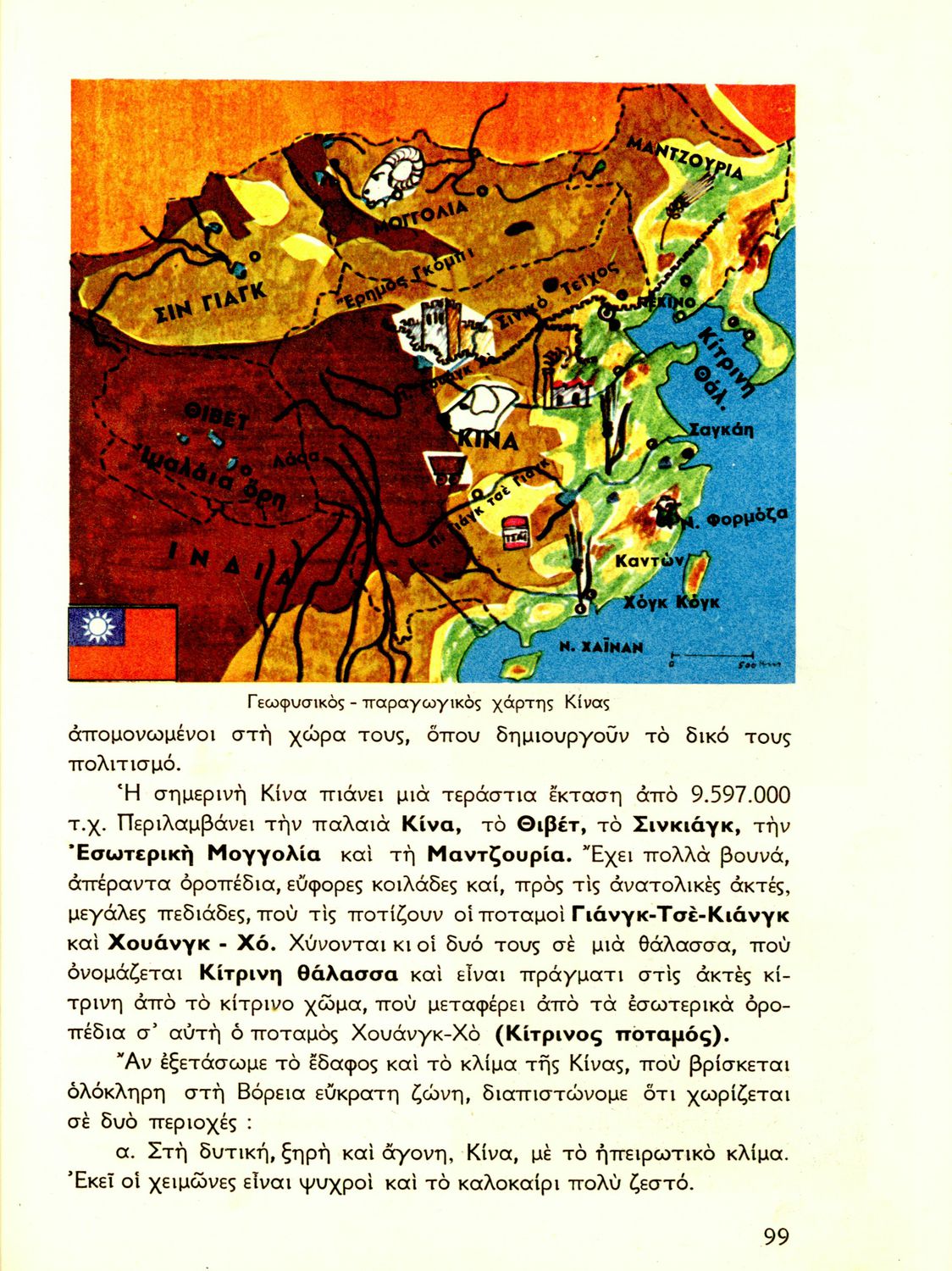 Σχολικό εγχειρίδιο Γεωγραφίας που εξετάζει ενδεικτικές χώρες και περιοχές από τις πέντε ηπείρους εκτός της Ευρώπης από γεωφυσική και οικονομική πλευρά. Φέρει το σύμβολο της δικτατορίας.