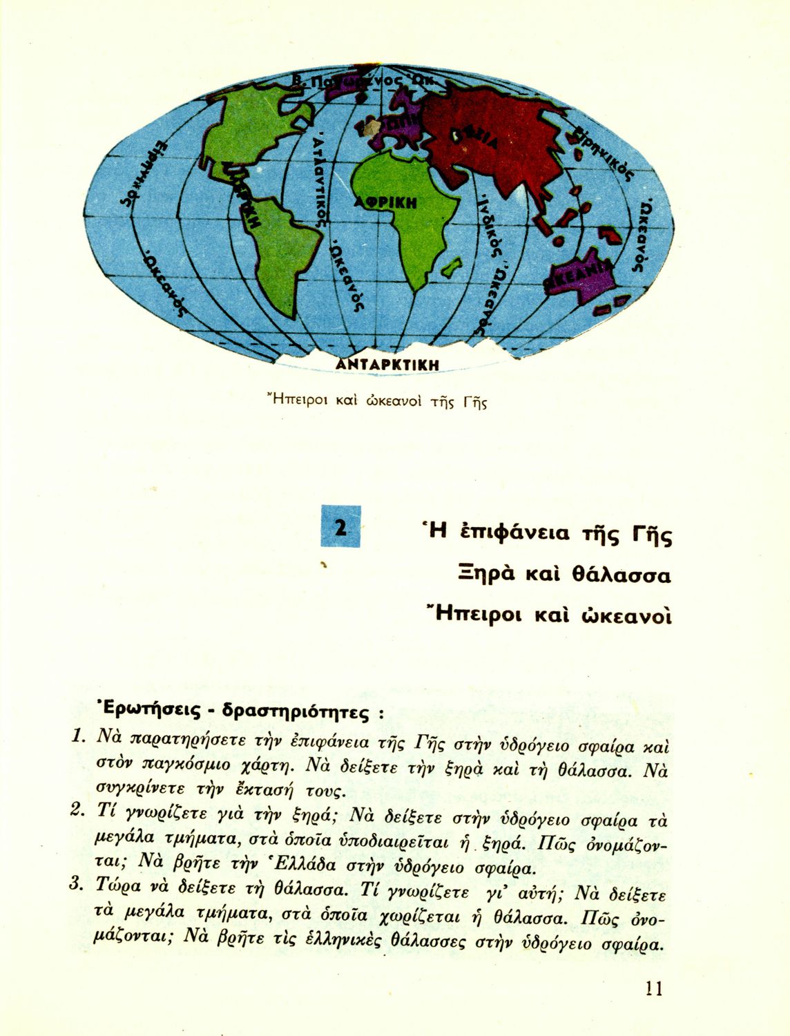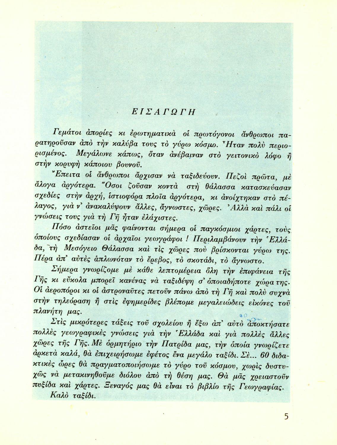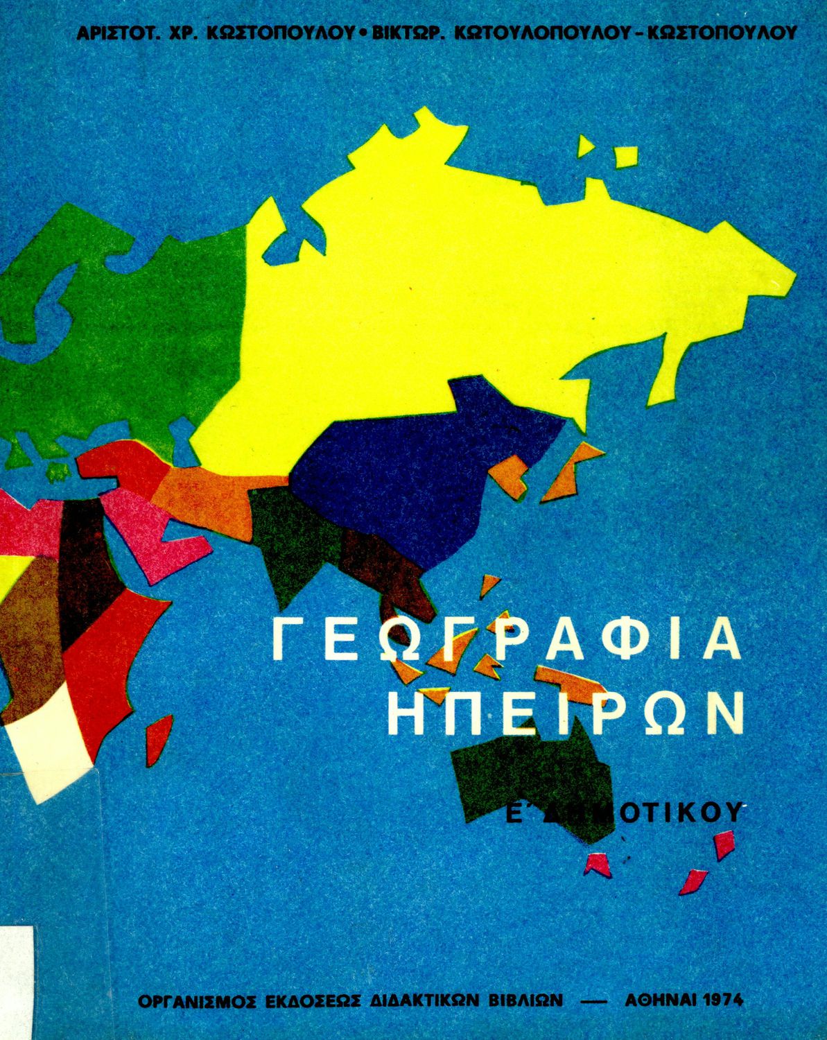 Σχολικό εγχειρίδιο Γεωγραφίας Ε΄ Δημοτικού που περιλαμβάνει στοιχεία φυσικής, μαθηματικής και πολιτικής γεωγραφίας και εστιάζει στη γεωμορφολογική και γεωπολιτική κατάσταση της Ασίας, της Αφρικής, της Αμερικής, Ανταρκτικής και της Ωκεανίας.