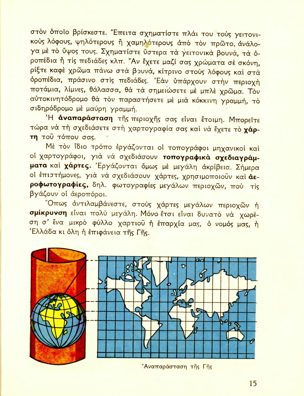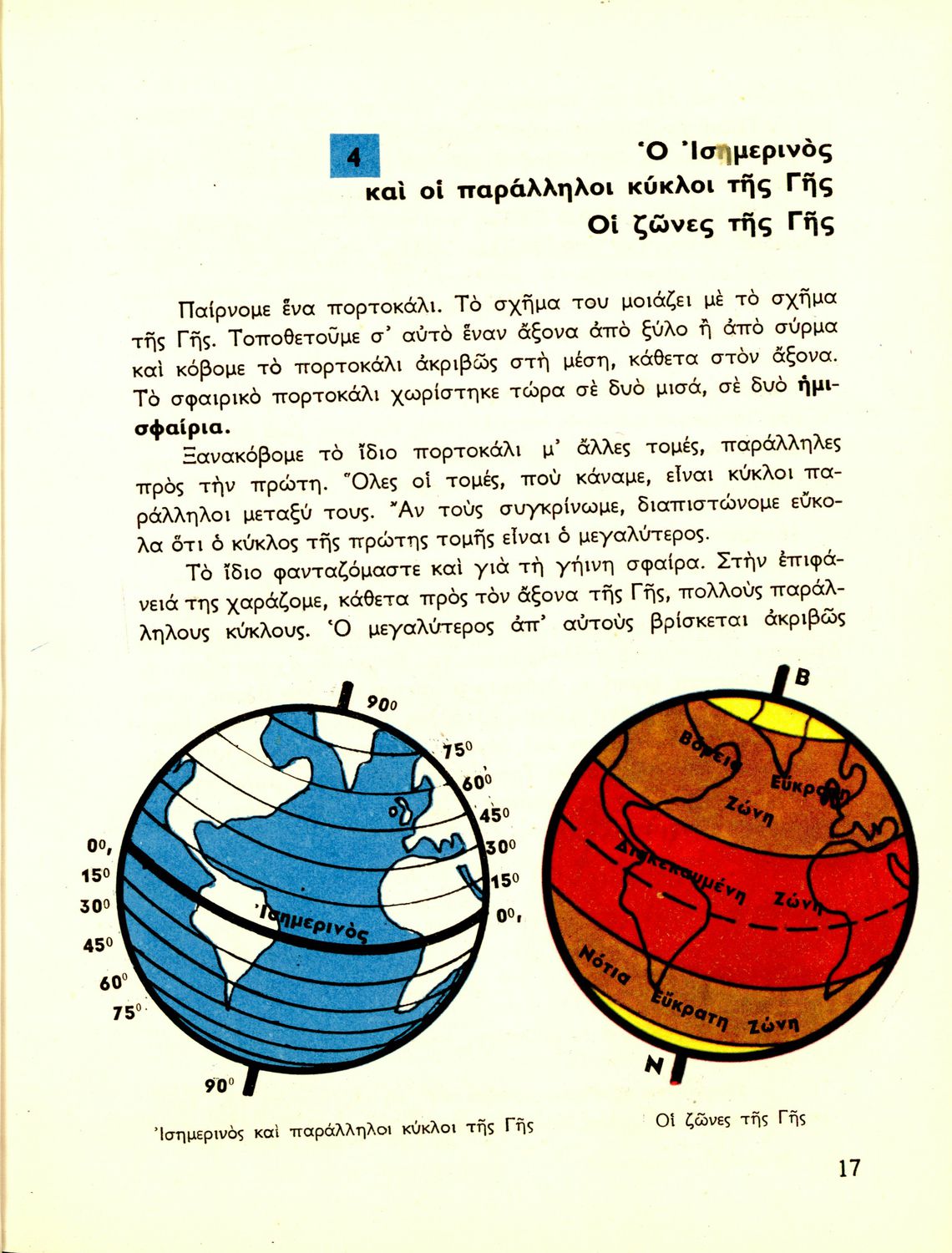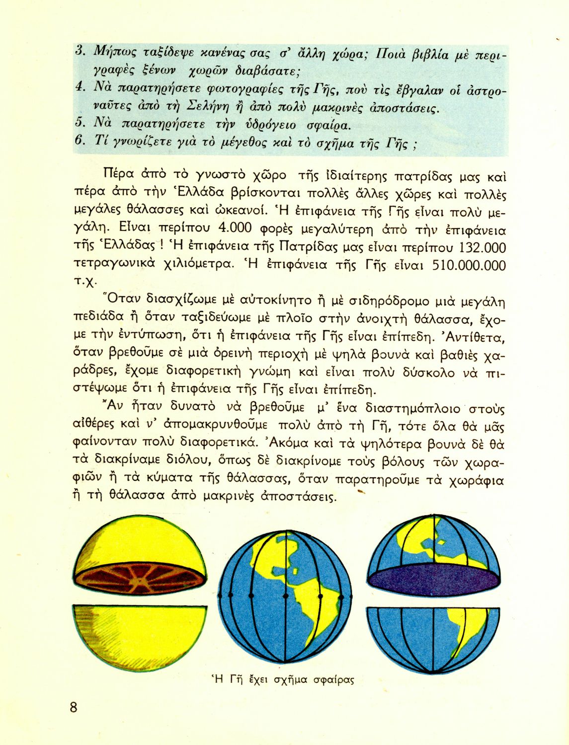 Σχολικό εγχειρίδιο Γεωγραφίας Ε΄ Δημοτικού που περιλαμβάνει στοιχεία φυσικής, μαθηματικής και πολιτικής γεωγραφίας και εστιάζει στη γεωμορφολογική και γεωπολιτική κατάσταση της Ασίας, της Αφρικής, της Αμερικής, Ανταρκτικής και της Ωκεανίας.