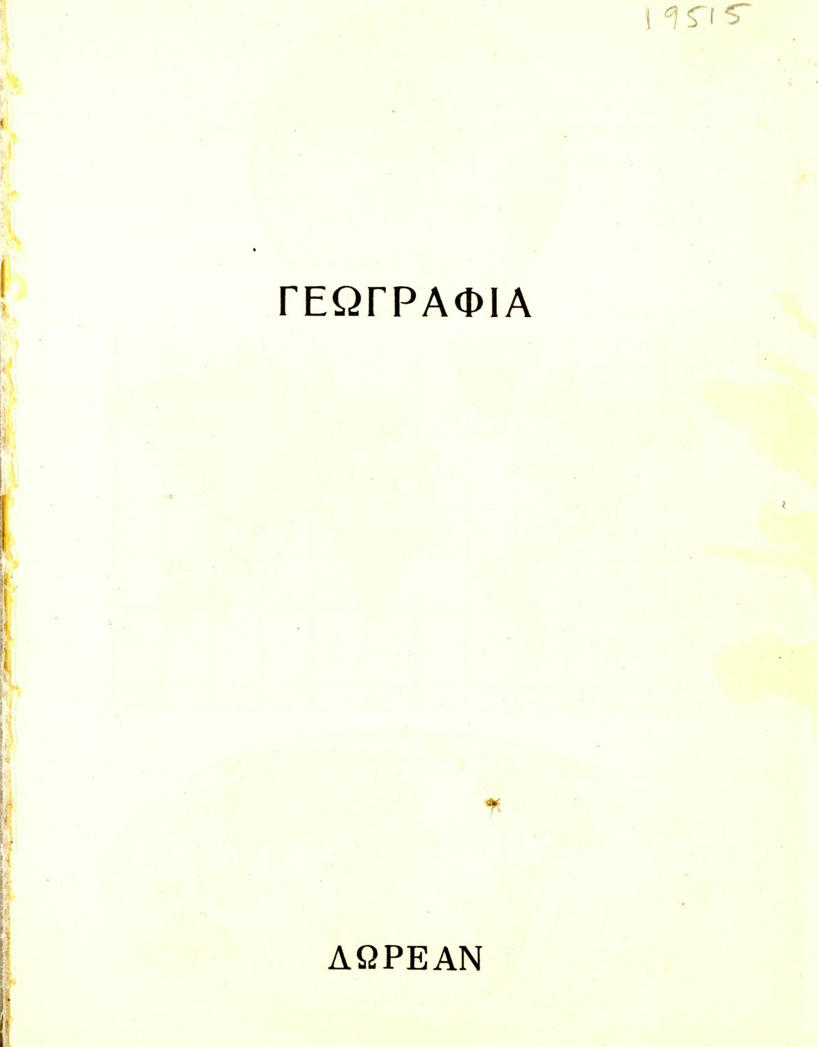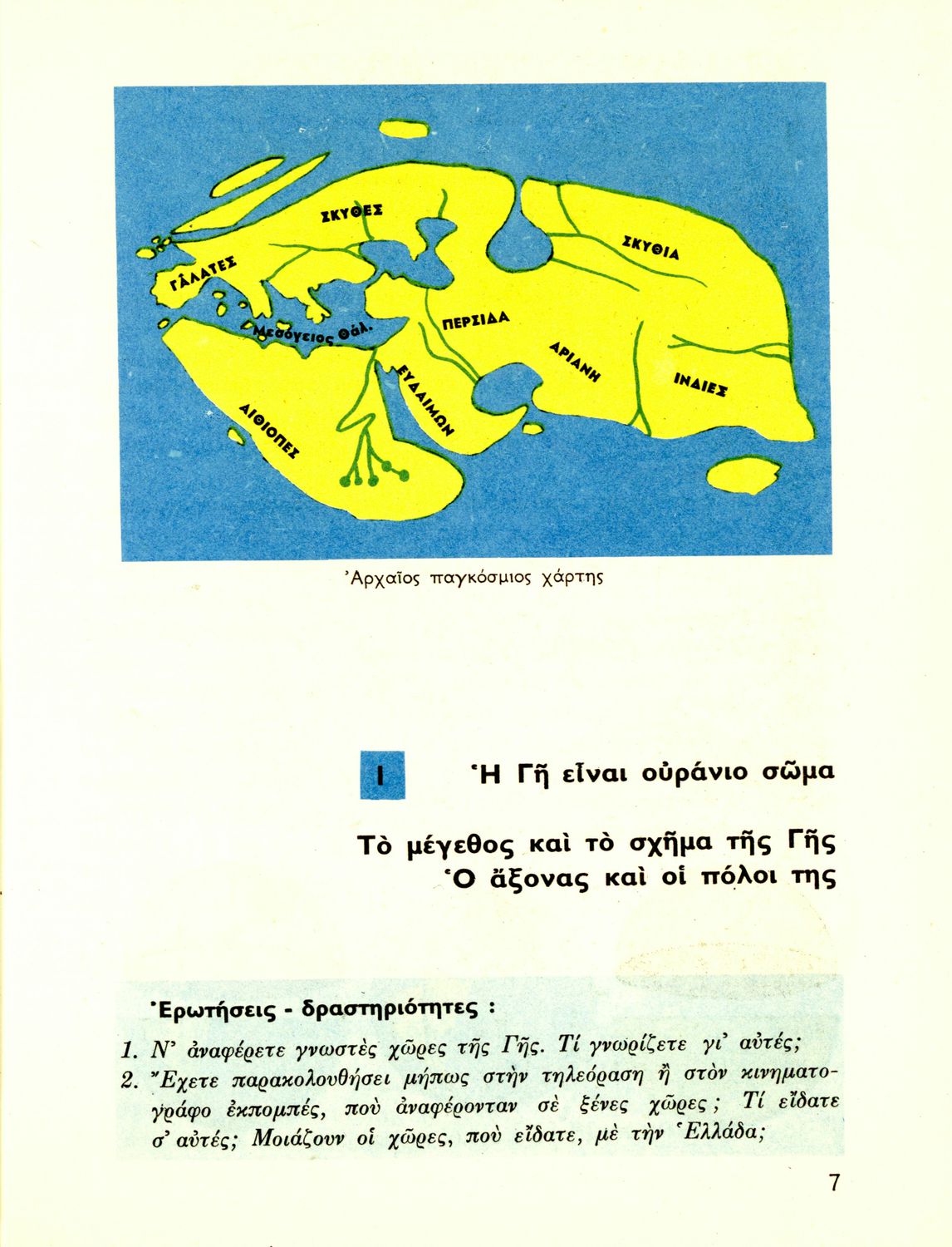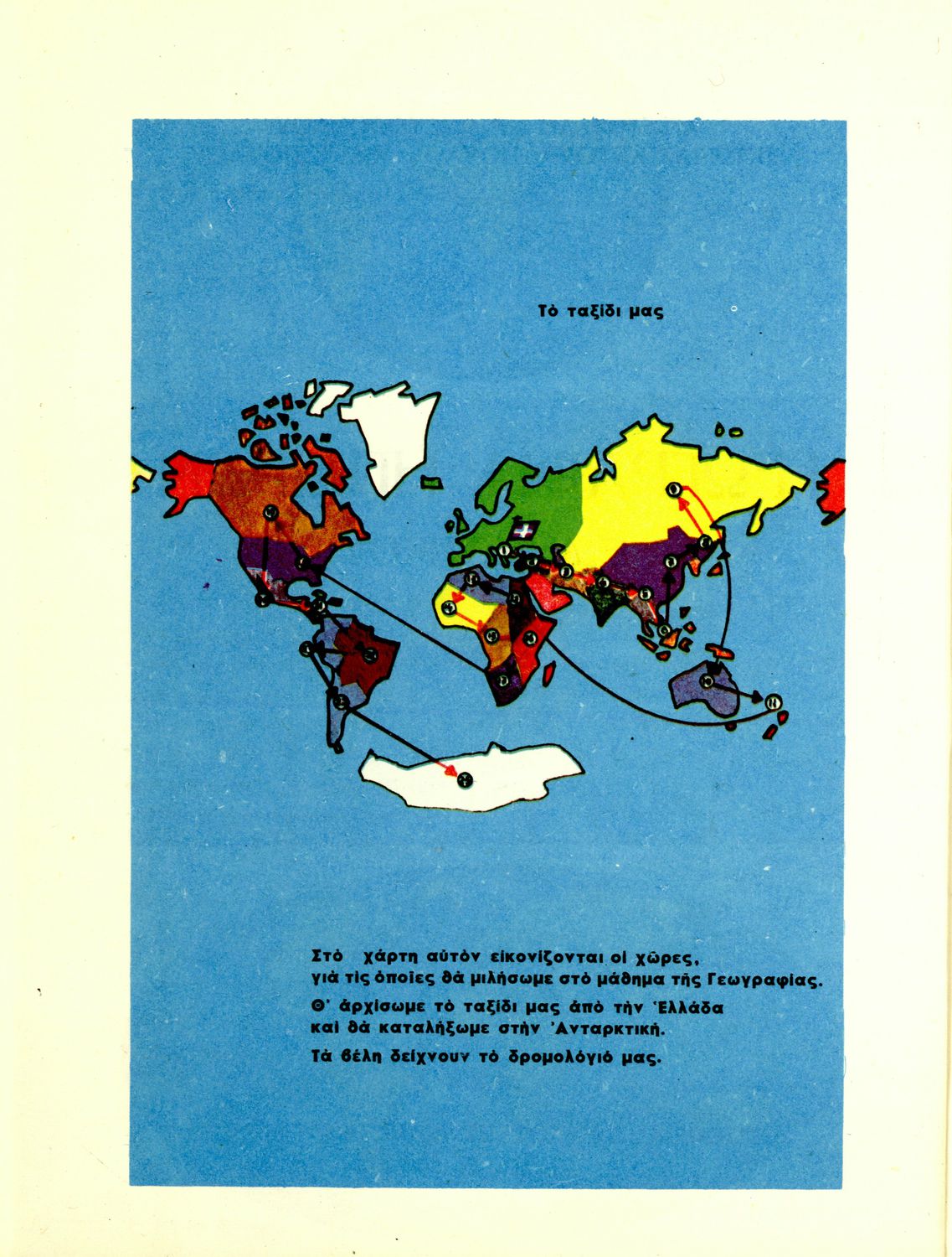 Σχολικό εγχειρίδιο Γεωγραφίας που εξετάζει ενδεικτικές χώρες και περιοχές από τις πέντε ηπείρους εκτός της Ευρώπης από γεωφυσική και οικονομική πλευρά. Φέρει το σύμβολο της δικτατορίας.