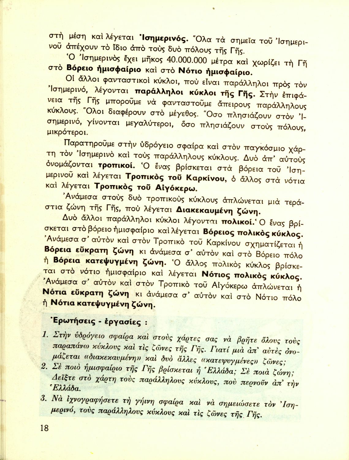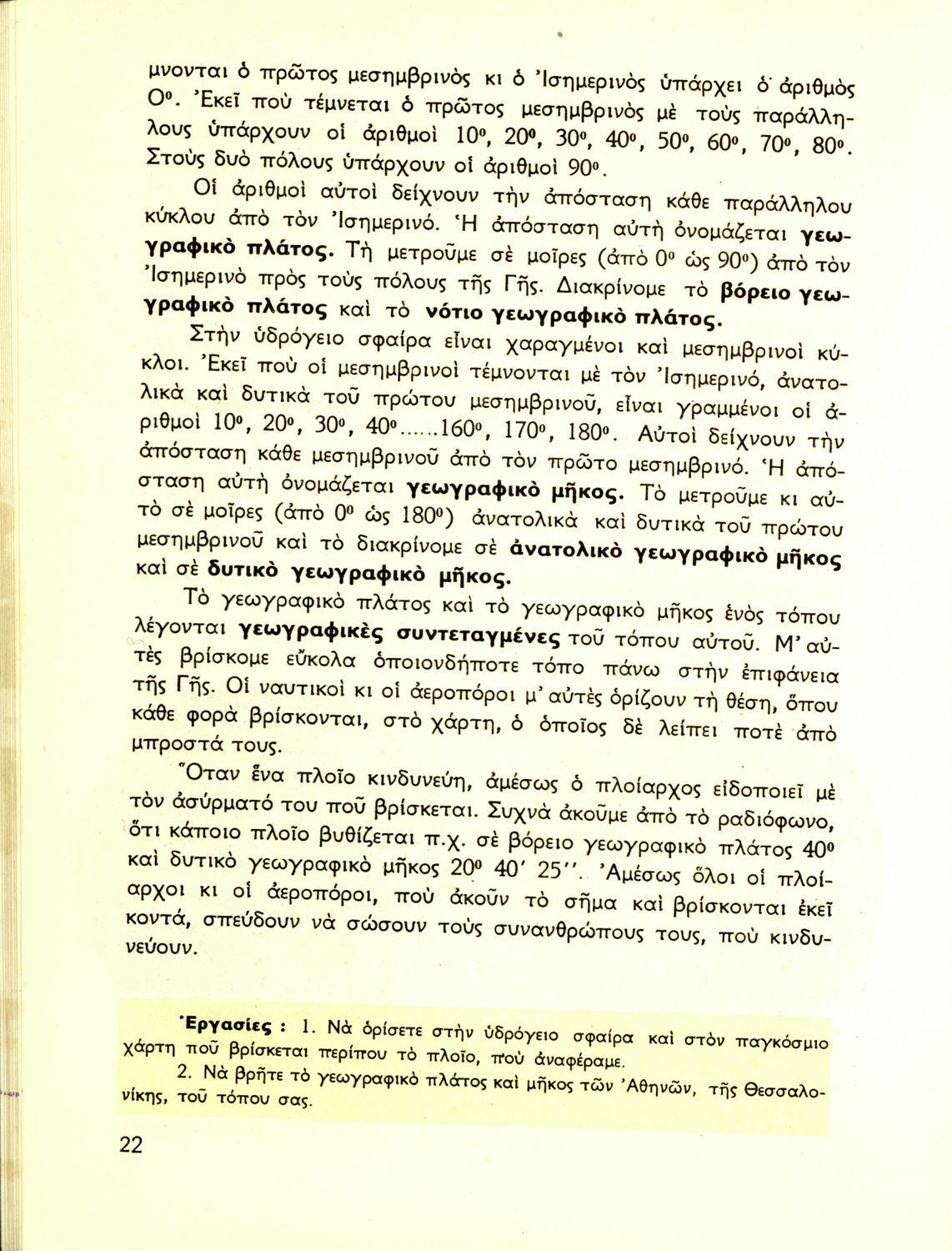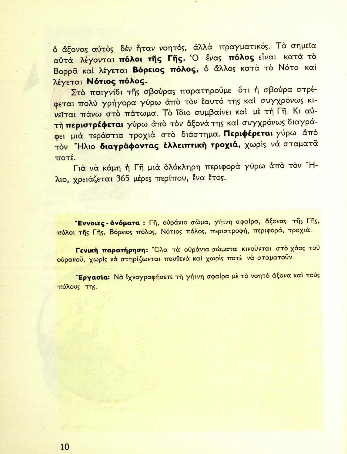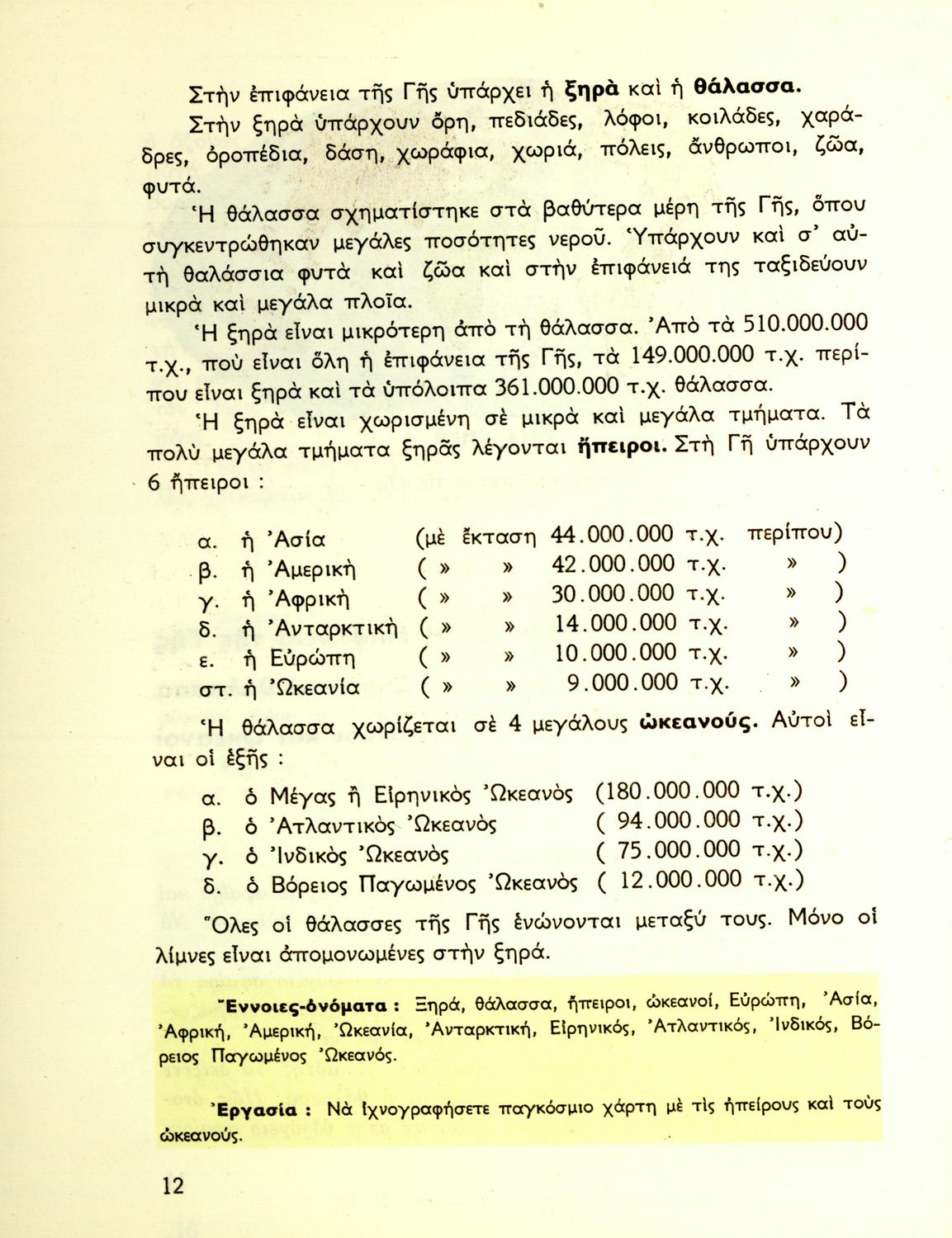Σχολικό εγχειρίδιο Γεωγραφίας που εξετάζει ενδεικτικές χώρες και περιοχές από τις πέντε ηπείρους εκτός της Ευρώπης από γεωφυσική και οικονομική πλευρά. Φέρει το σύμβολο της δικτατορίας.