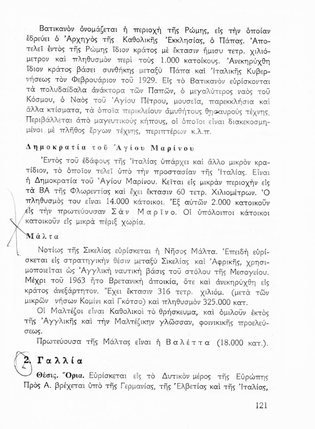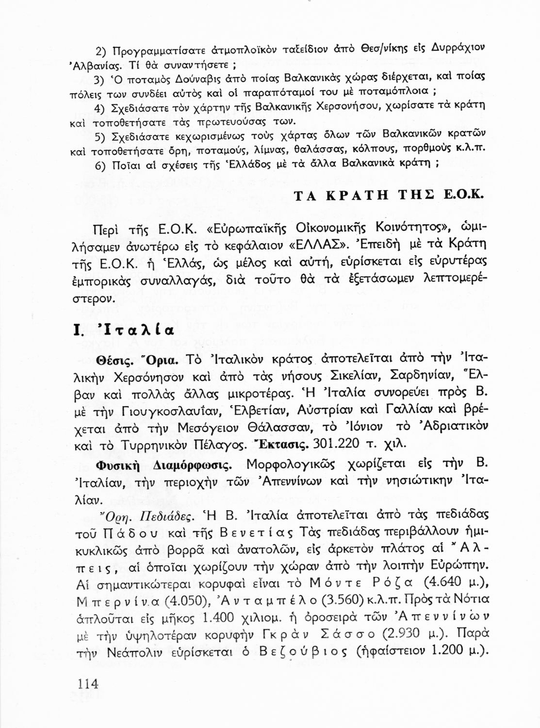 Σχολικό εγχειρίδιο Γεωγραφίας ΣΤ΄ Δημοτικού που περιλαμβάνει στοιχεία γενικής και μαθηματικής γεωγραφίας και εξετάζει από γεωφυσική και πολιτική πλευρά τις χώρες της Ευρώπης. Φέρει το σύμβολο της δικτατορίας.