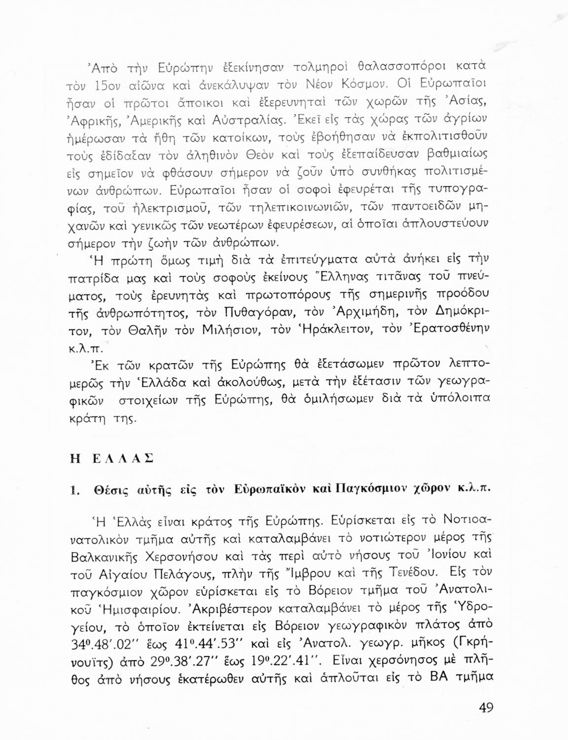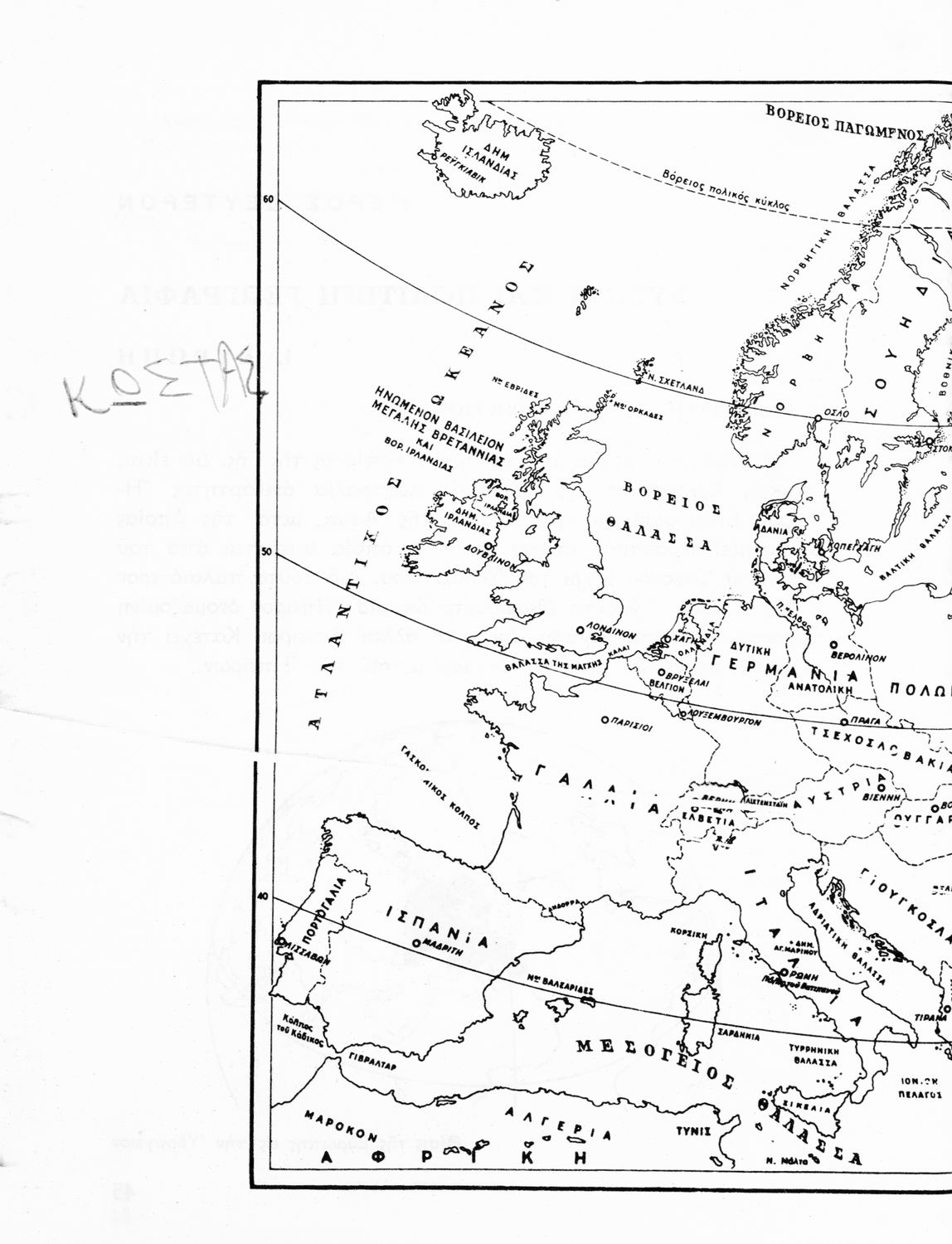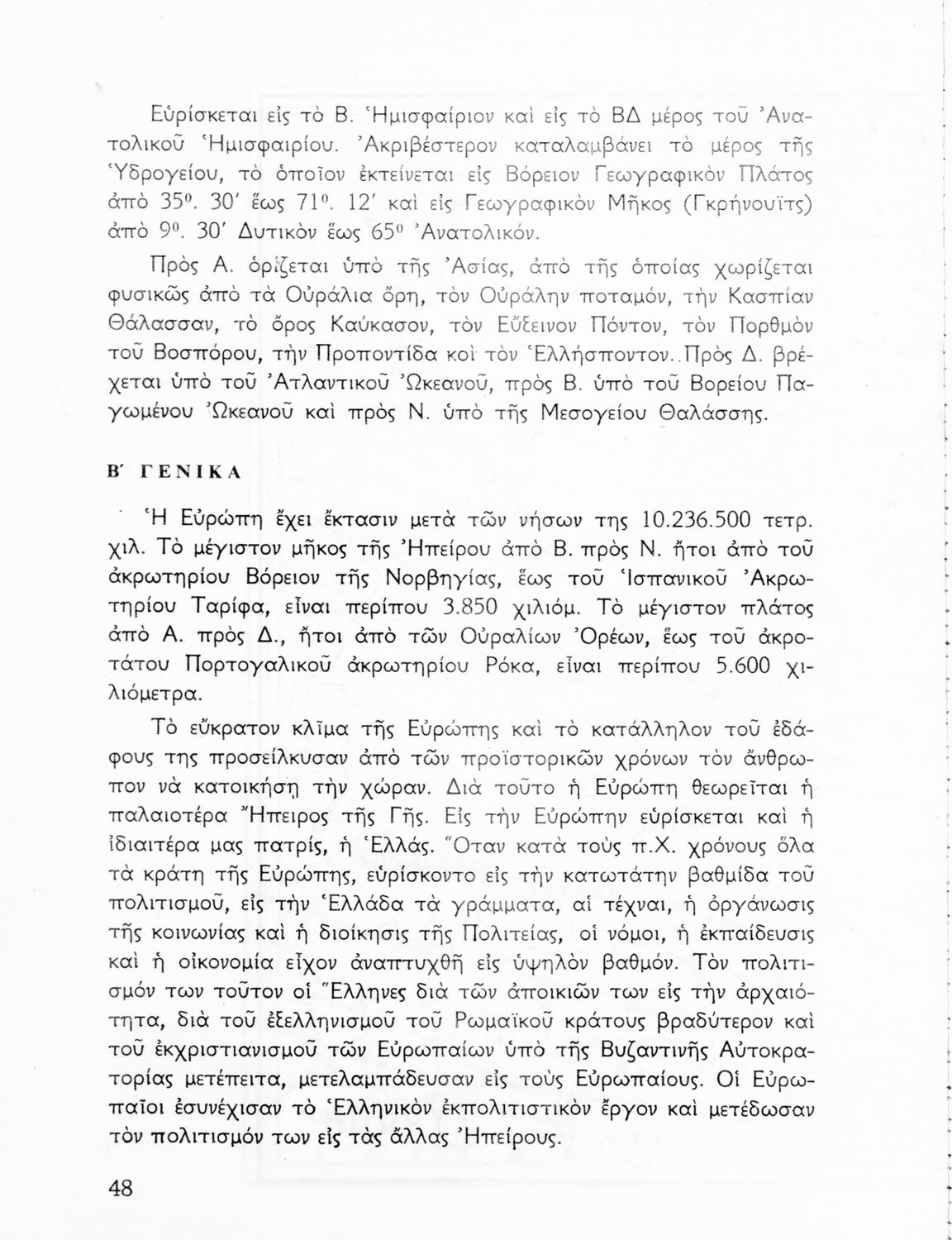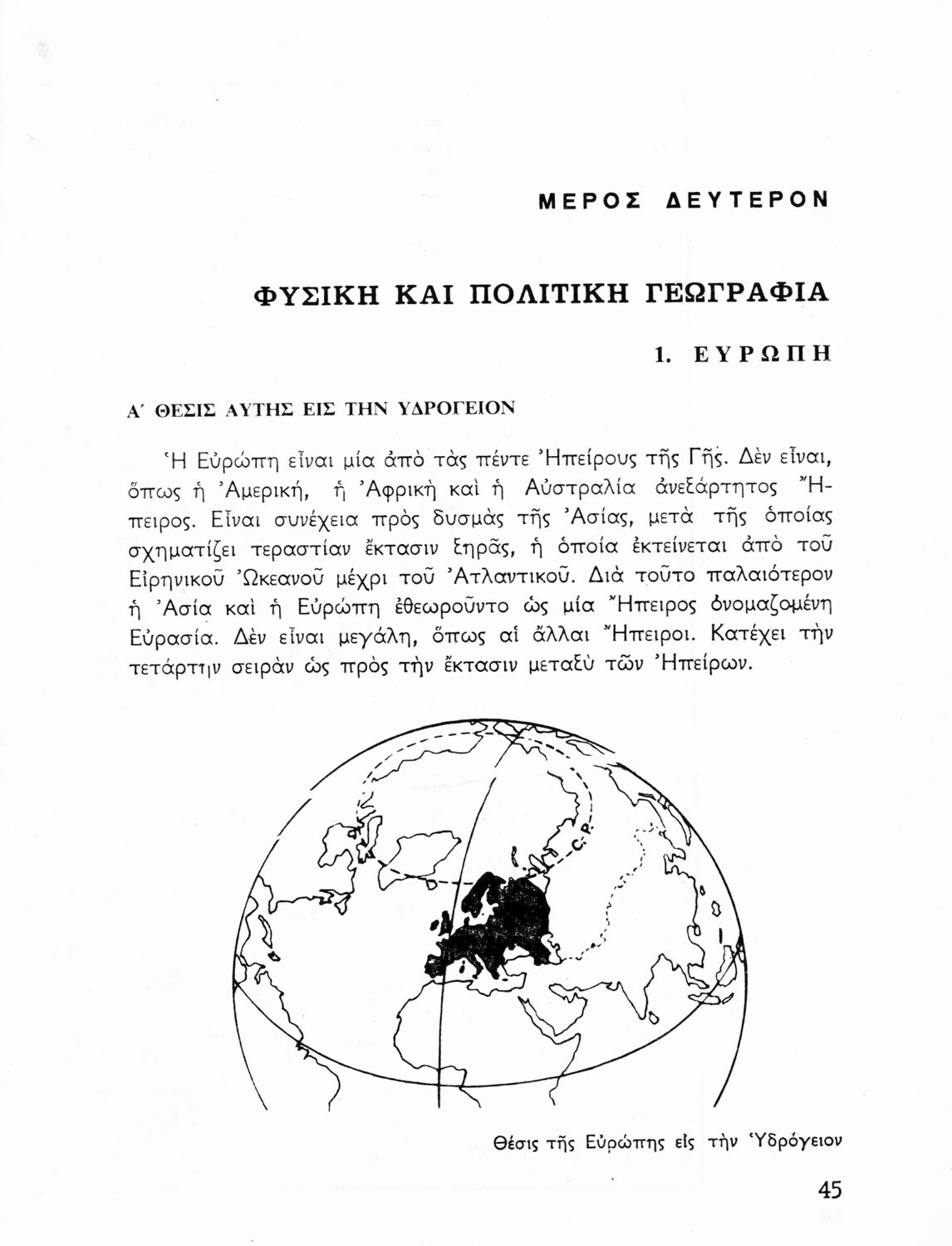 Σχολικό εγχειρίδιο Γεωγραφίας ΣΤ΄ Δημοτικού που περιλαμβάνει στοιχεία γενικής και μαθηματικής γεωγραφίας και εξετάζει από γεωφυσική και πολιτική πλευρά τις χώρες της Ευρώπης. Φέρει το σύμβολο της δικτατορίας.