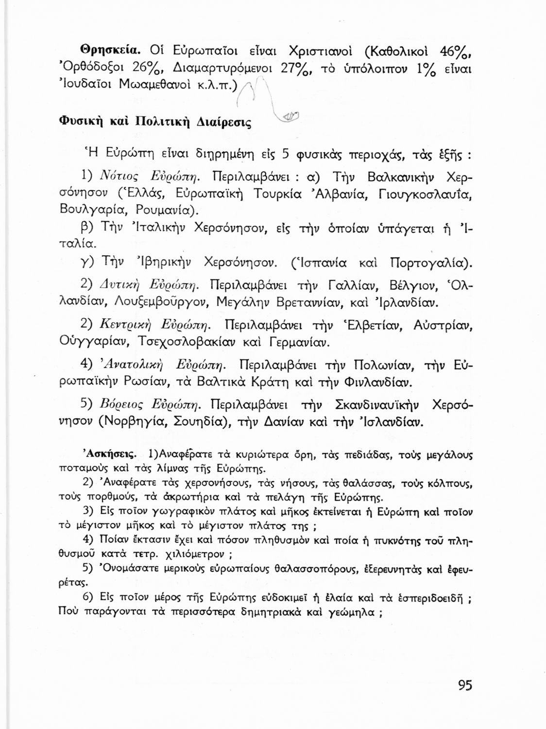 Σχολικό εγχειρίδιο Γεωγραφίας ΣΤ΄ Δημοτικού που περιλαμβάνει στοιχεία γενικής και μαθηματικής γεωγραφίας και εξετάζει από γεωφυσική και πολιτική πλευρά τις χώρες της Ευρώπης. Φέρει το σύμβολο της δικτατορίας.