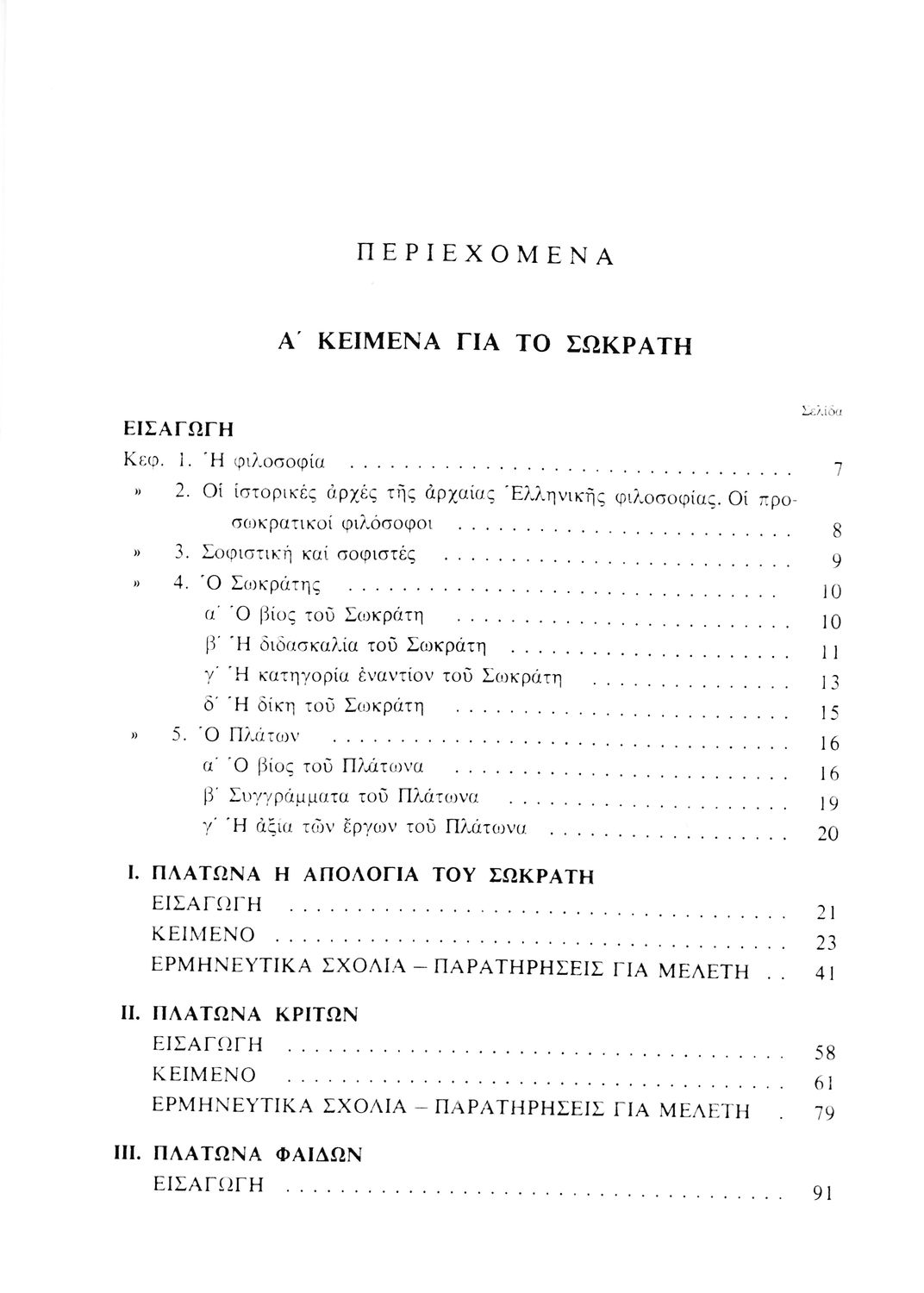 Σχολικό εγχειρίδιο Φιλοσοφίας Γ΄ Γυμνασίου που περιλαμβάνει τα κείμενα Απολογία του Σωκράτη, Κρίτων, Φαίδων και Ηθικά Νικομάχεια. Περιέχει εισαγωγικά και ερμηνευτικά σχόλια και παρατηρήσεις για μελέτη.