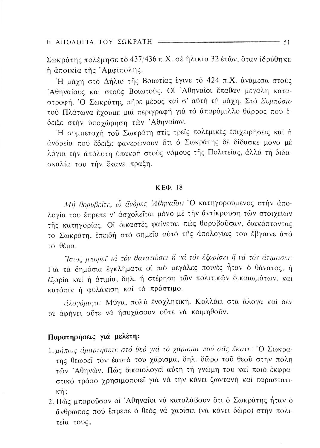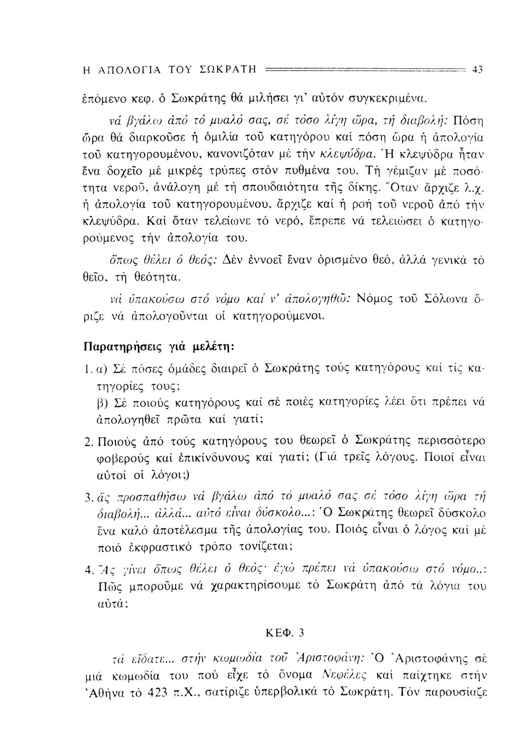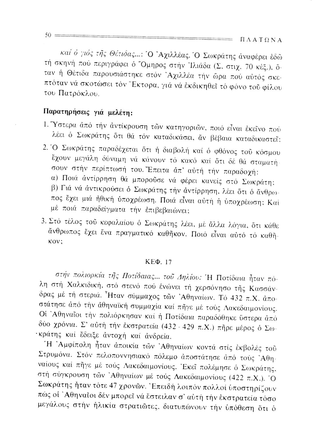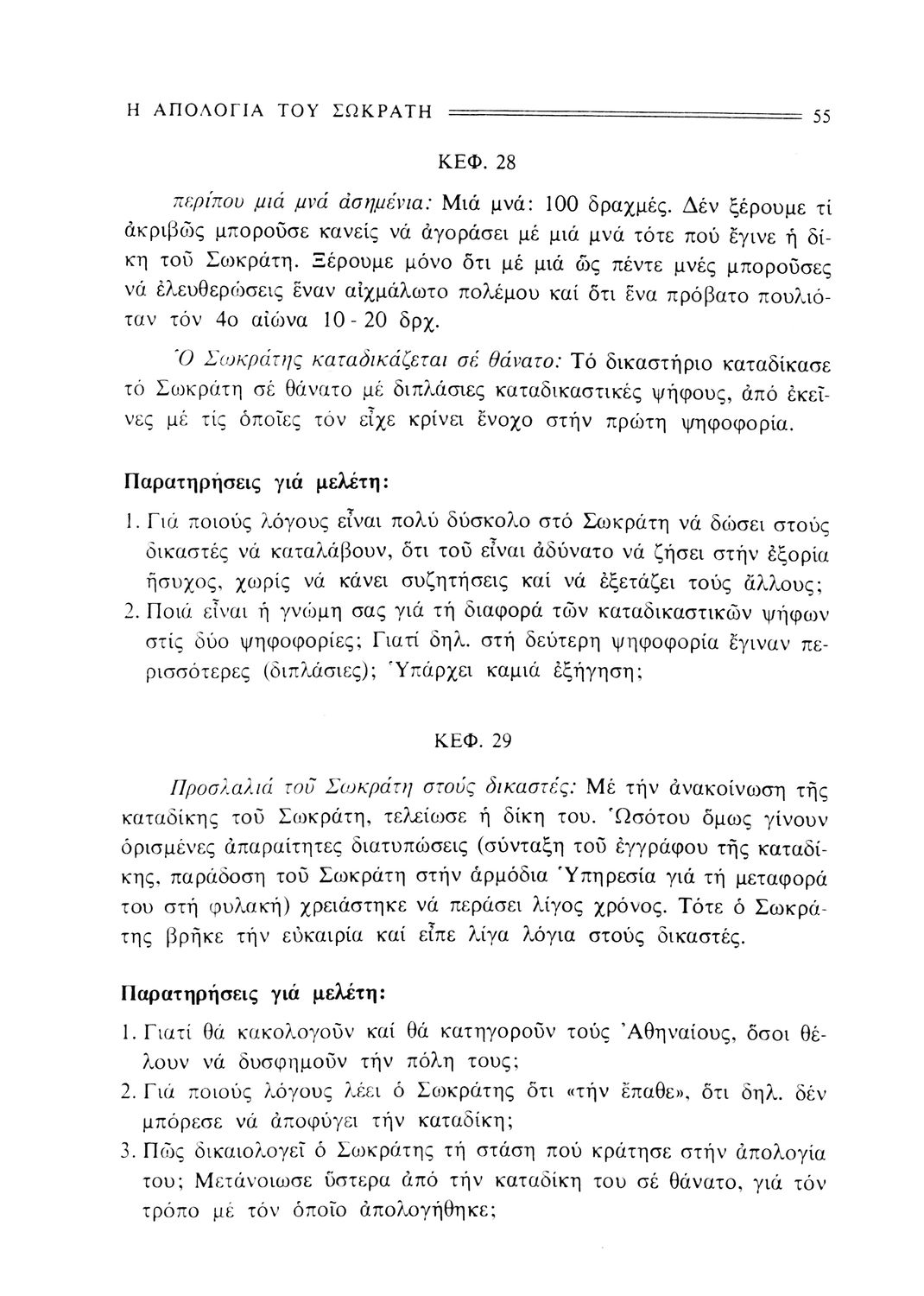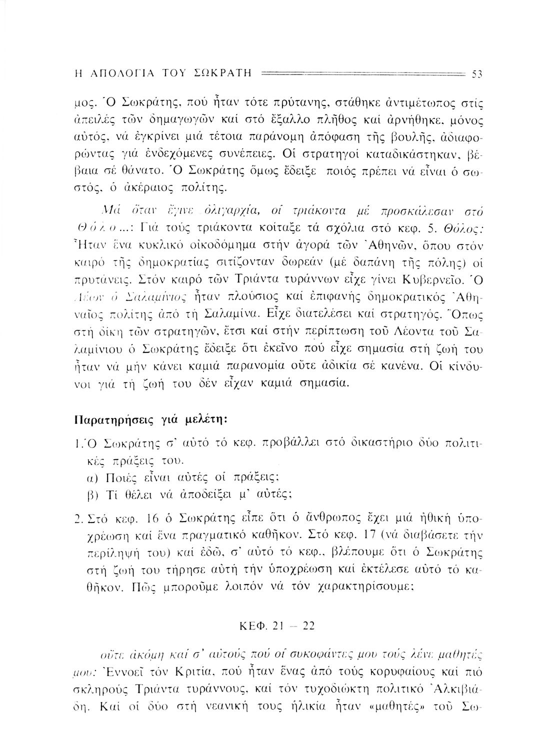Μαθητικό βοήθημα Αρχαίων Ελληνικών Γυμνασίου που περιλαμβάνει τα κείμενα του Πλάτωνα Απολογία Σωκράτους, Κρίτων, Λάχης και πραγματολογικές παρατηρήσεις.