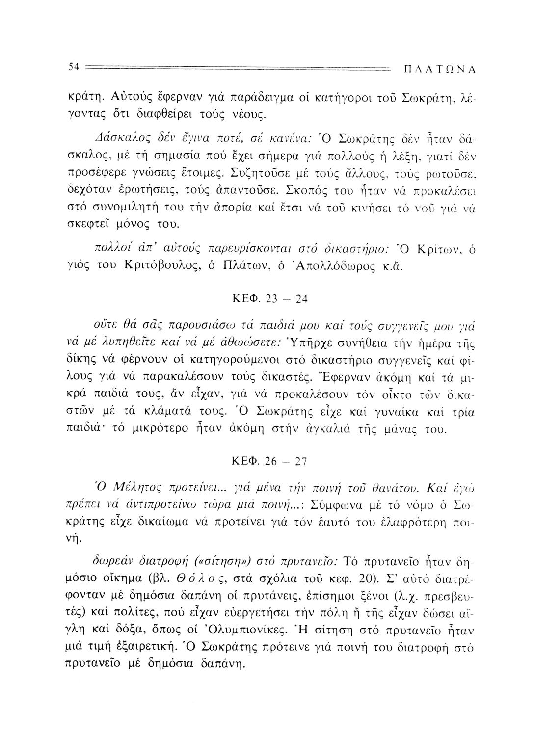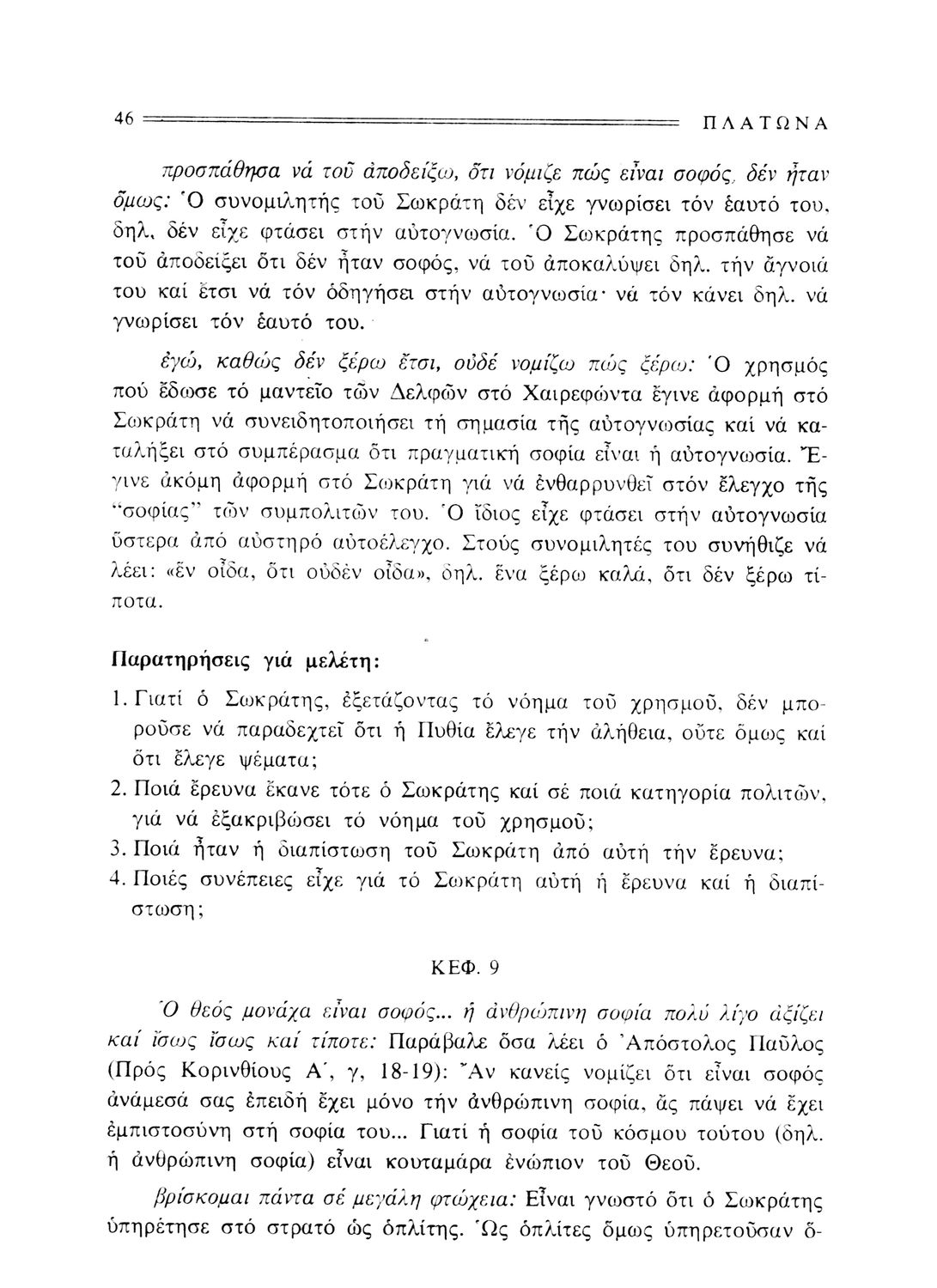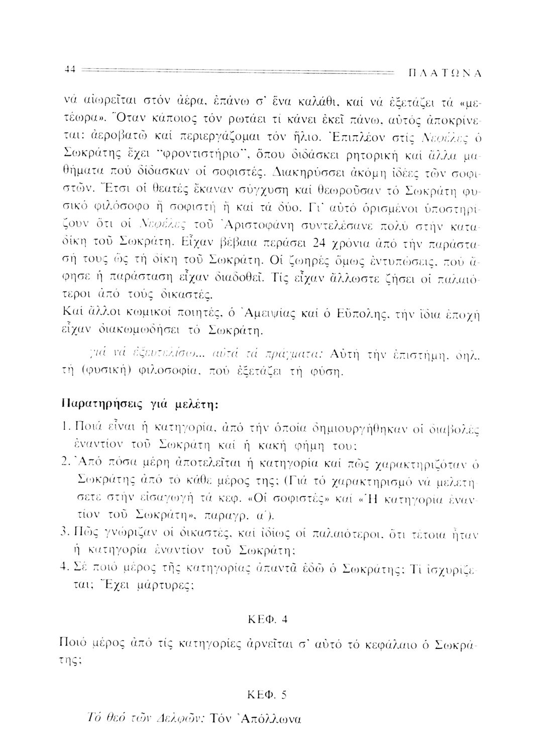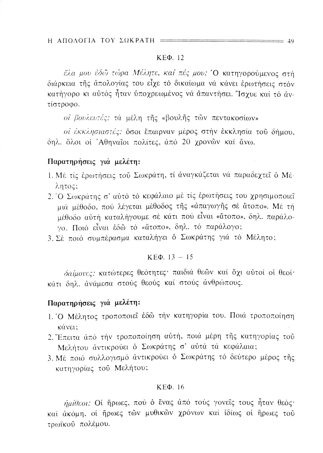 Μαθητικό βοήθημα Αρχαίων Ελληνικών Γυμνασίου που περιλαμβάνει τα κείμενα του Πλάτωνα Απολογία Σωκράτους, Κρίτων, Λάχης και πραγματολογικές παρατηρήσεις.