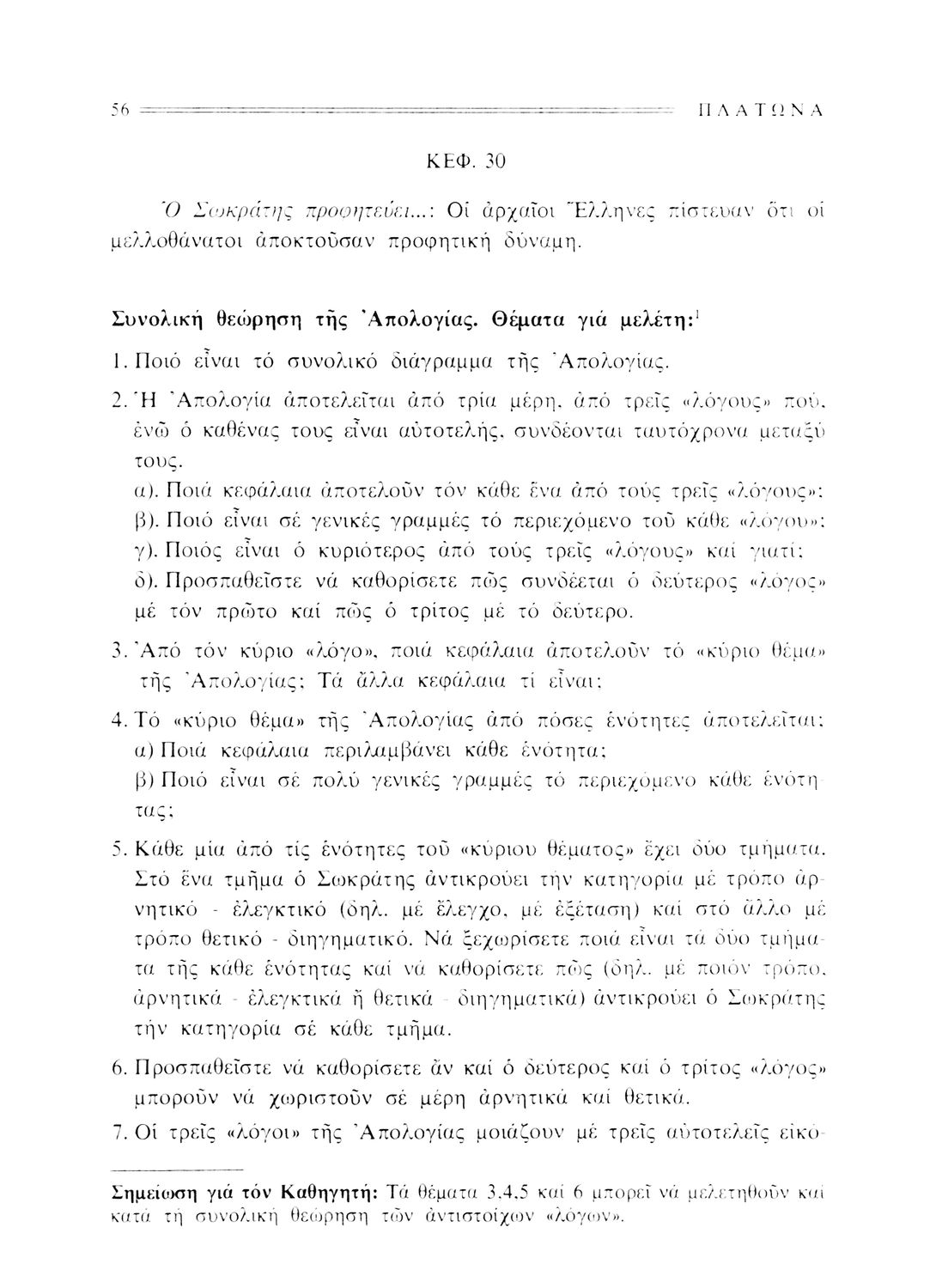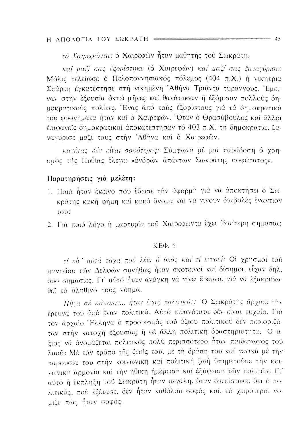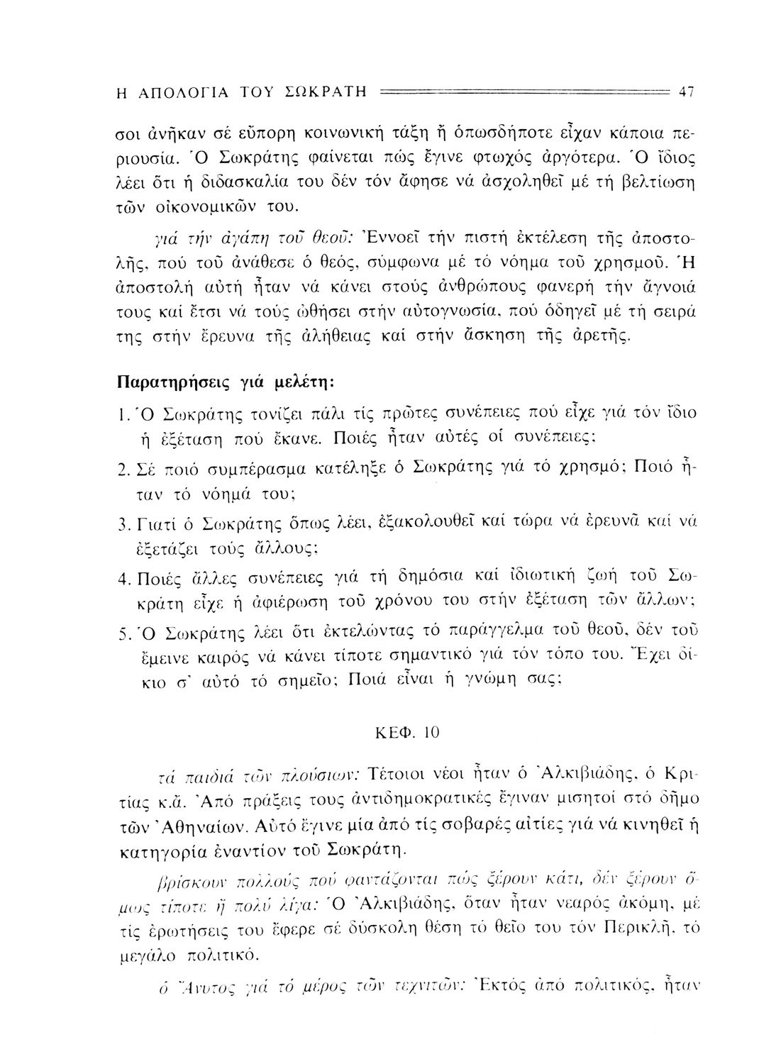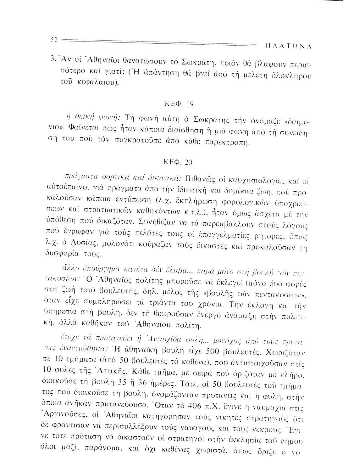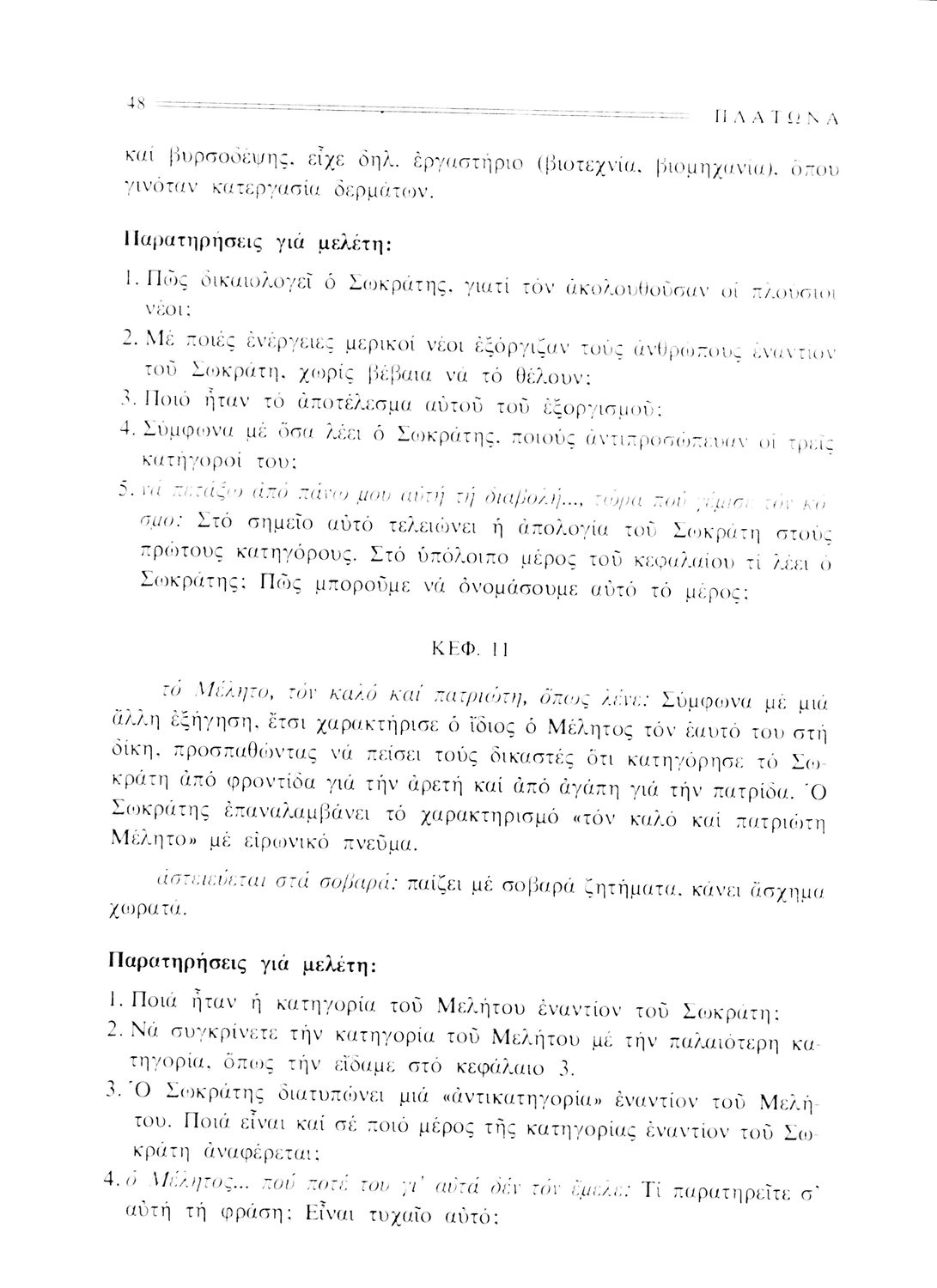 Μαθητικό βοήθημα Αρχαίων Ελληνικών Γυμνασίου που περιλαμβάνει τα κείμενα του Πλάτωνα Απολογία Σωκράτους, Κρίτων, Λάχης και πραγματολογικές παρατηρήσεις.