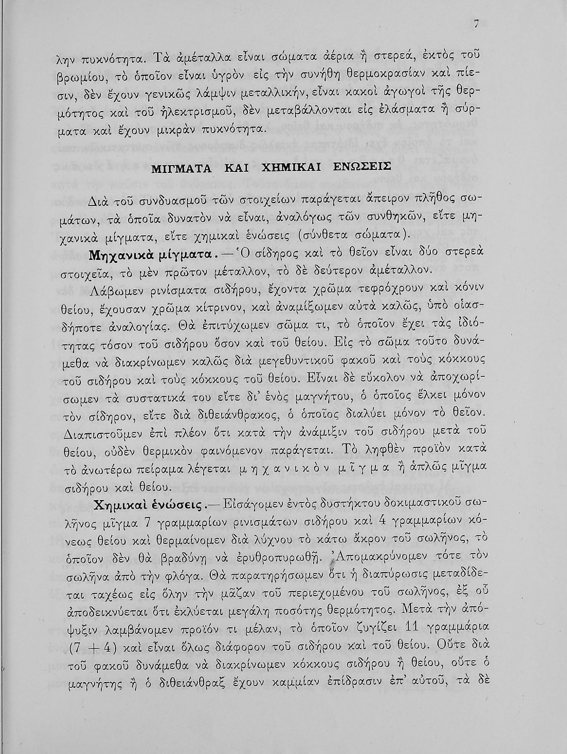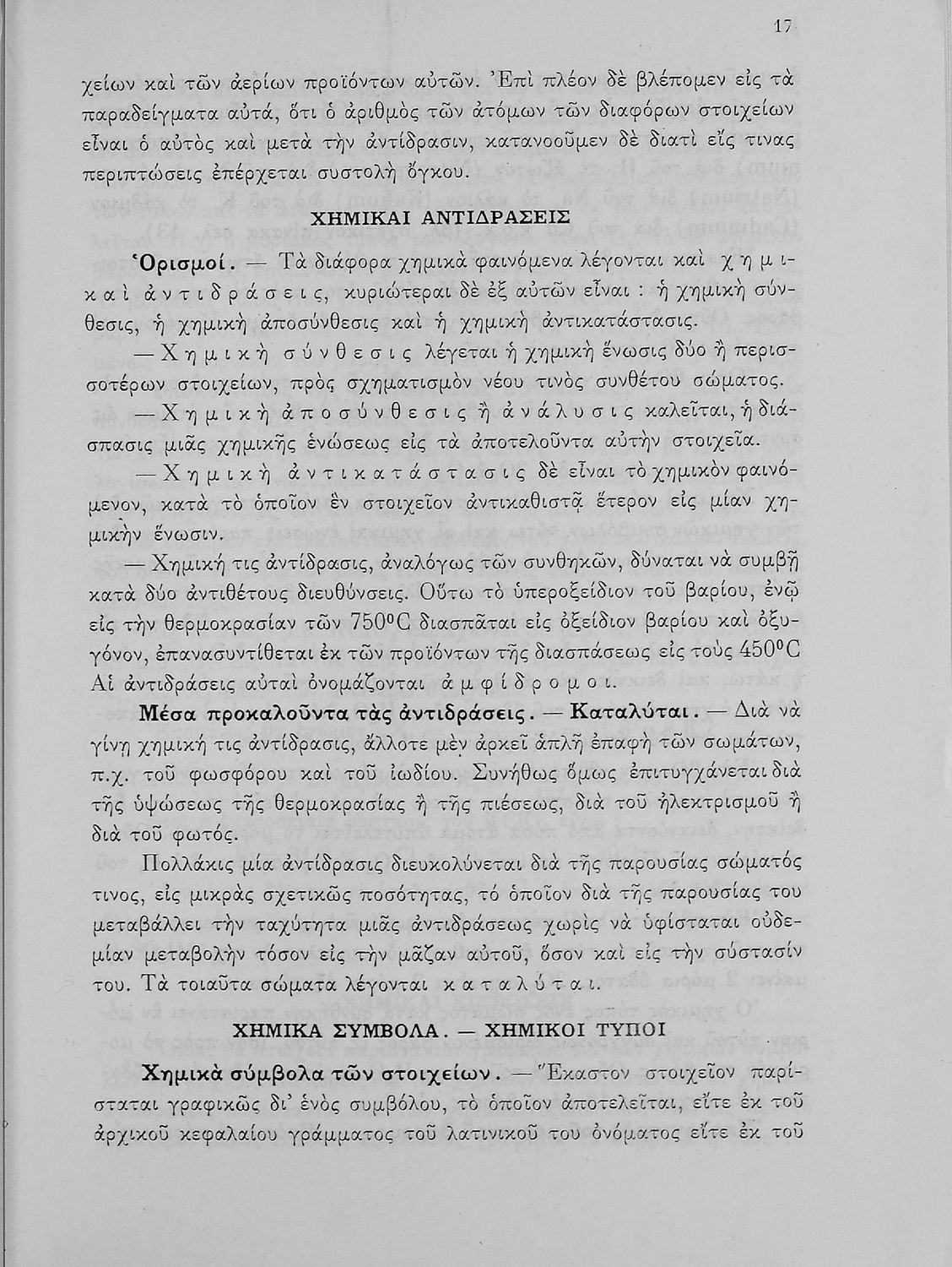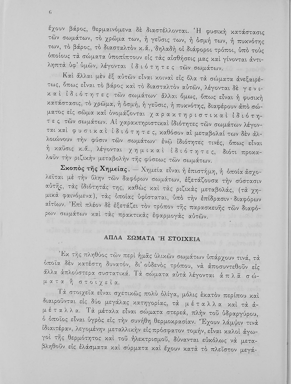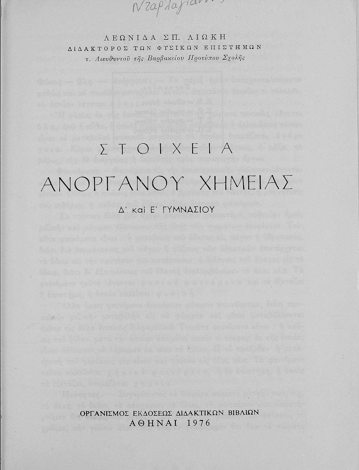 Βαθμίδα εκπαίδευσης: Δευτεροβάθμια Τάξη: Δ' Γυμνασίου / Ε' Γυμνασίου Μάθημα: Χημεία Γλώσσα: Καθαρεύουσα Παρουσίαση περιεχομένου: Σχολικό εγχειρίδιο Χημείας που απευθύνεται σε μαθητές Γυμνασίου με σκοπό τη περιγραφή εισαγωγικών εννοιών χημείας (ύλη, νόμοι χημείας, χημικές αντιδράσεις-εξισώσεις-ενώσεις) καθώς γίνεται αναλυτική περιγραφή στοιχείων μετάλλων και αμέταλλων περιγράφοντας τις ιδιότητες και τις ενώσεις τους. |