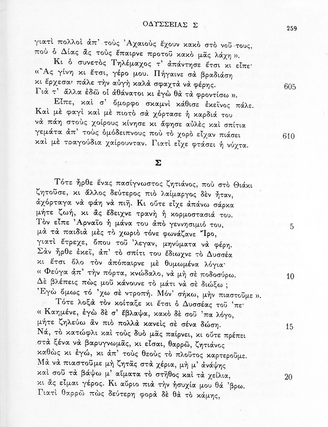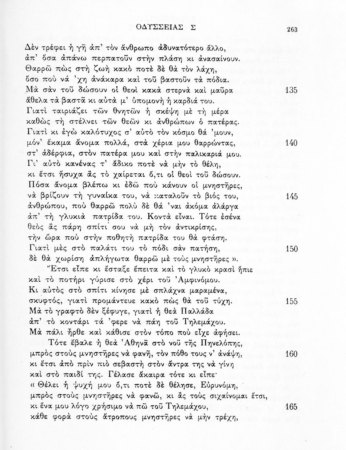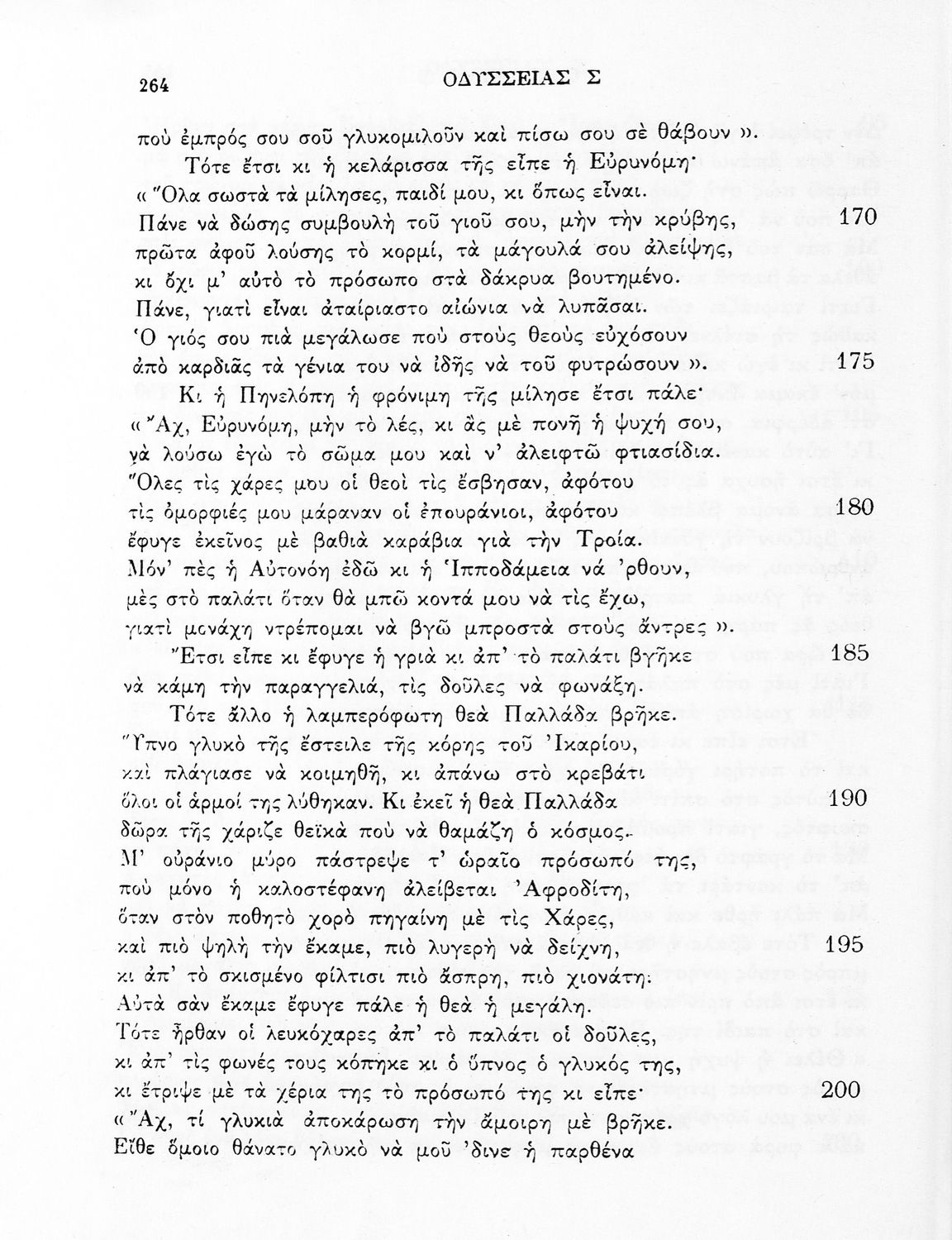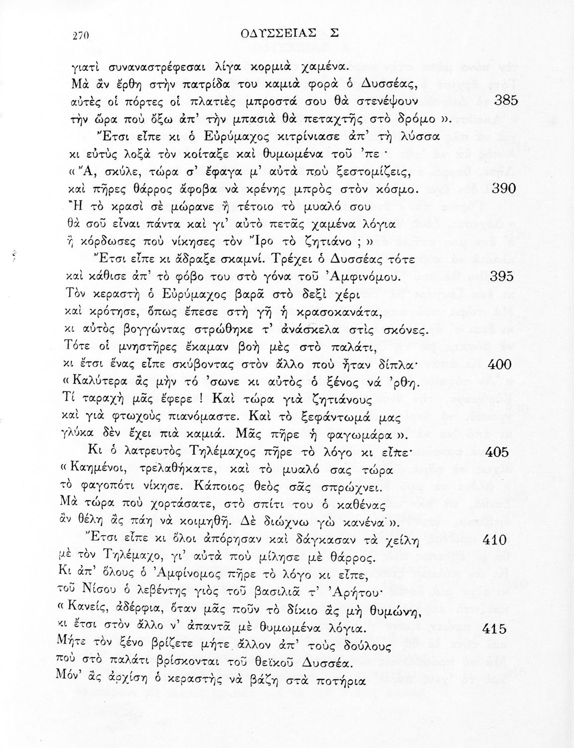 Σχολικό εγχειρίδιο Αρχαίων Ελληνικών. Πρόκειται για "ανάτυπον εμμέτρου μεταφράσεως εκ της σειράς των 227 τόμων ΑΡΧΑΙΩΝ ΕΛΛΗΝΩΝ ΣΥΓΓΡΑΦΕΩΝ ιδιοκτησίας του Εκδοτικού Οίκου Ιωάννου Ν. Ζαχαρόπουλου". Το βιβλίο περιλαμβάνει το έπος της Οδύσσειας σε μετάφραση του Ζήσιμου Σιδέρη. Ακολουθεί ενδεικτικό Λεξιλόγιο.