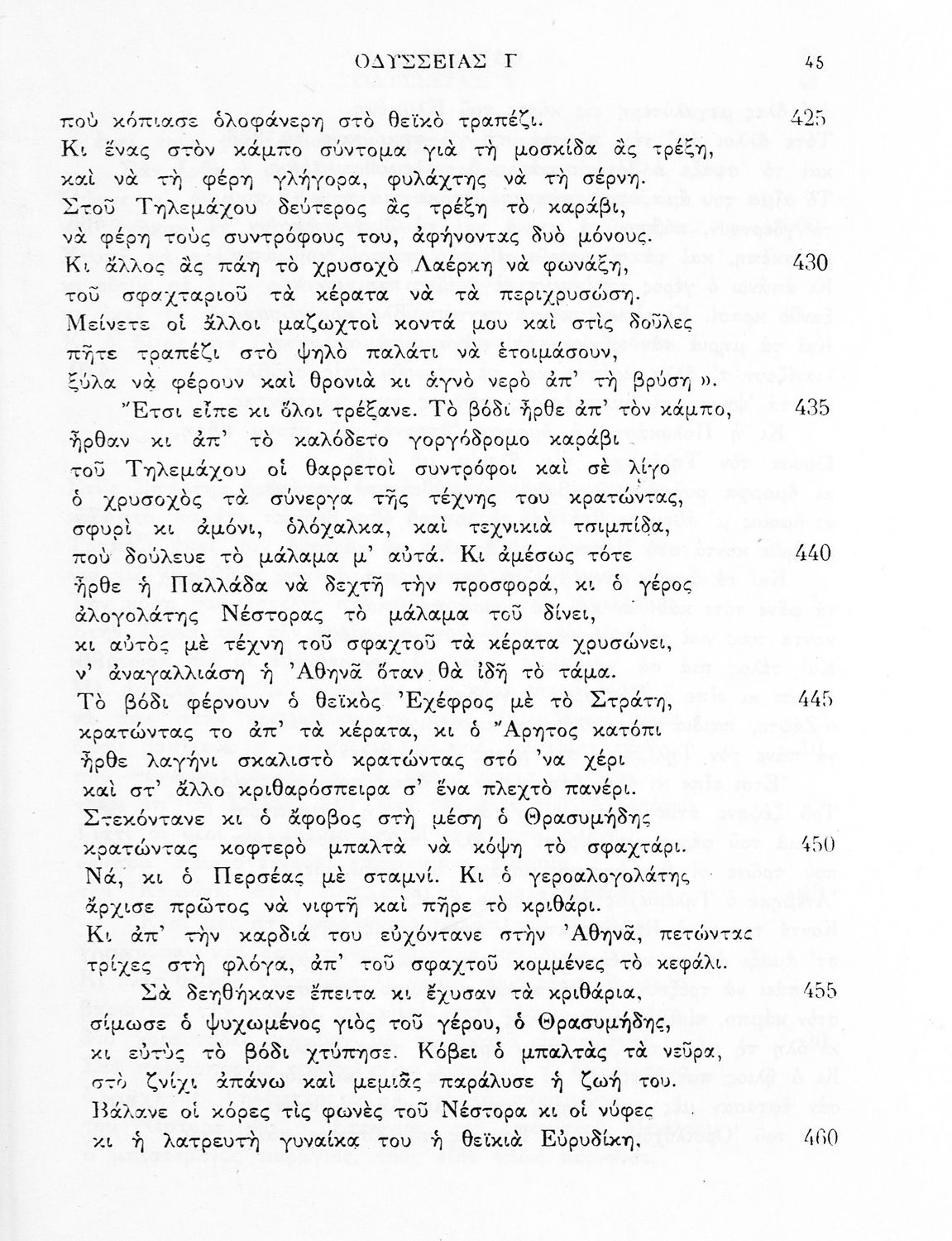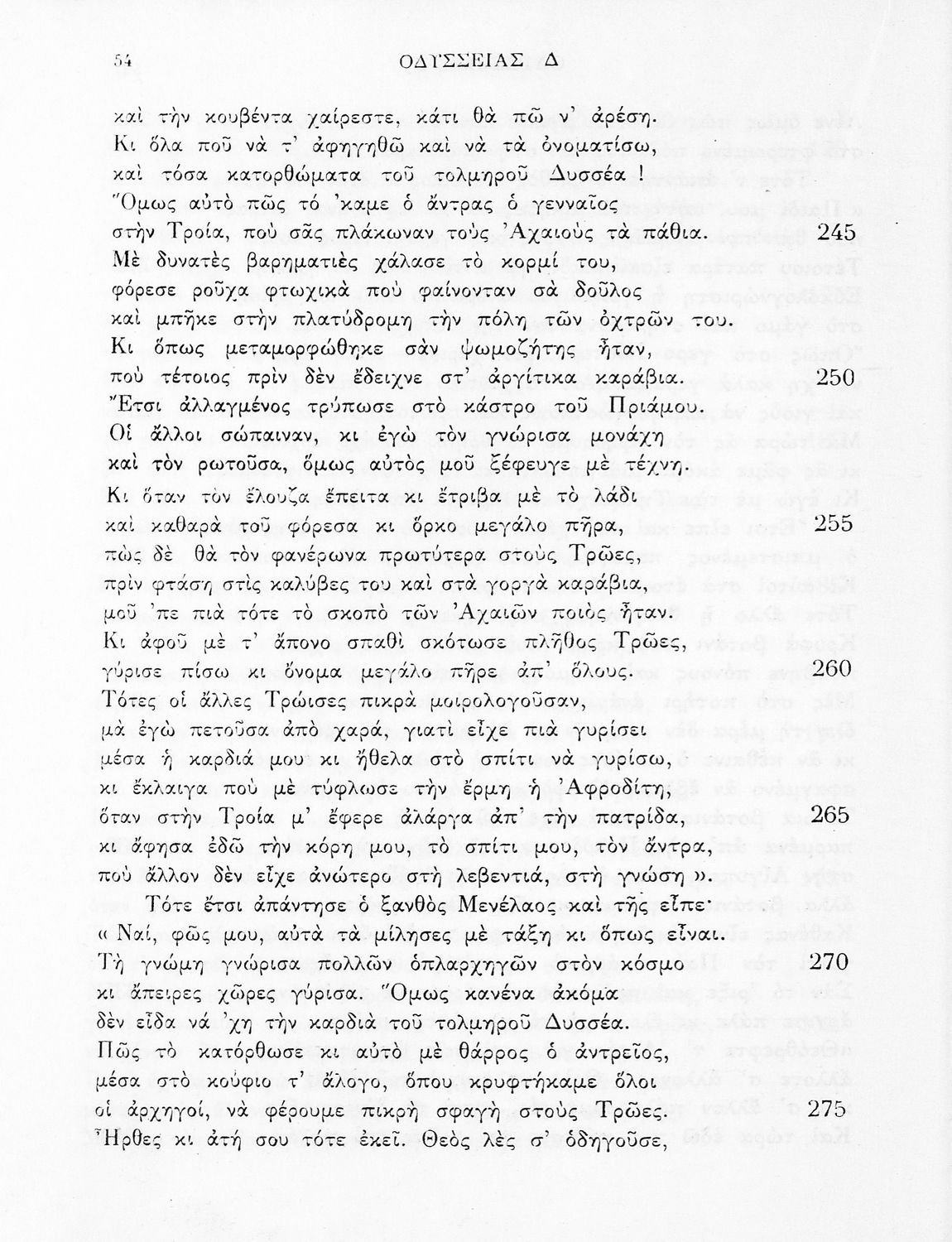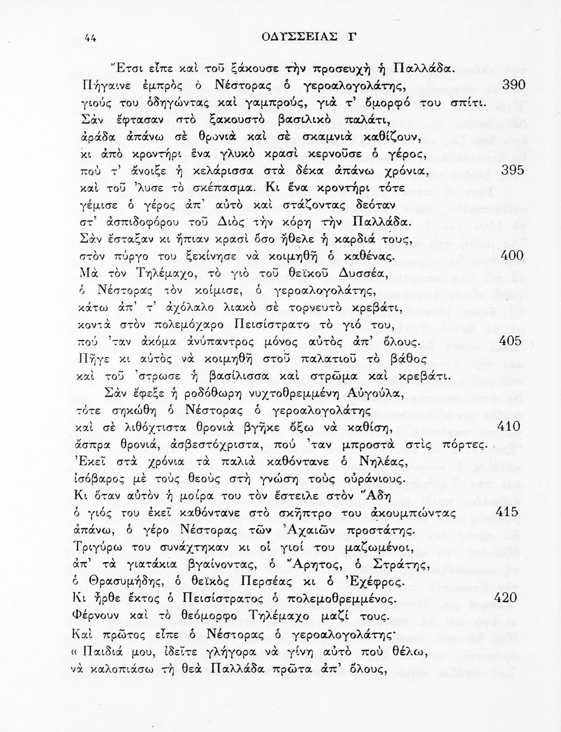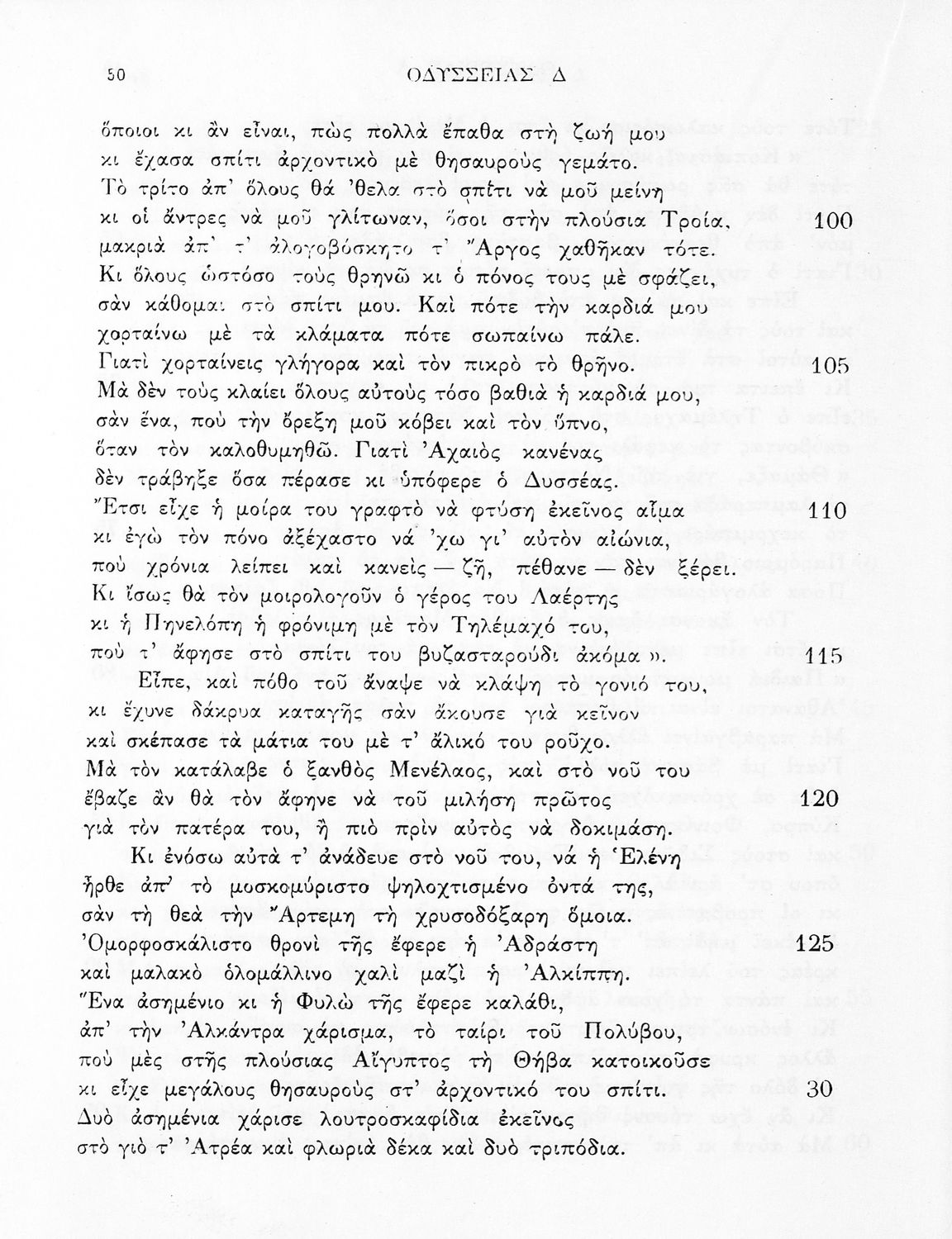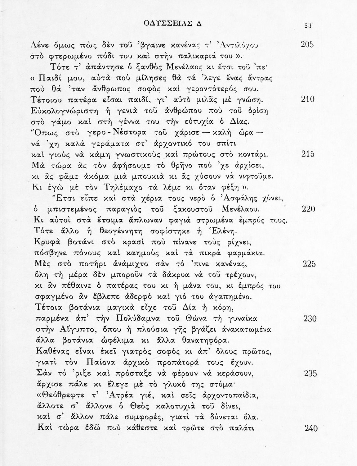 Σχολικό εγχειρίδιο Αρχαίων Ελληνικών. Πρόκειται για "ανάτυπον εμμέτρου μεταφράσεως εκ της σειράς των 227 τόμων ΑΡΧΑΙΩΝ ΕΛΛΗΝΩΝ ΣΥΓΓΡΑΦΕΩΝ ιδιοκτησίας του Εκδοτικού Οίκου Ιωάννου Ν. Ζαχαρόπουλου". Το βιβλίο περιλαμβάνει το έπος της Οδύσσειας σε μετάφραση του Ζήσιμου Σιδέρη. Ακολουθεί ενδεικτικό Λεξιλόγιο.