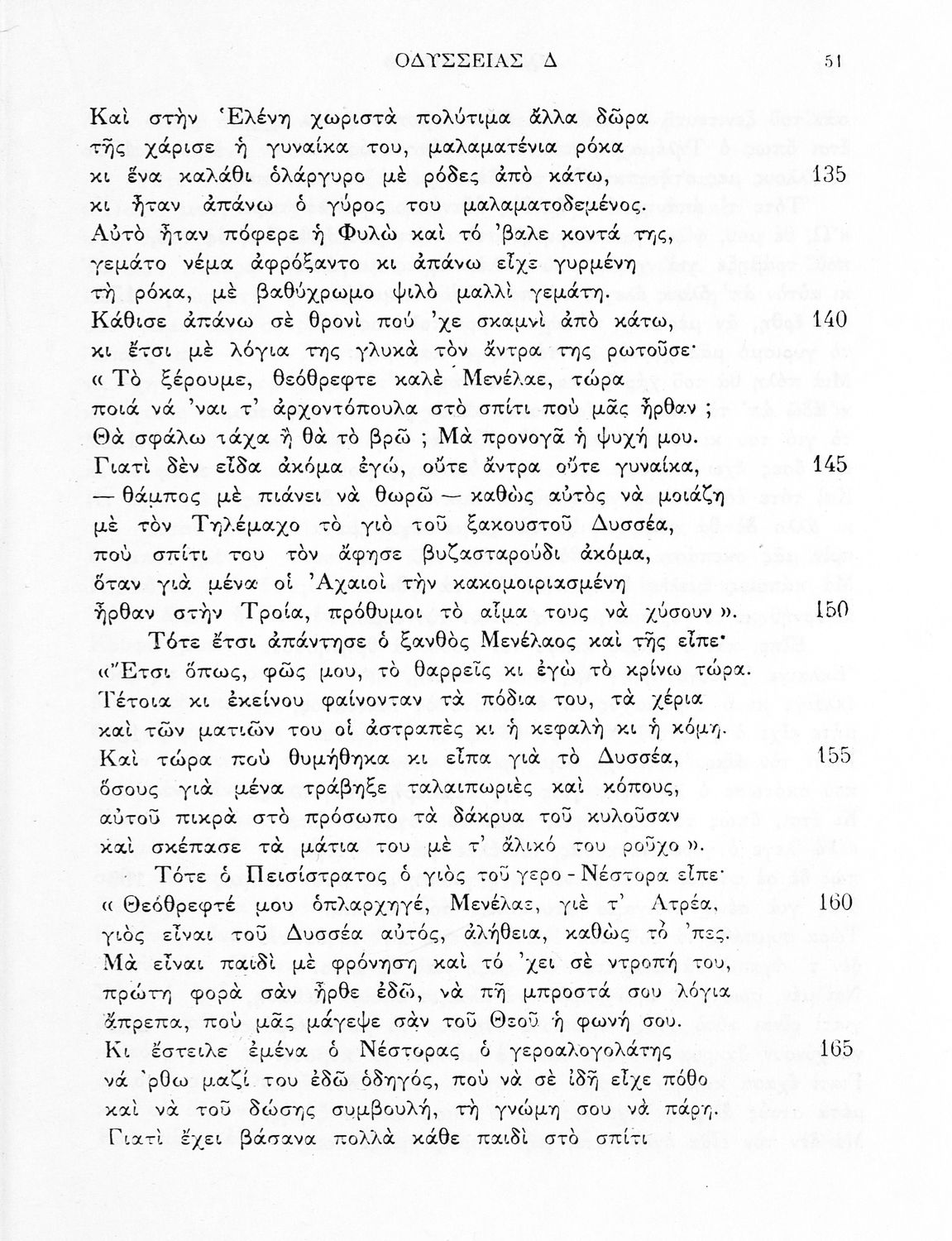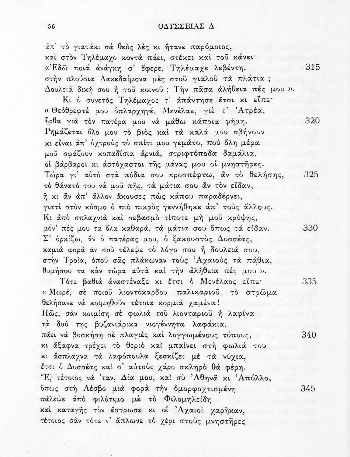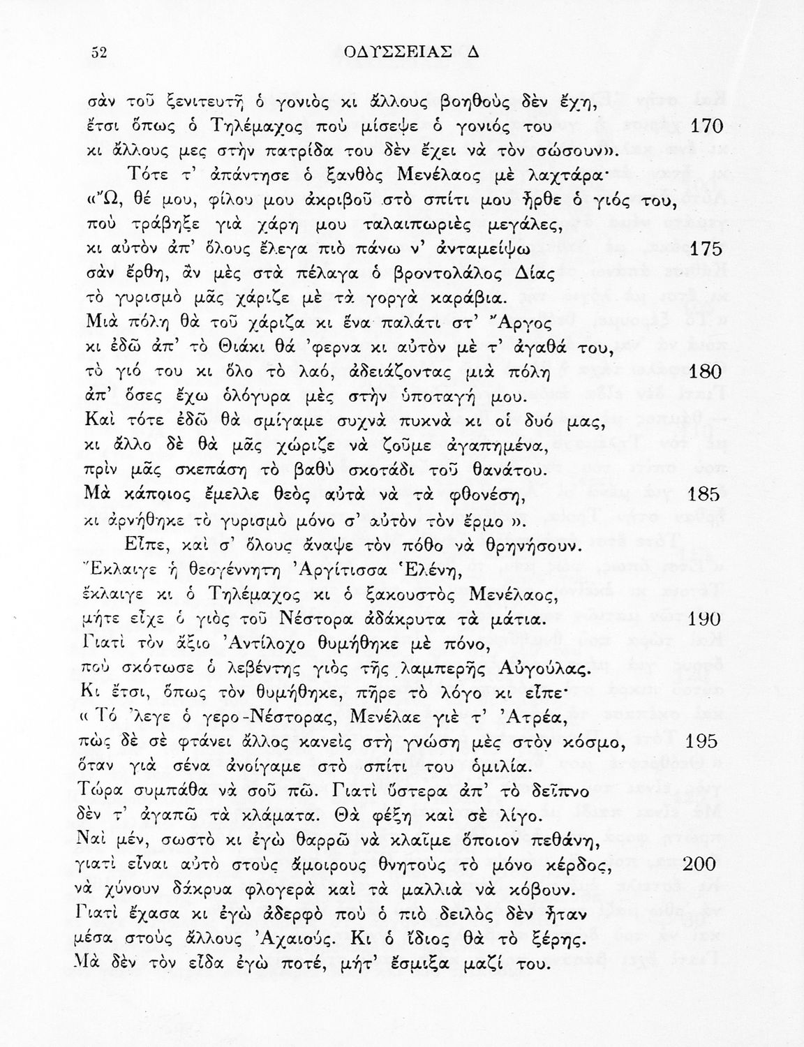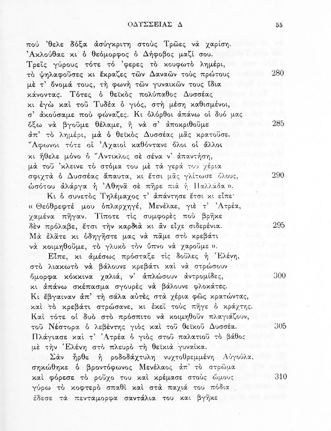 Σχολικό εγχειρίδιο Αρχαίων Ελληνικών. Πρόκειται για "ανάτυπον εμμέτρου μεταφράσεως εκ της σειράς των 227 τόμων ΑΡΧΑΙΩΝ ΕΛΛΗΝΩΝ ΣΥΓΓΡΑΦΕΩΝ ιδιοκτησίας του Εκδοτικού Οίκου Ιωάννου Ν. Ζαχαρόπουλου". Το βιβλίο περιλαμβάνει το έπος της Οδύσσειας σε μετάφραση του Ζήσιμου Σιδέρη. Ακολουθεί ενδεικτικό Λεξιλόγιο.
