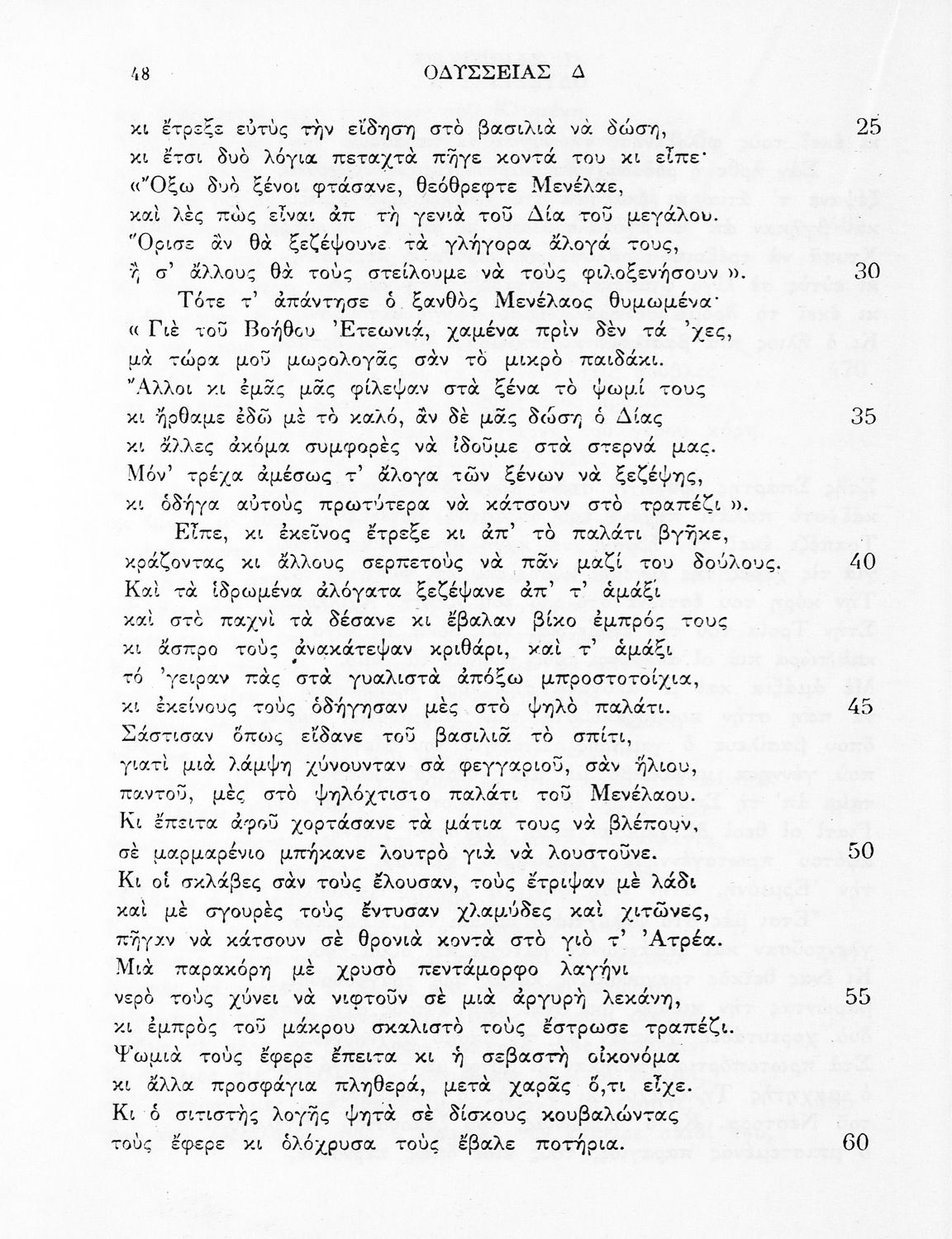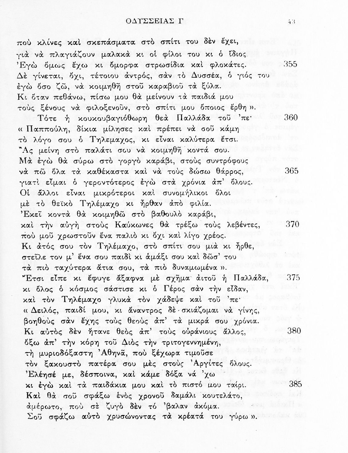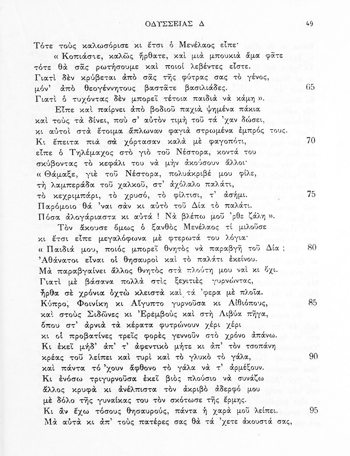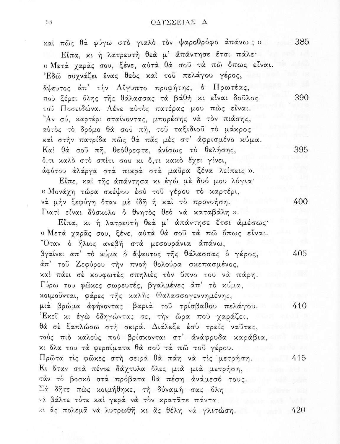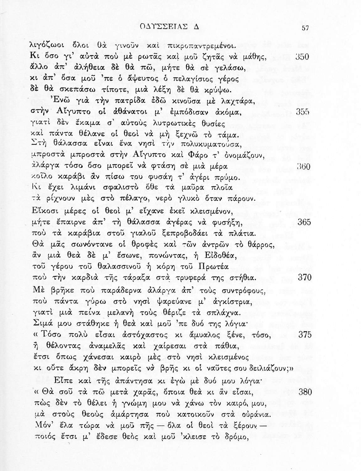 Σχολικό εγχειρίδιο Αρχαίων Ελληνικών. Πρόκειται για "ανάτυπον εμμέτρου μεταφράσεως εκ της σειράς των 227 τόμων ΑΡΧΑΙΩΝ ΕΛΛΗΝΩΝ ΣΥΓΓΡΑΦΕΩΝ ιδιοκτησίας του Εκδοτικού Οίκου Ιωάννου Ν. Ζαχαρόπουλου". Το βιβλίο περιλαμβάνει το έπος της Οδύσσειας σε μετάφραση του Ζήσιμου Σιδέρη. Ακολουθεί ενδεικτικό Λεξιλόγιο.