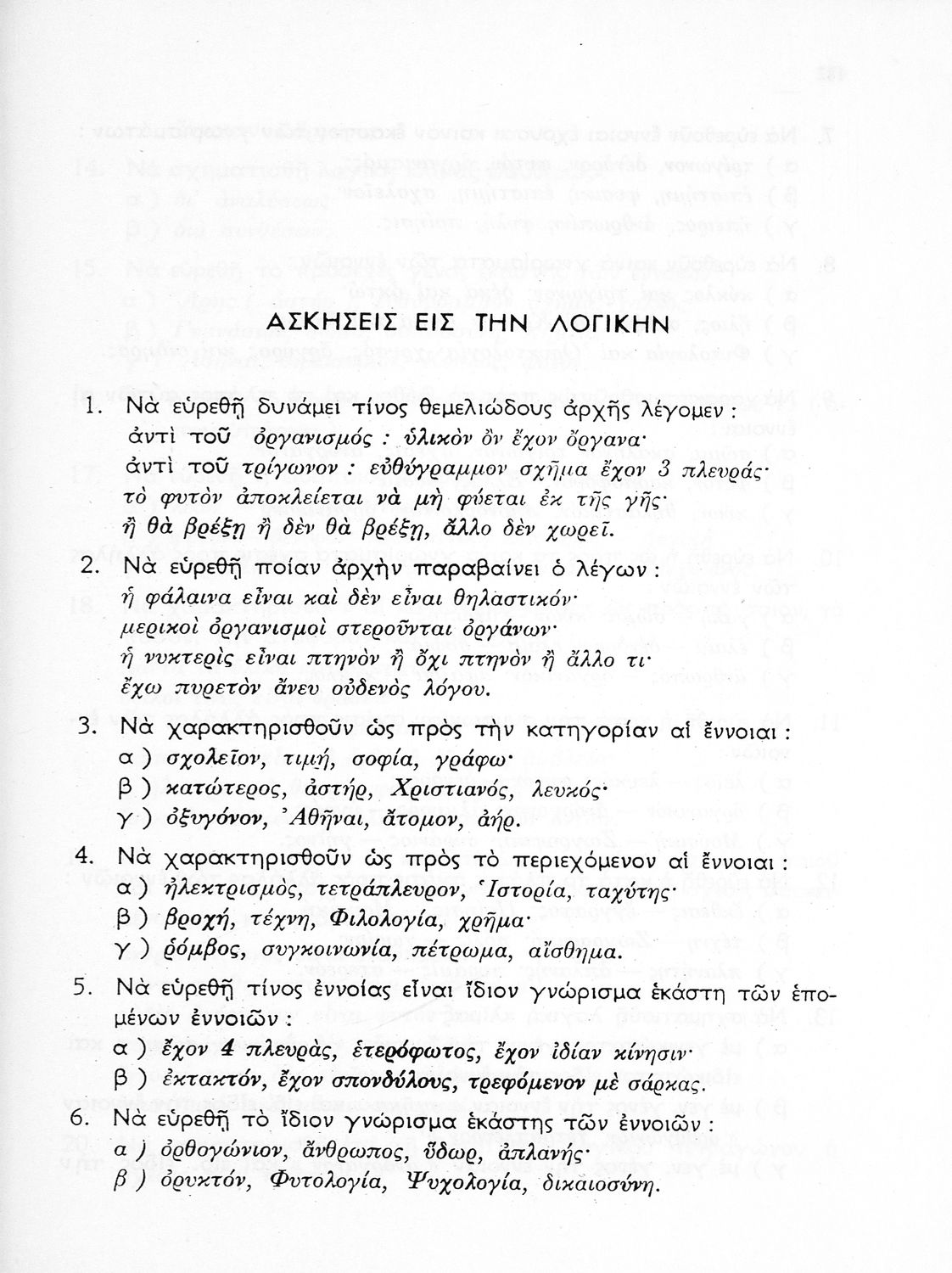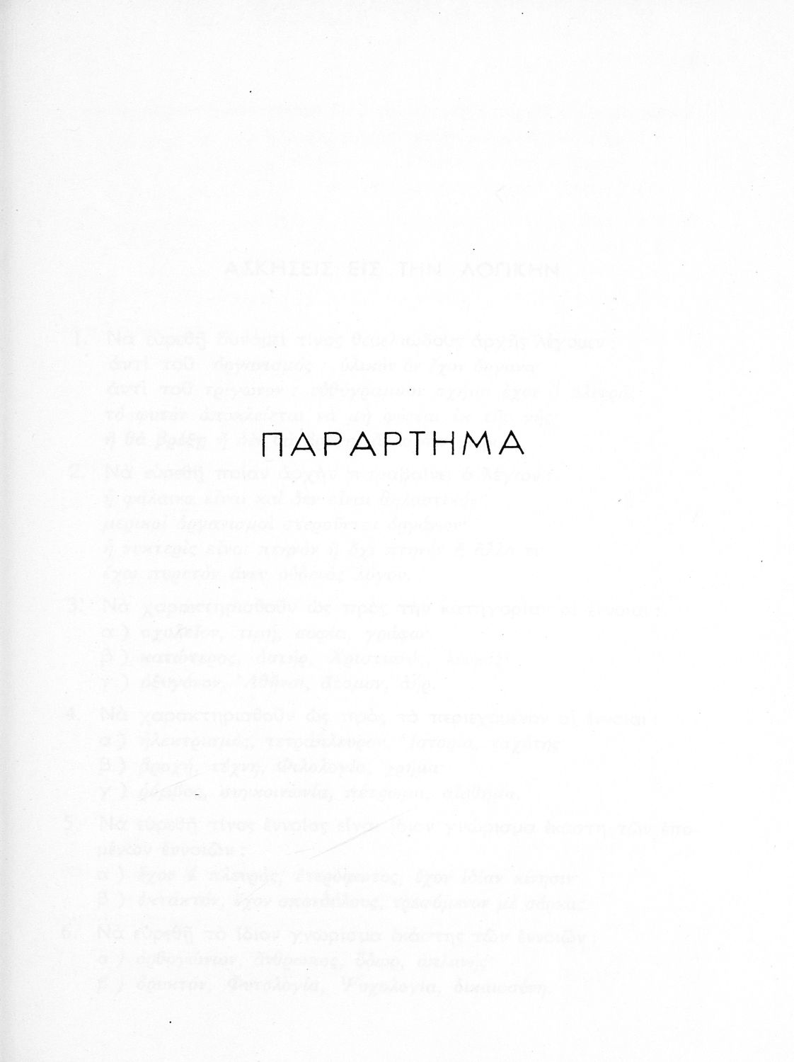 Σχολικό εγχειρίδιο Λογικής ΣΤ΄ Γυμνασίου που είναι δομημένο θεματικά και περιλαμβάνει ζητήματα τυπικής λογικής, μεθοδολογίας και γνωσιολογίας. Περιέχει παράρτημα με ασκήσεις λογικής. Φέρει το σύμβολο της δικτατορίας.
