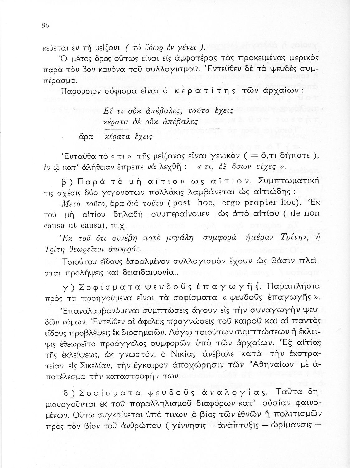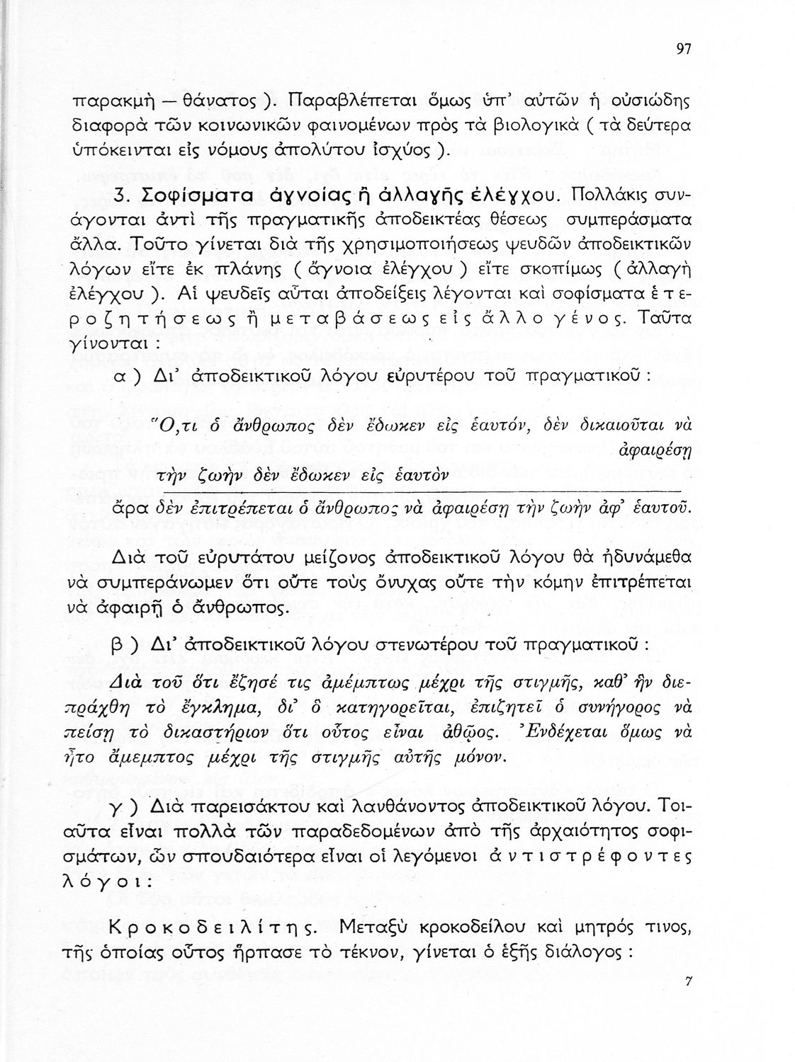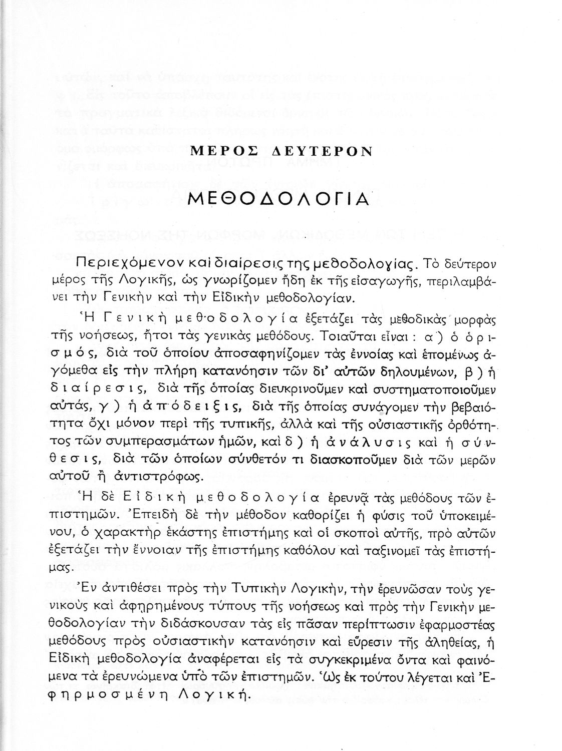 Σχολικό εγχειρίδιο Λογικής ΣΤ΄ Γυμνασίου που είναι δομημένο θεματικά και περιλαμβάνει ζητήματα τυπικής λογικής, μεθοδολογίας και γνωσιολογίας. Περιέχει παράρτημα με ασκήσεις λογικής. Φέρει το σύμβολο της δικτατορίας.