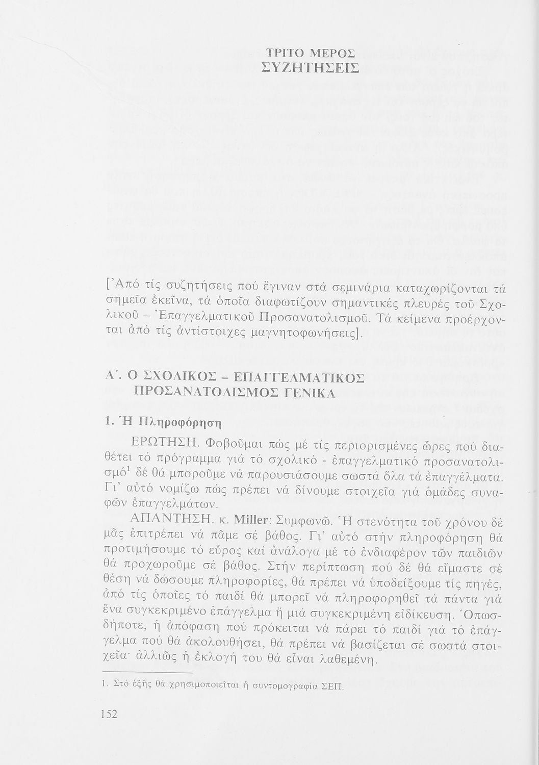 Τόμος που περιλαμβάνει τα πρακτικά και τις συζητήσεις τριών ειδικών σεμιναρίων που οργανώθηκαν από το ΚΕΜΕ και τον ΟΑΕΔ για να προωθήσουν την εισαγωγή του Σχολικού Προσανατολισμού στην εκπαίδευση.