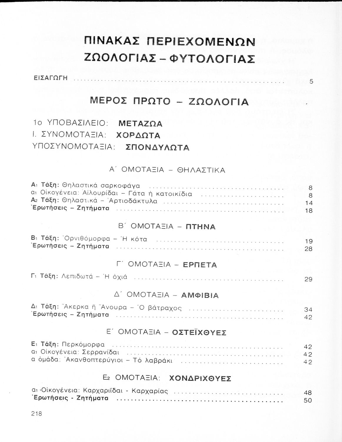 Σχολικό εγχειρίδιο Ζωολογίας/Φυτολογίας για τα Γυμνάσια και Αστικά Σχολεία που παρουσιάζει διάφορα ζώα και φυτά ανάλογα με τη συνομοταξία στην οποία ανήκουν.