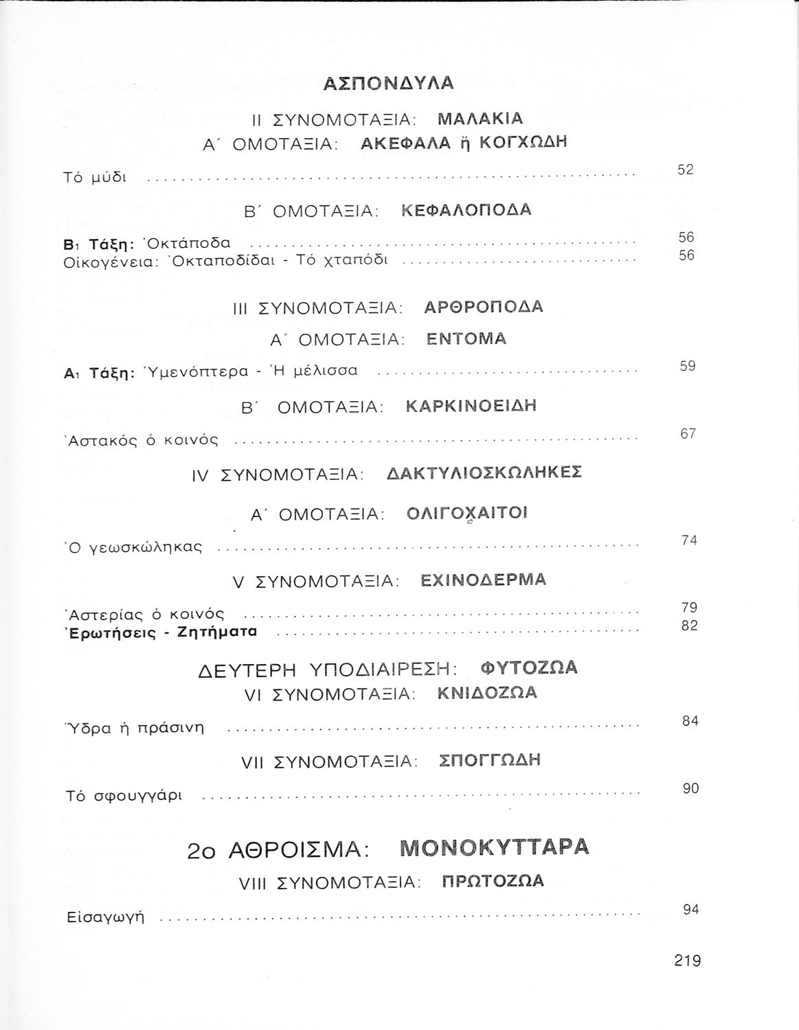 Παρουσίαση περιεχομένου: Σχολικό εγχειρίδιο Ζωολογίας και Φυτολογίας για την Α΄ Γυμνασίου που παρουσιάζει ζώα και φυτά με βάση τη συνομοταξία στην οποία ανήκουν.