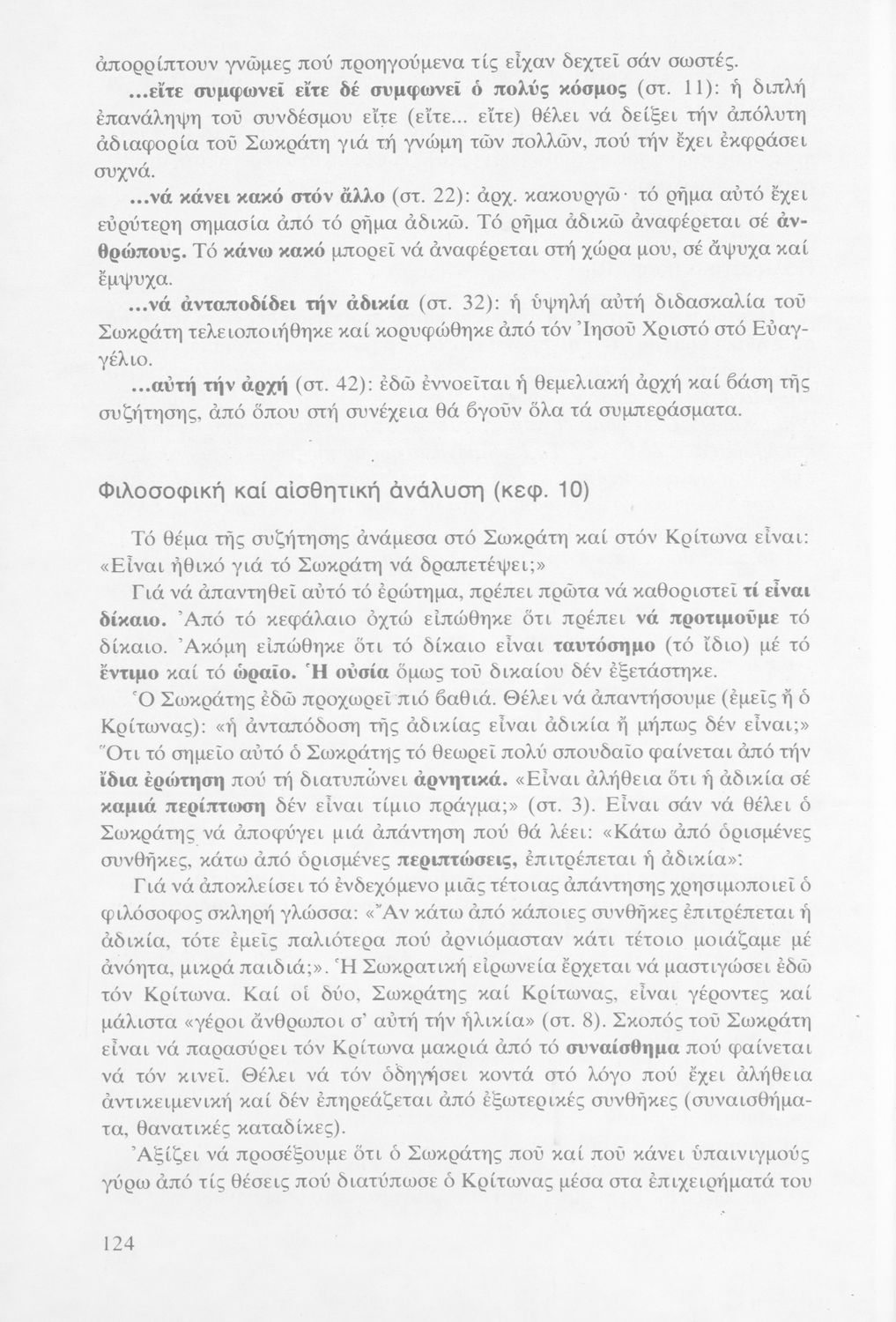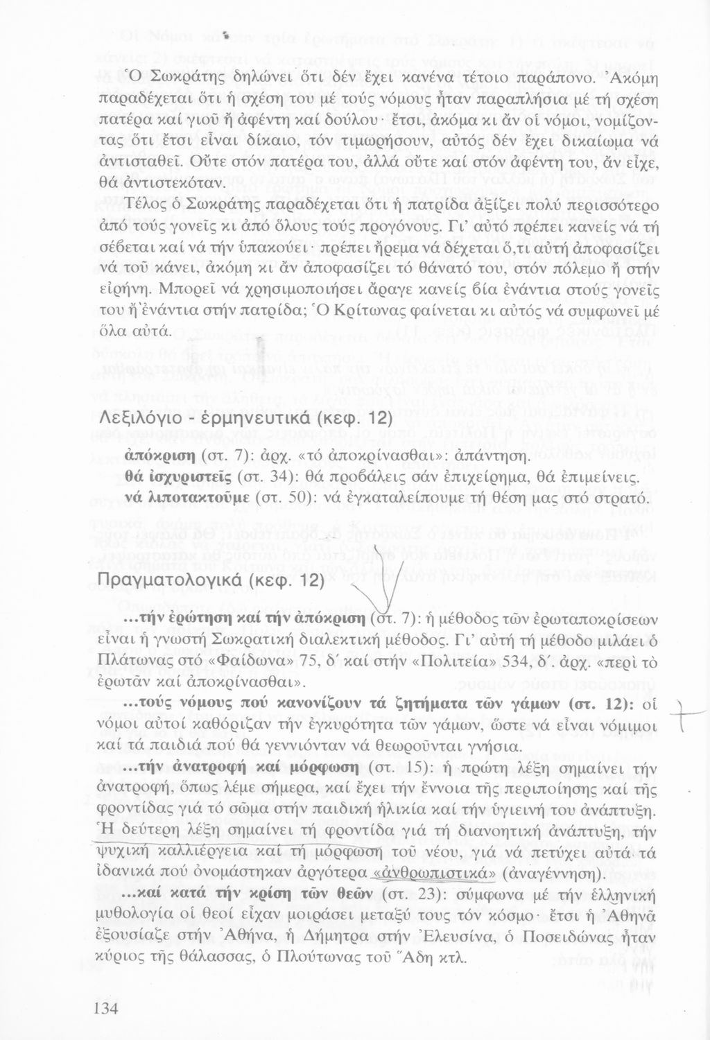 Σχολικό εγχειρίδιο Αρχαίων Ελληνικών Γ΄ Γυμνασίου που περιλαμβάνει το έργο του Πλάτωνα Κρίτων, εισαγωγή, μετάφραση και ερμηνευτικές παρατηρήσεις.