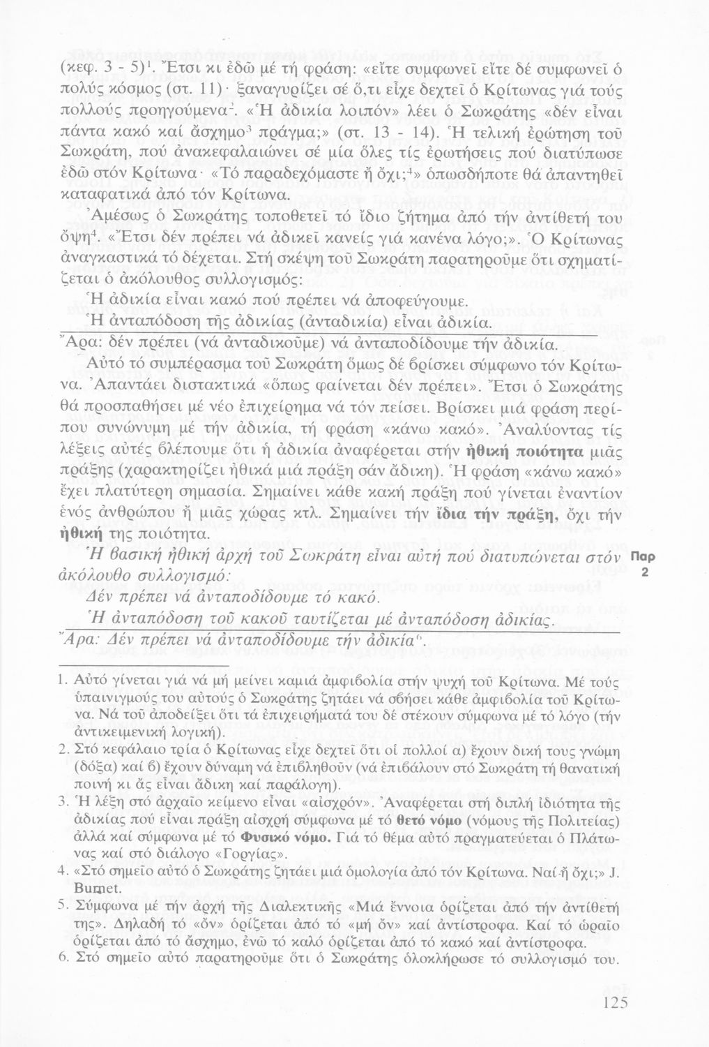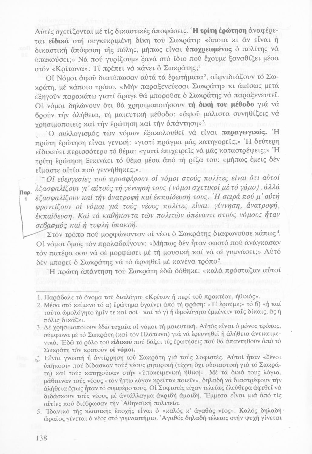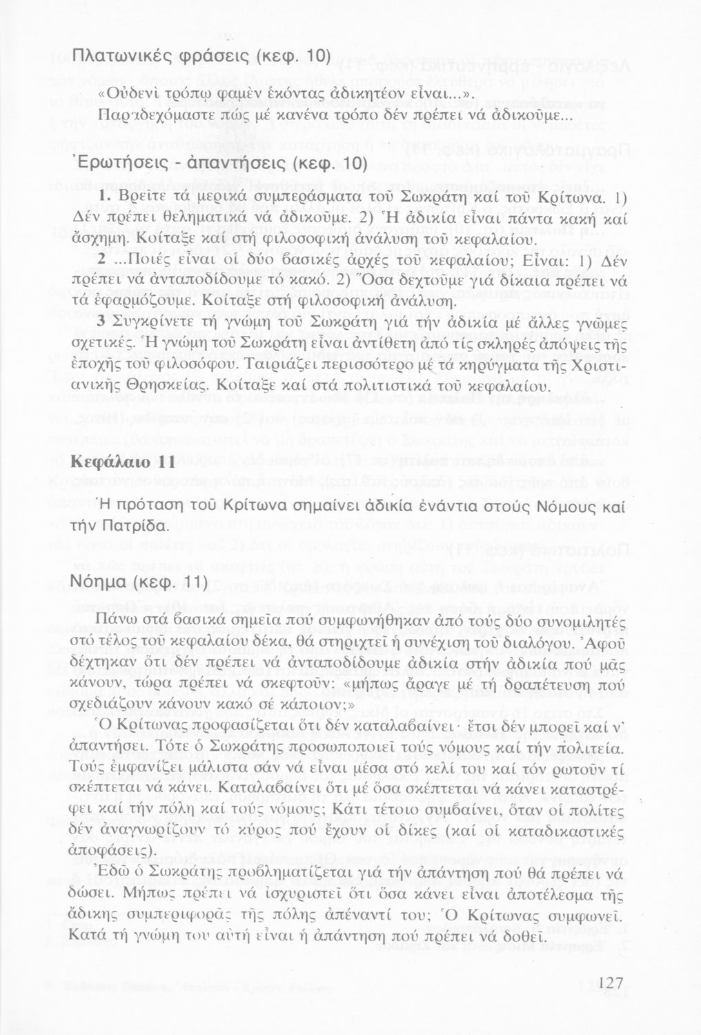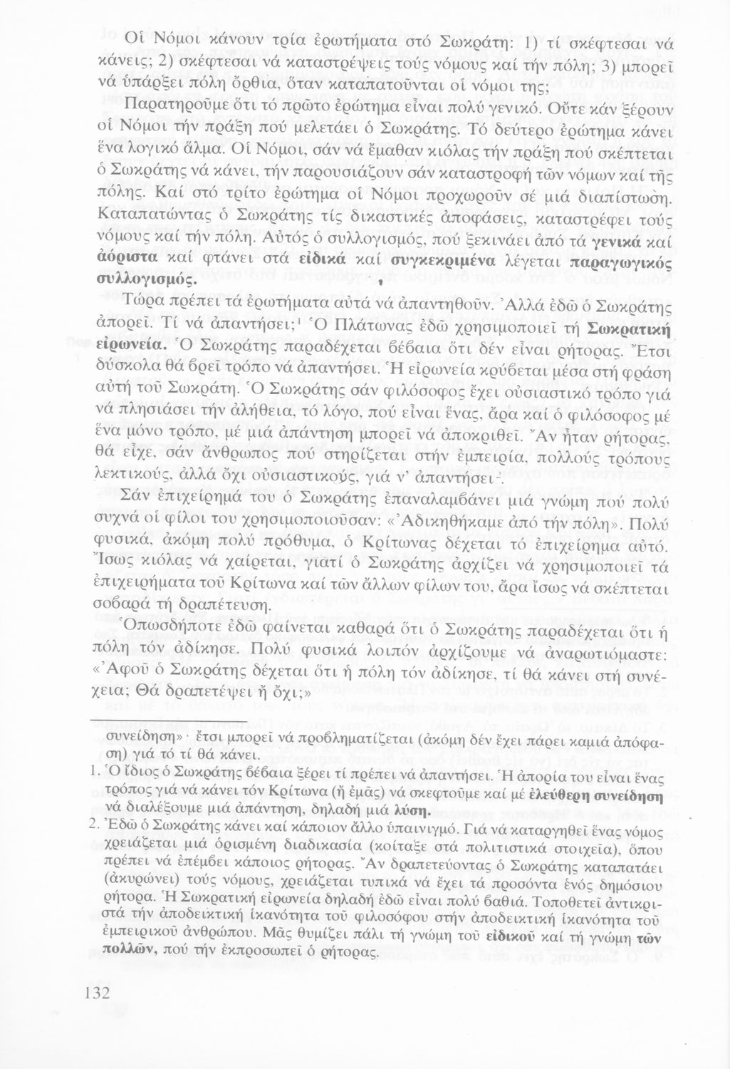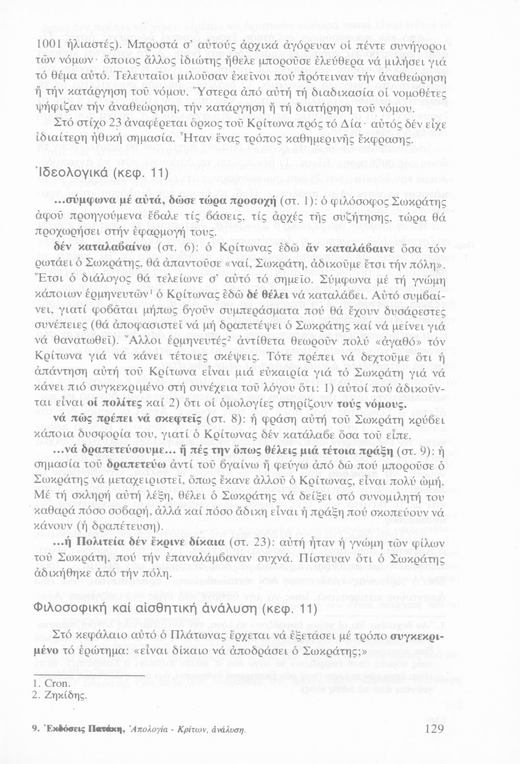 Σχολικό εγχειρίδιο Αρχαίων Ελληνικών Γυμνασίου που περιέχει τα έργα του Πλάτωνα Απολογία Σωκράτους και Κρίτων, ερμηνευτικά και πραγματολογικά σχόλια και λεξιλογικές παρατηρήσεις.