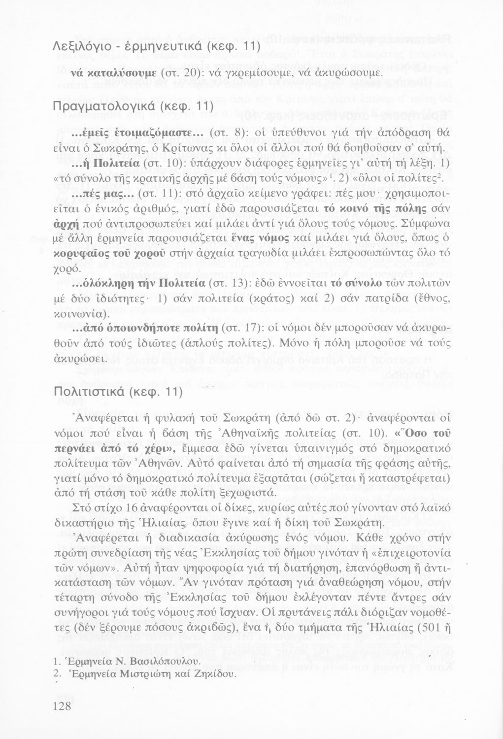 Σχολικό εγχειρίδιο Αρχαίων Ελληνικών για τη Β΄ Γυμνασίου. Περιέχει μεταφρασμένα κείμενα του Πλάτωνα και του Αριστοτέλη, εισαγωγές και ερμηνευτικά σχόλια του συγγραφέα.