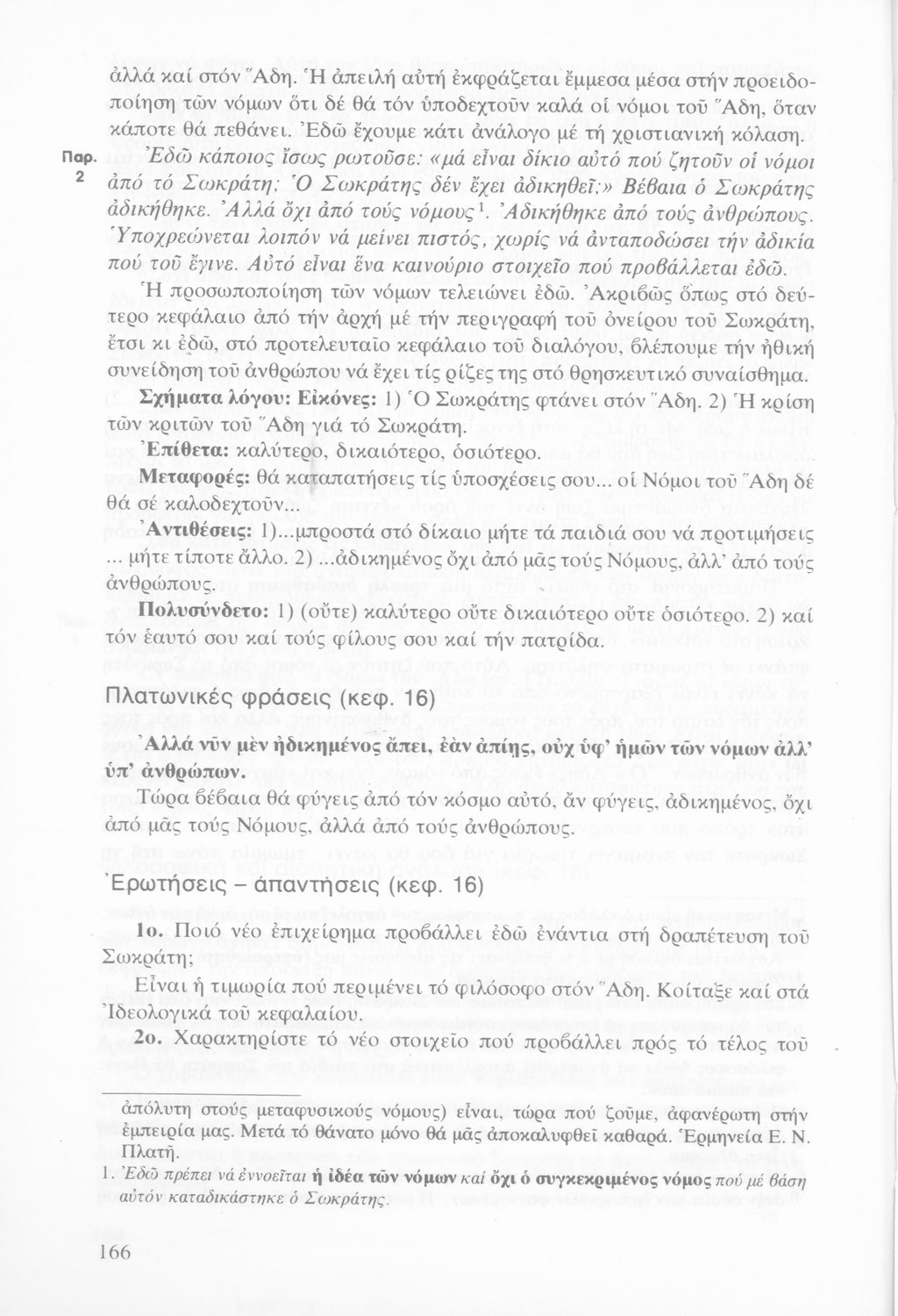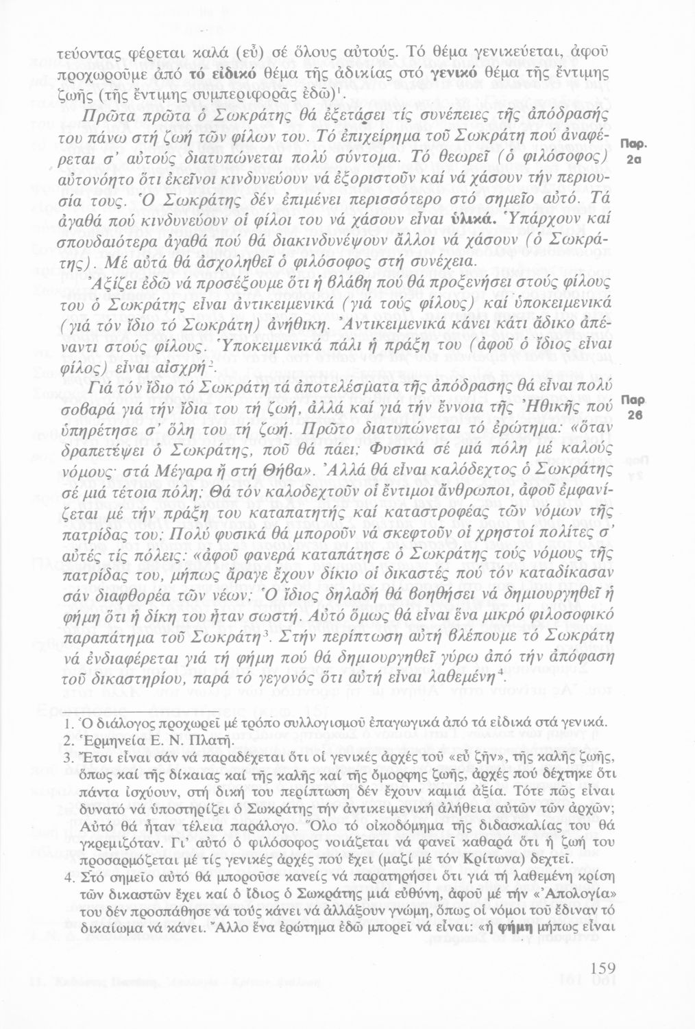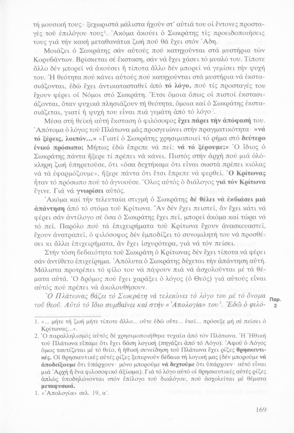 Σχολικό εγχειρίδιο Αρχαίων Ελληνικών Γυμνασίου που περιέχει τα έργα του Πλάτωνα Απολογία Σωκράτους και Κρίτων, ερμηνευτικά και πραγματολογικά σχόλια και λεξιλογικές παρατηρήσεις.