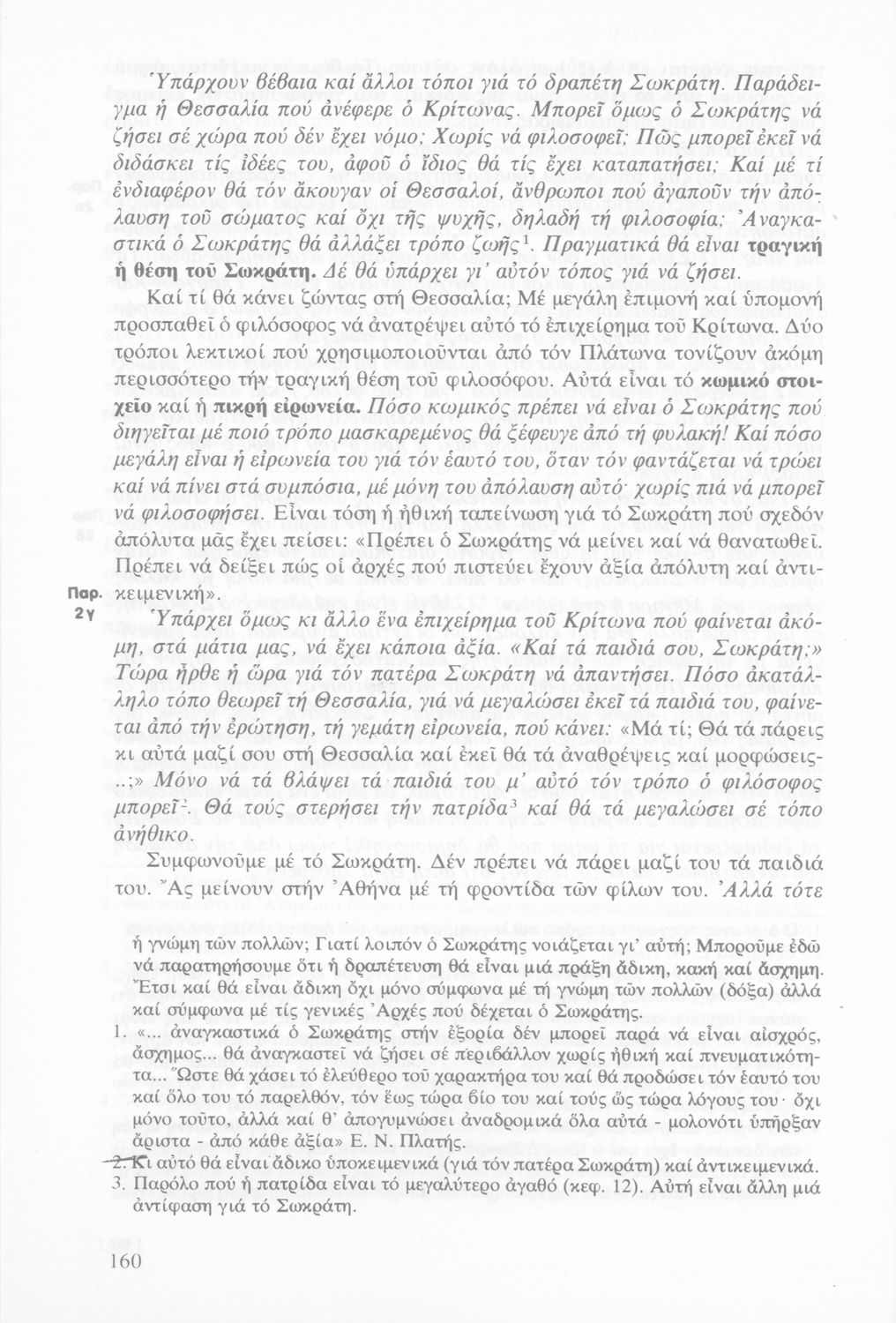 Σχολικό εγχειρίδιο Αρχαίων Ελληνικών Γ΄ Γυμνασίου που περιλαμβάνει το έργο του Πλάτωνα Κρίτων, εισαγωγή, μετάφραση και ερμηνευτικές παρατηρήσεις.