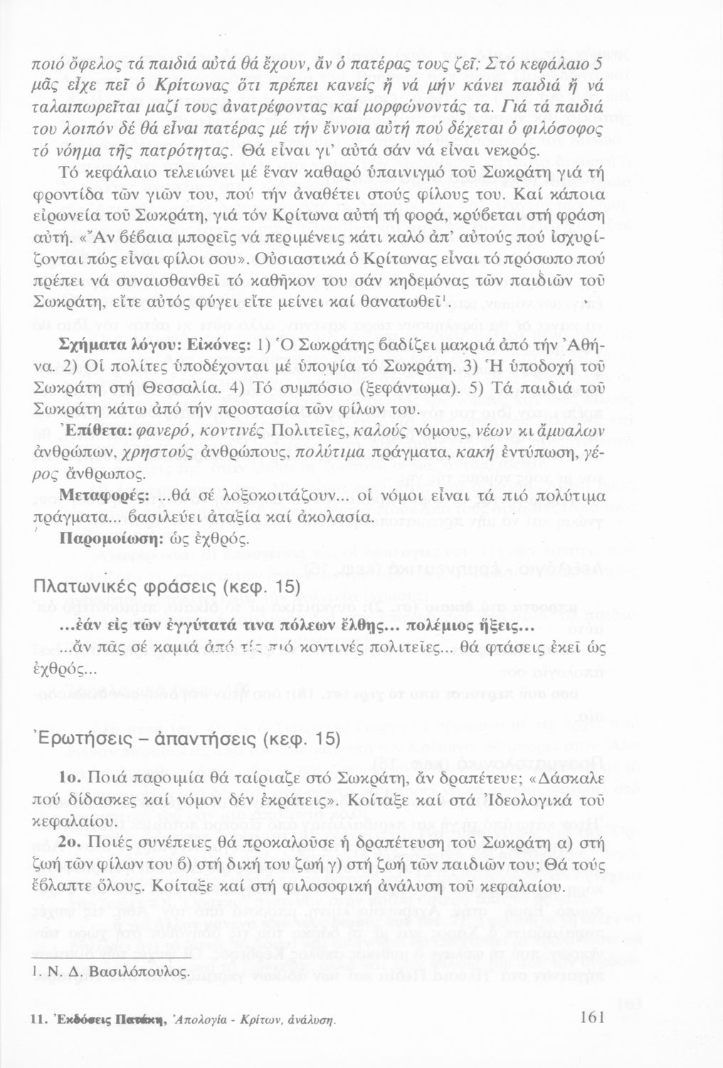 Σχολικό εγχειρίδιο της Ε΄ Γυμνασίου για το μάθημα των Αρχαίων Ελληνικών. Περιέχει το πρωτότυπο κείμενο του Πλάτωνα από την απολογία του Κρίτωνα με ερμηνευτικά, πραγματολογικά σχόλια και λεξιλογικές ...