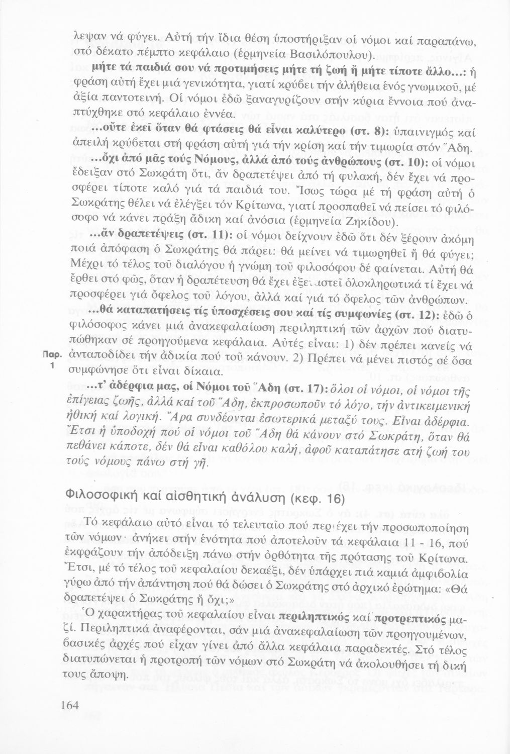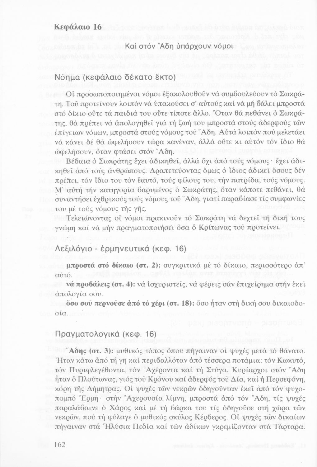 Μαθητικό βοήθημα Αρχαίων Ελληνικών Γυμνασίου που περιλαμβάνει τα κείμενα του Πλάτωνα Απολογία Σωκράτους, Κρίτων, Λάχης και πραγματολογικές παρατηρήσεις.