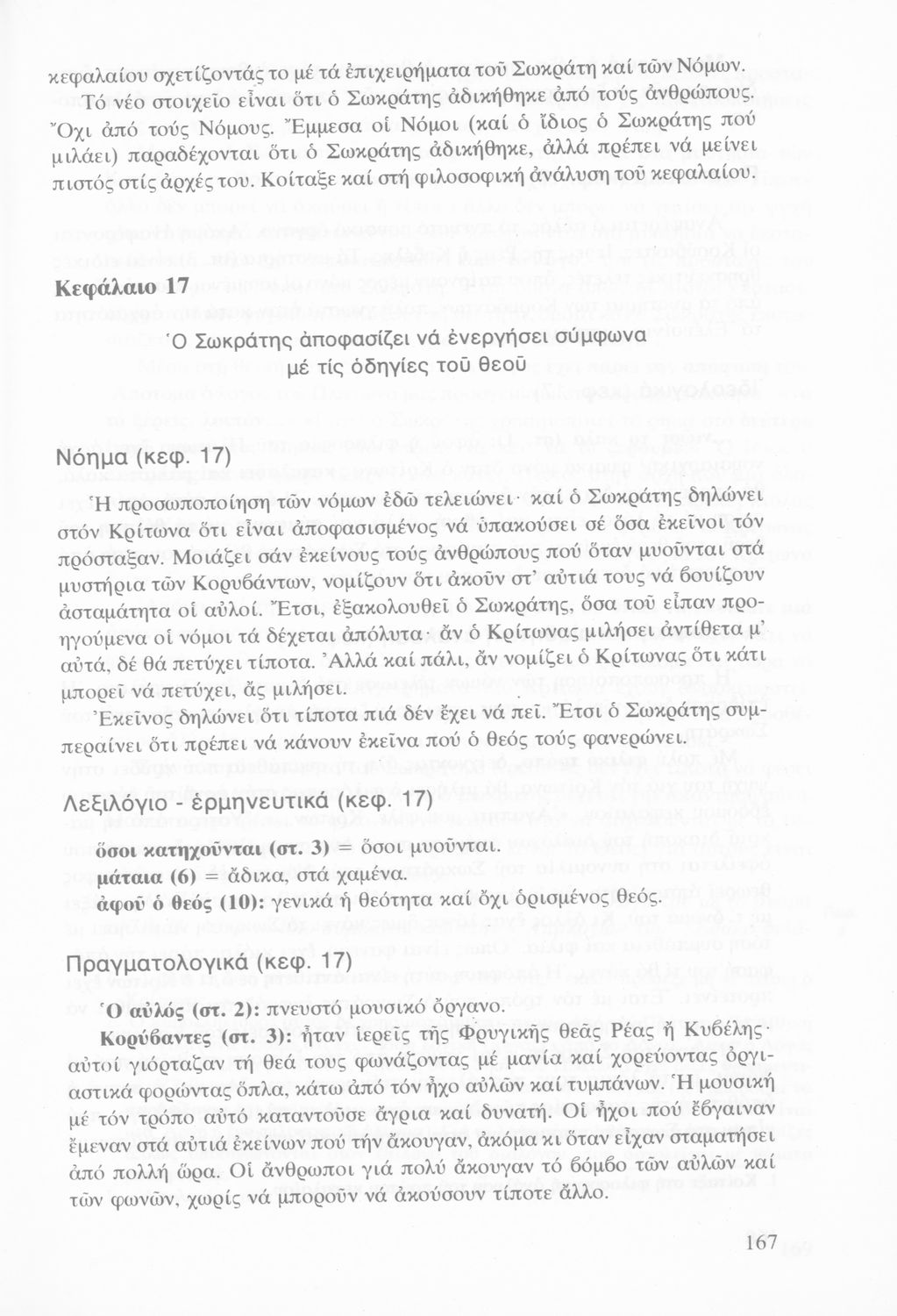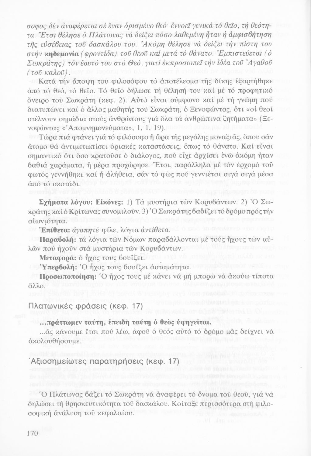 Σχολικό εγχειρίδιο της Γ΄ Γυμνασίου για το μάθημα των Αρχαίων. Περιέχει το πρωτότυπο κείμενο από το έργο του Πλάτωνα, Απολογία του Σωκράτη, με ερμηνευτικές και πραγματολογικές παρατηρήσεις του συγγραφέα.