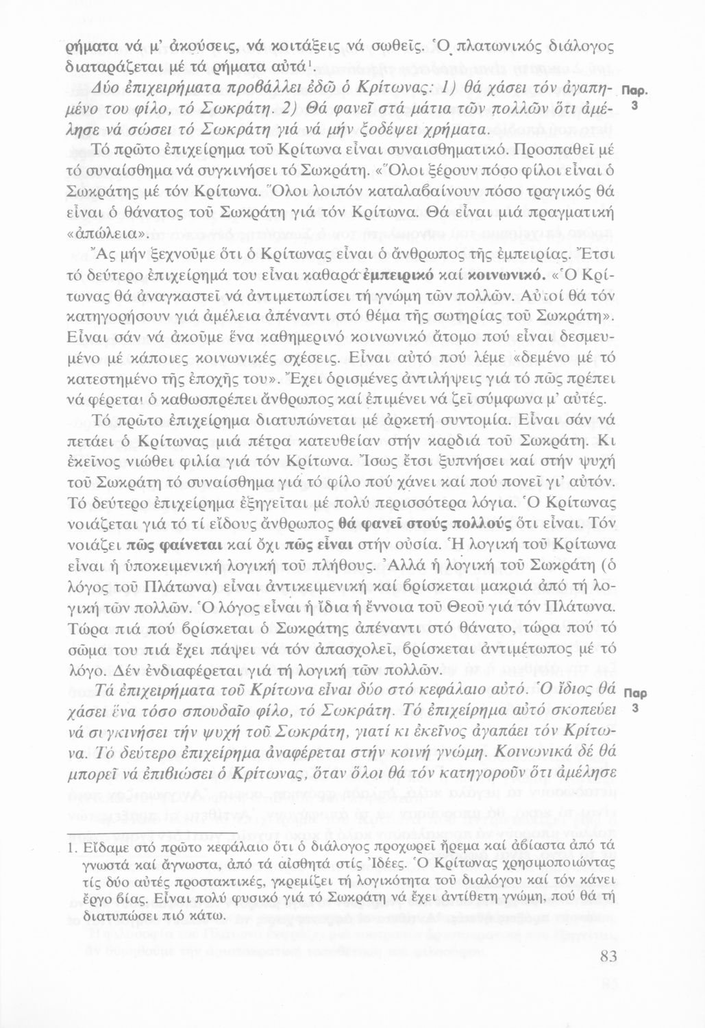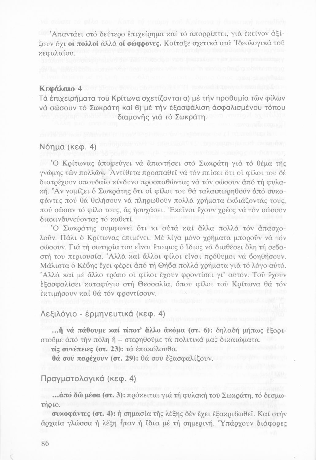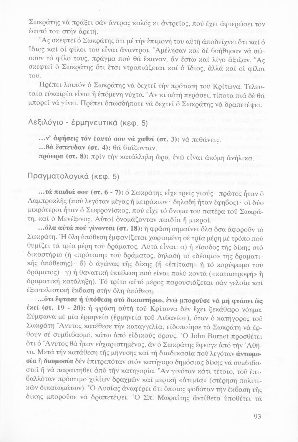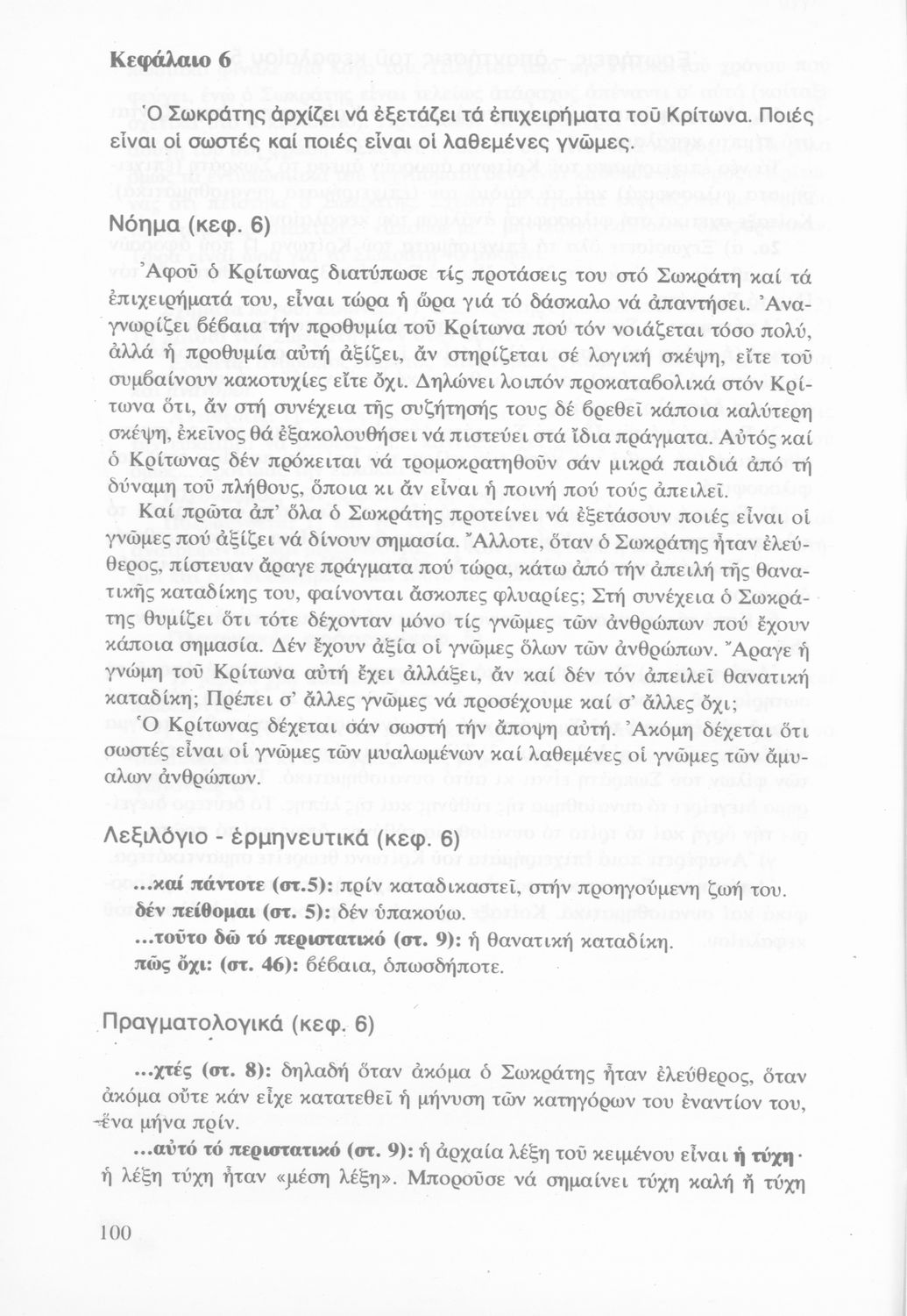 Σχολικό εγχειρίδιο Αρχαίων Ελληνικών Γυμνασίου που περιέχει τα έργα του Πλάτωνα Απολογία Σωκράτους και Κρίτων, ερμηνευτικά και πραγματολογικά σχόλια και λεξιλογικές παρατηρήσεις.