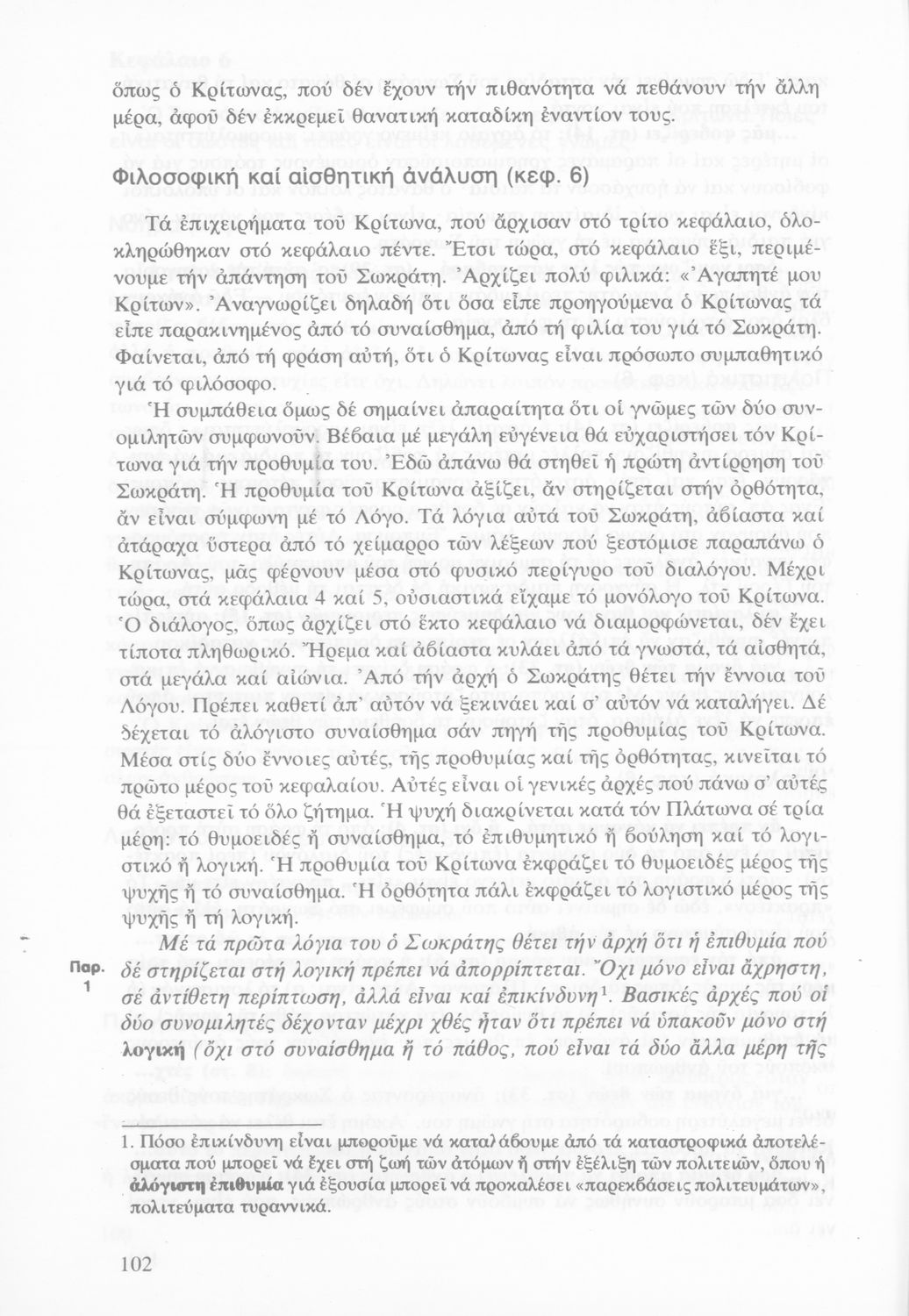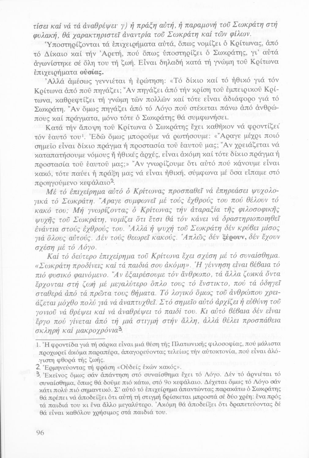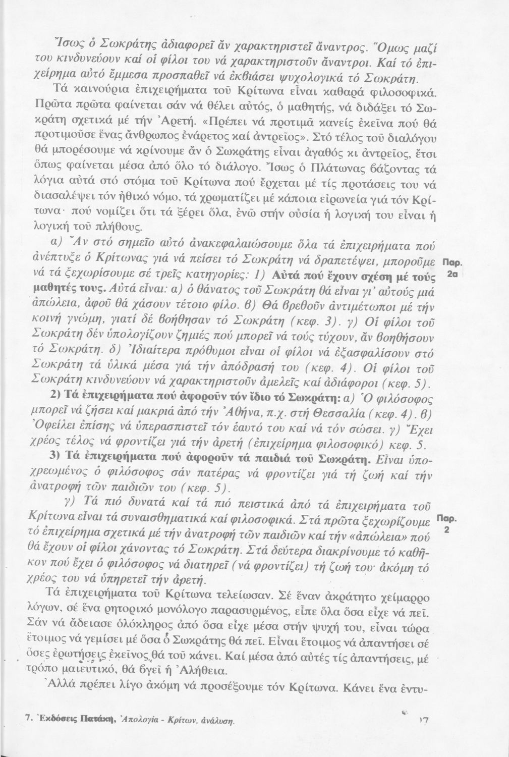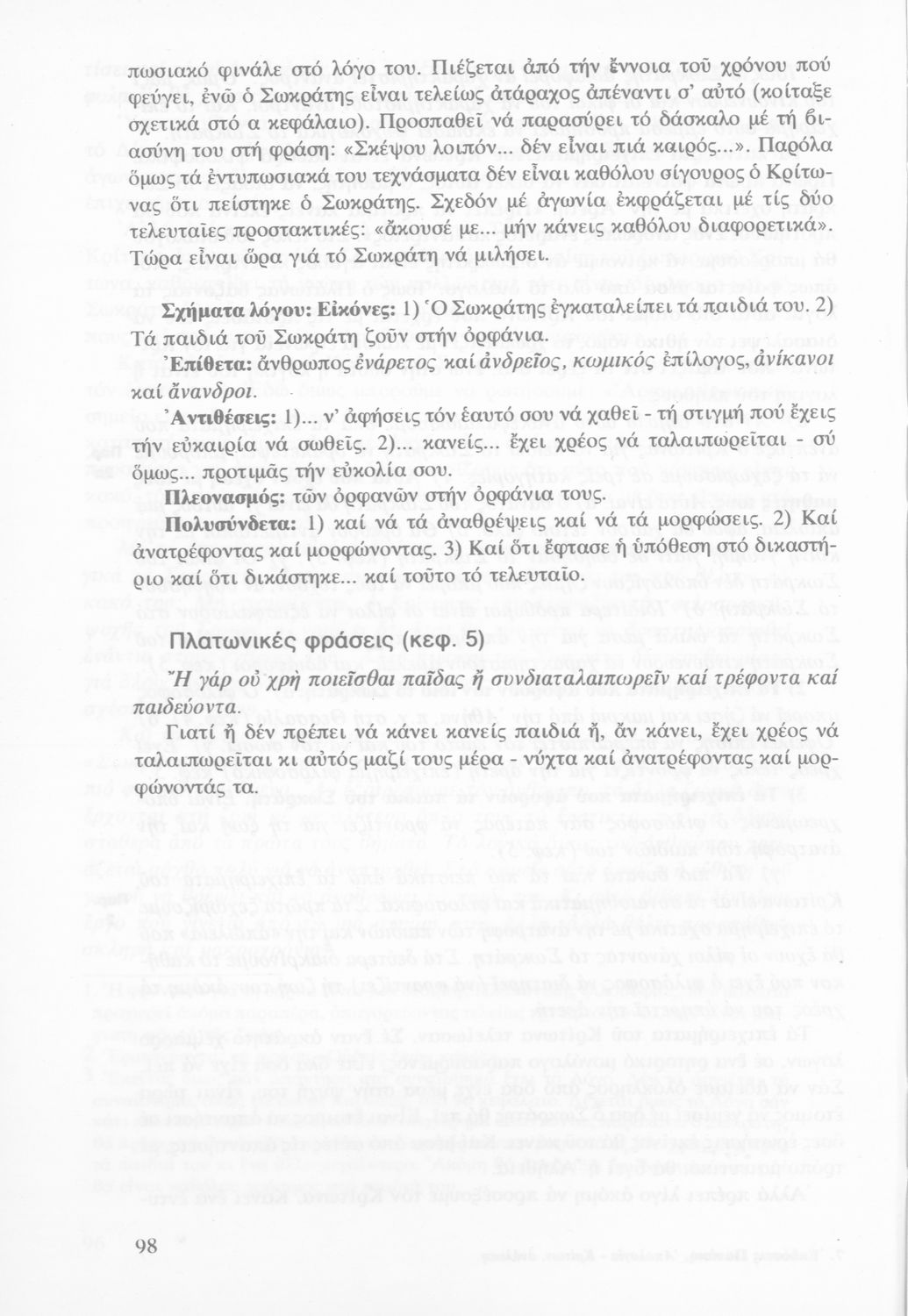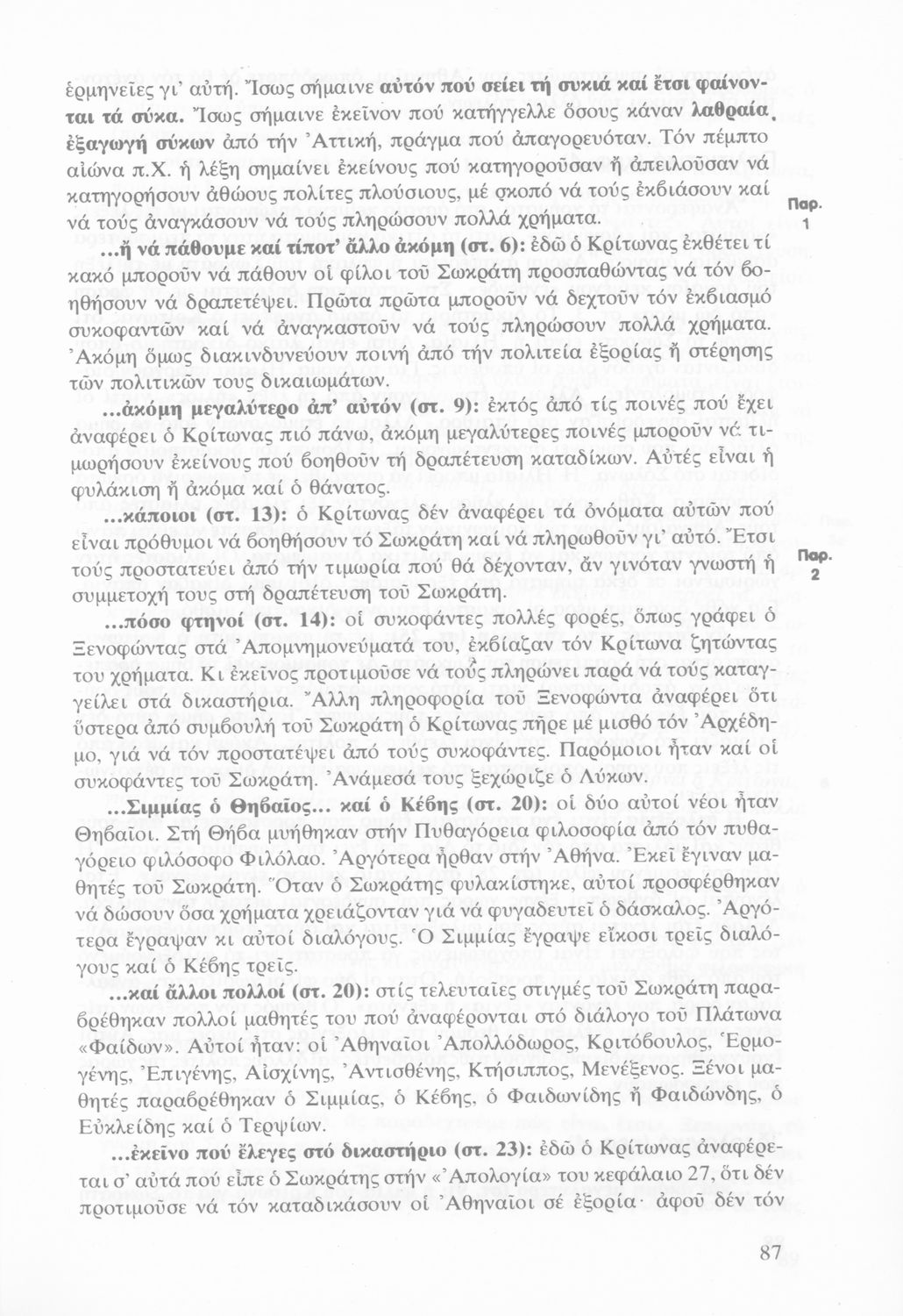 Σχολικό εγχειρίδιο Αρχαίων Ελληνικών Γυμνασίου που περιέχει τα έργα του Πλάτωνα Απολογία Σωκράτους και Κρίτων, ερμηνευτικά και πραγματολογικά σχόλια και λεξιλογικές παρατηρήσεις.