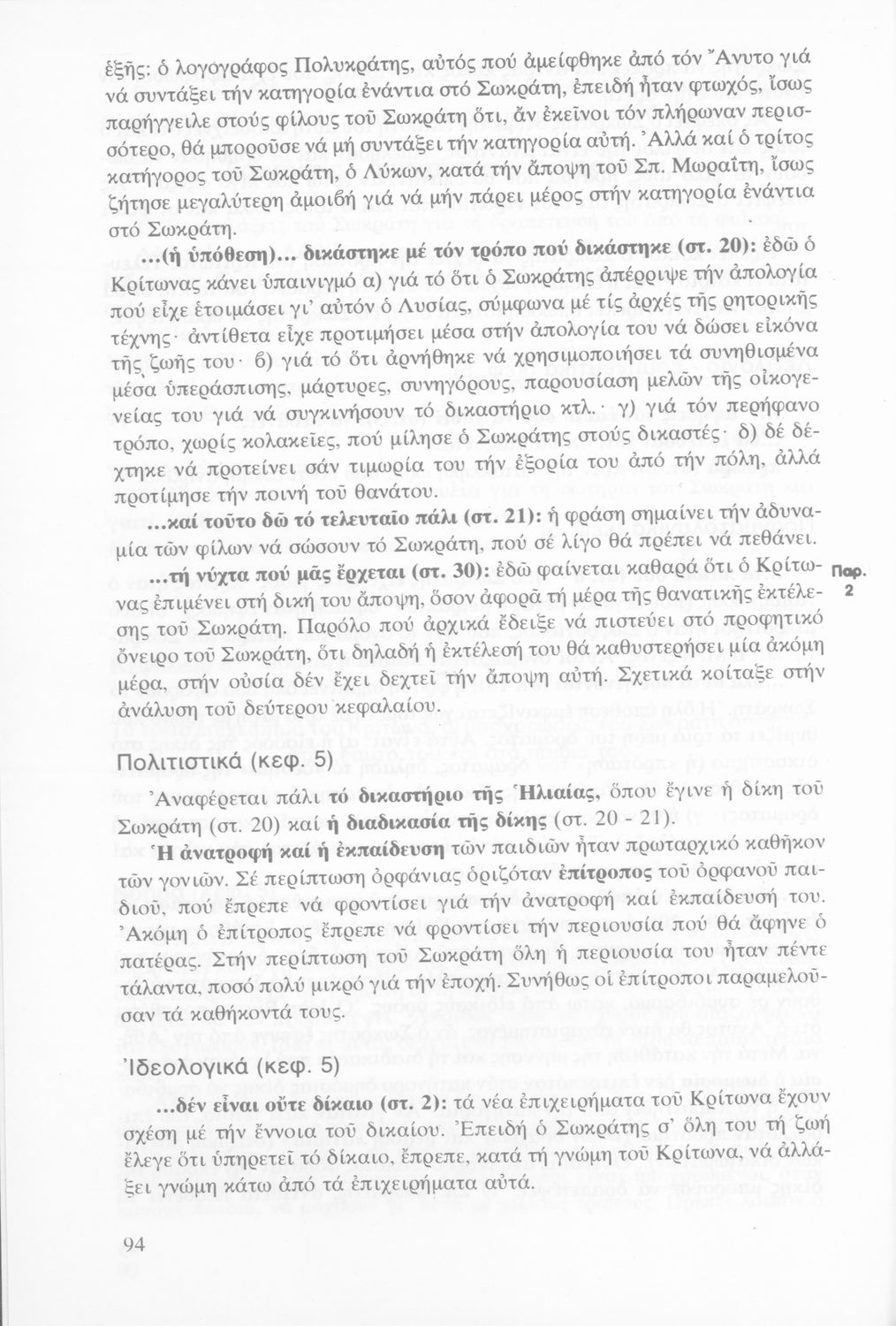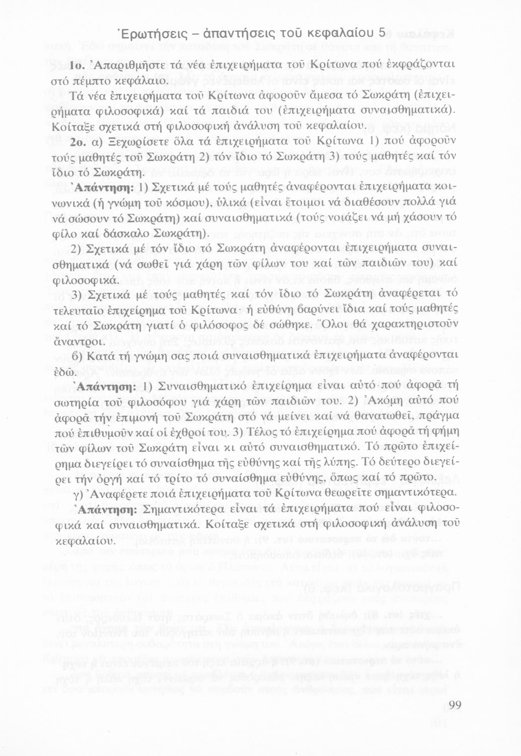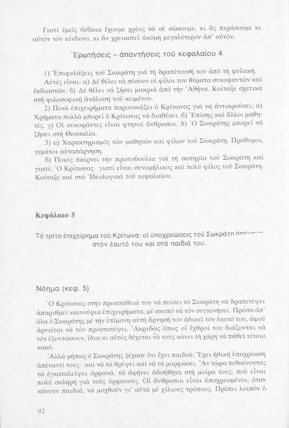 Σχολικό εγχειρίδιο της Ε΄ Γυμνασίου για το μάθημα των Αρχαίων Ελληνικών. Περιέχει το πρωτότυπο κείμενο του Πλάτωνα από την απολογία του Κρίτωνα με ερμηνευτικά, πραγματολογικά σχόλια και λεξιλογικές ...