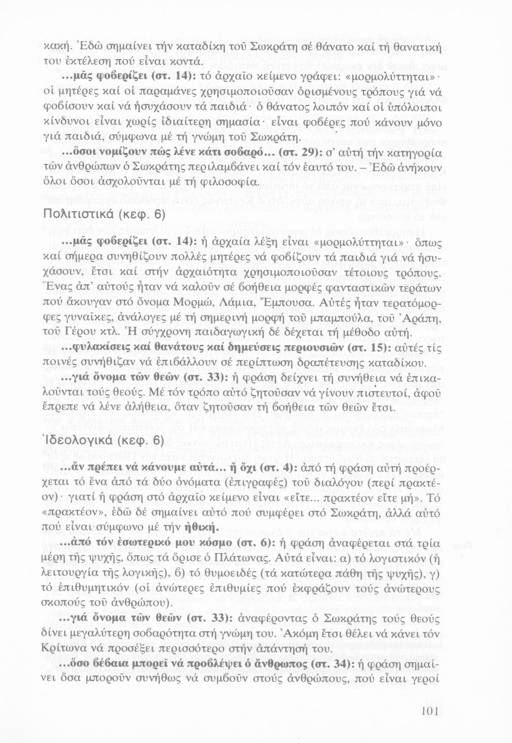Μαθητικό βοήθημα Αρχαίων Ελληνικών Γυμνασίου που περιλαμβάνει τα κείμενα του Πλάτωνα Απολογία Σωκράτους, Κρίτων, Λάχης και πραγματολογικές παρατηρήσεις.