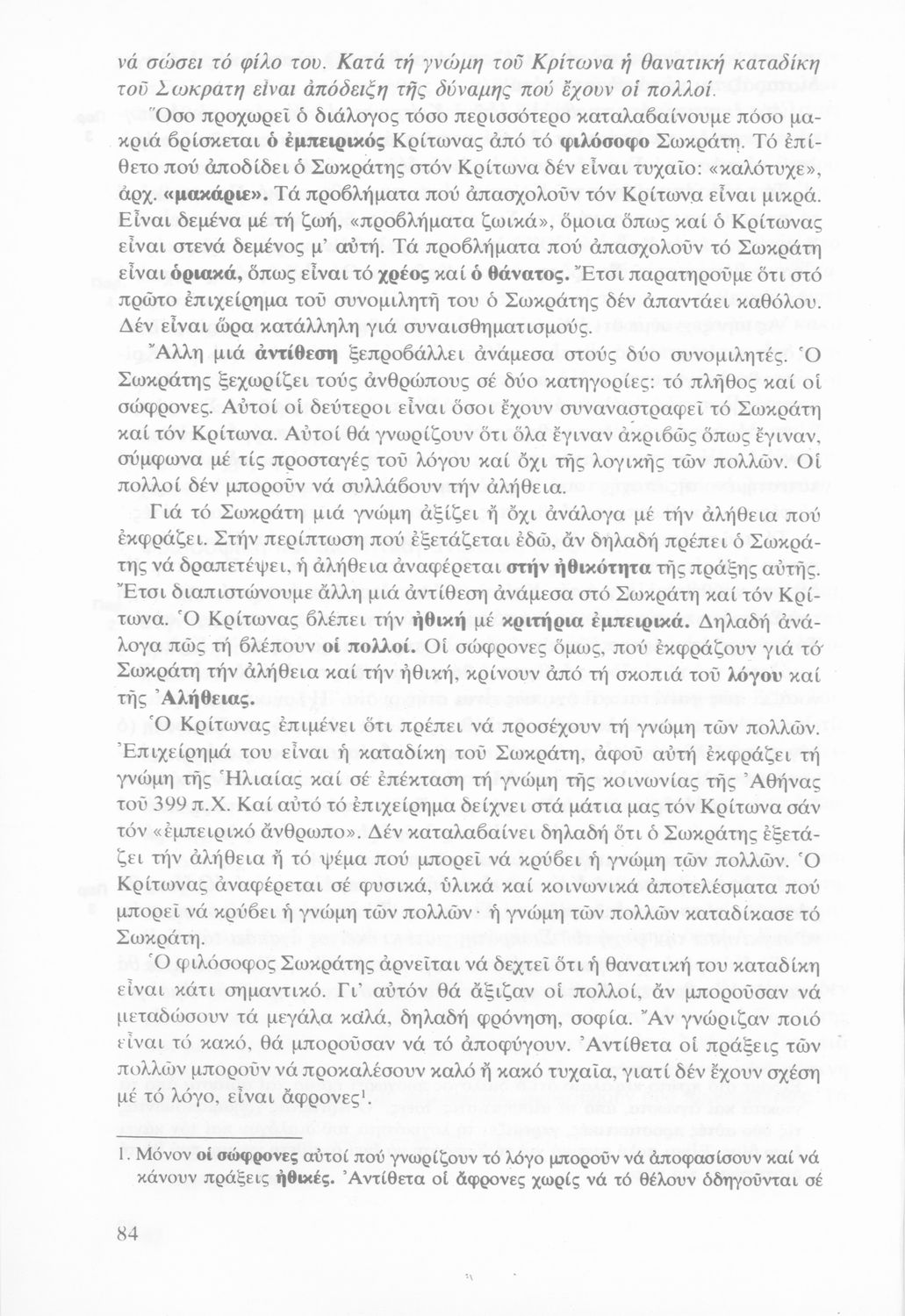Σχολικό εγχειρίδιο Φιλοσοφίας Γ΄ Γυμνασίου που περιλαμβάνει τα κείμενα Απολογία του Σωκράτη, Κρίτων, Φαίδων και Ηθικά Νικομάχεια. Περιέχει εισαγωγικά και ερμηνευτικά σχόλια και παρατηρήσεις για μελέτη.