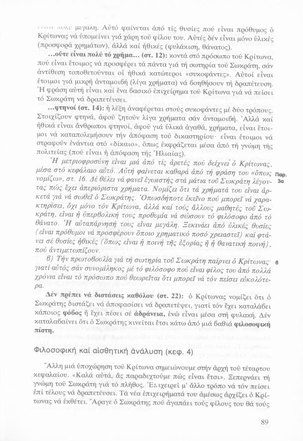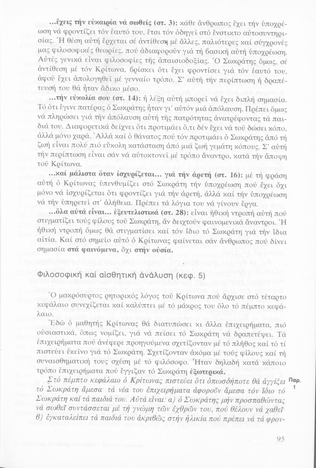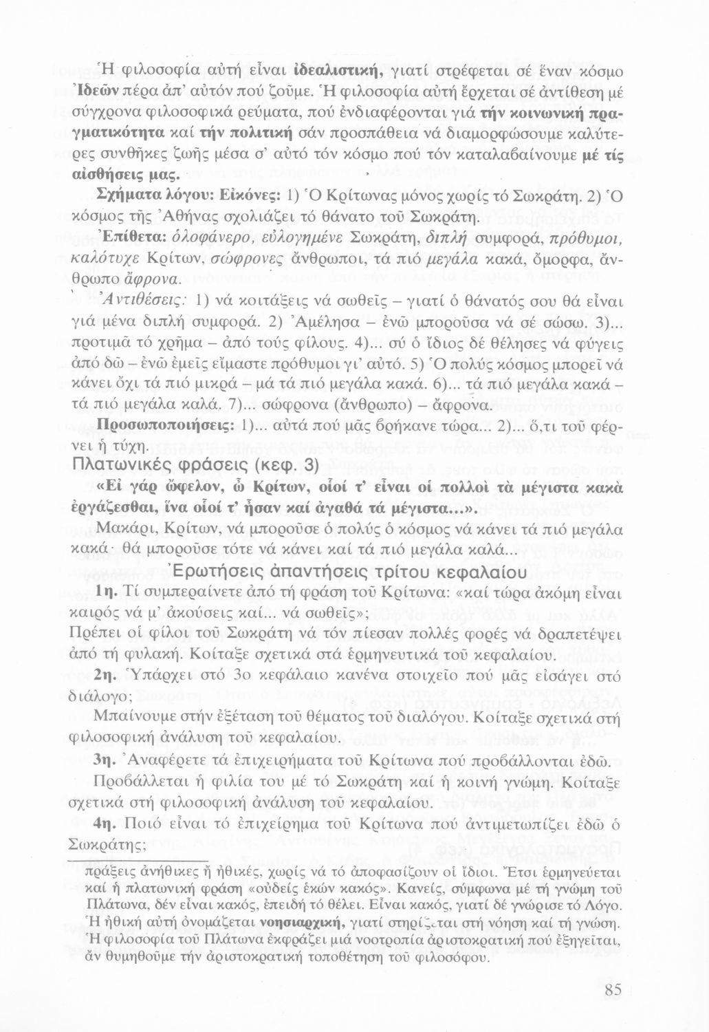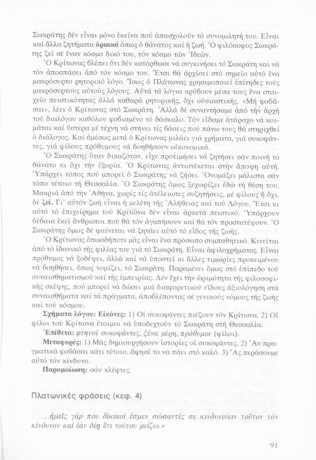 Σχολικό εγχειρίδιο Αρχαίων Ελληνικών Γ΄ Γυμνασίου που περιλαμβάνει το έργο του Πλάτωνα Κρίτων, εισαγωγή, μετάφραση και ερμηνευτικές παρατηρήσεις.