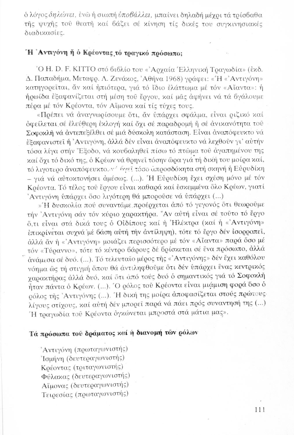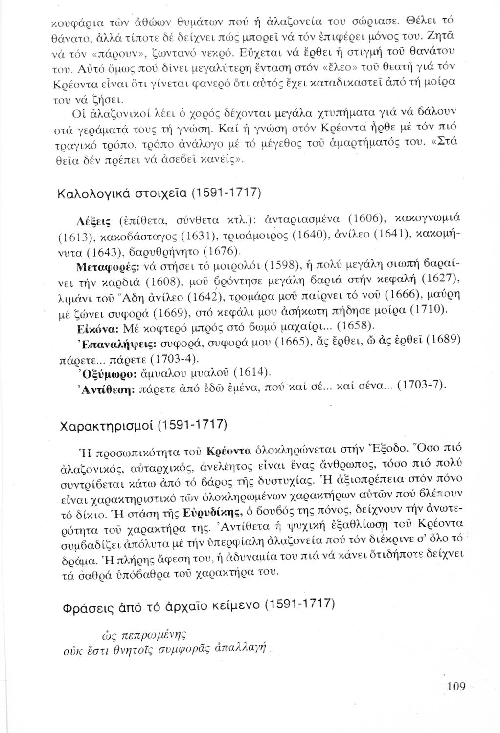 Σχολικό εγχειρίδιο Αρχαίων Ελληνικών ΣΤ΄ Γυμνασίου που περιέχει την Αντιγόνη του Σοφοκλή, ερμηνευτικά και πραγματολογικά σχόλια και λεξιλογικές παρατηρήσεις.