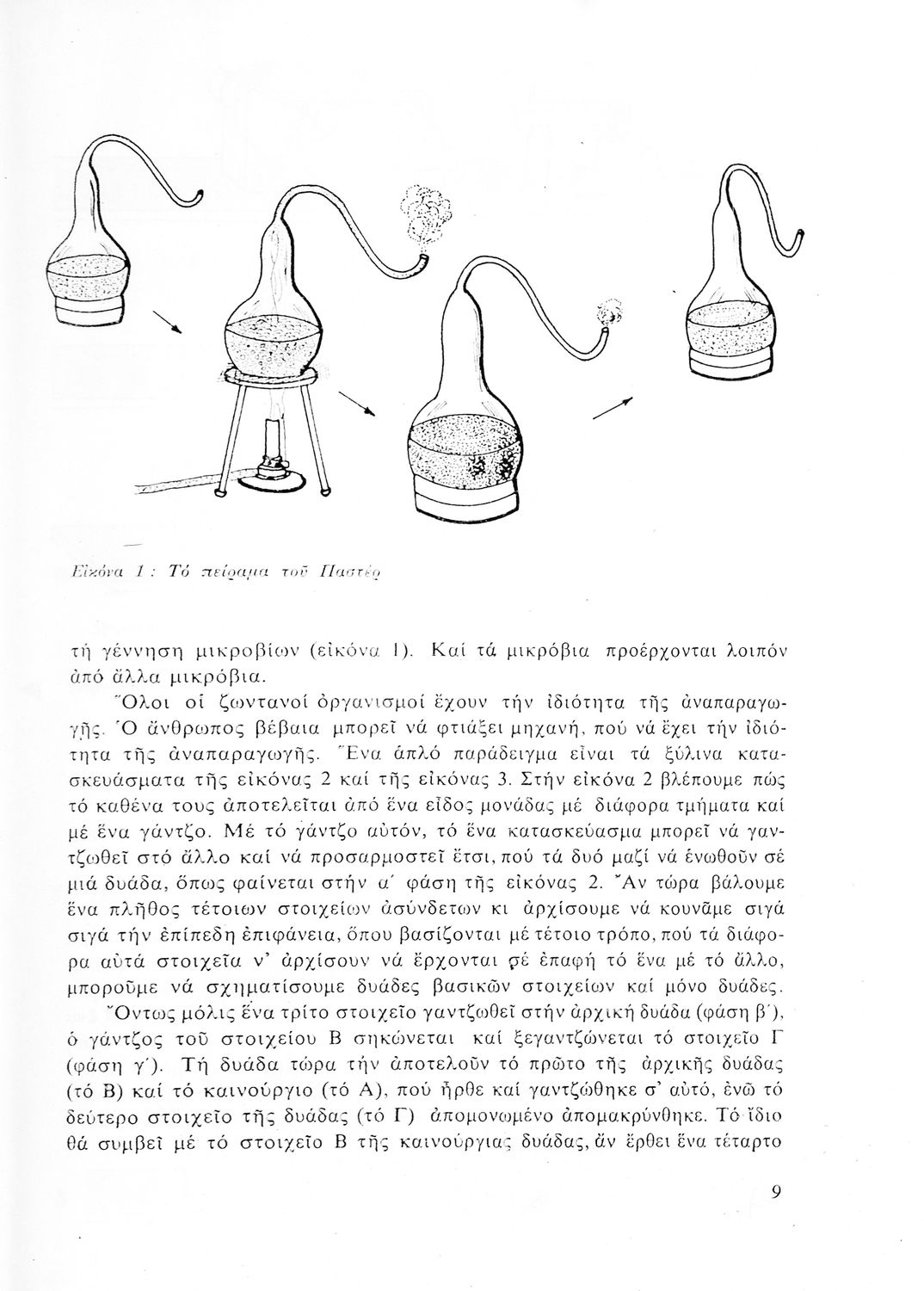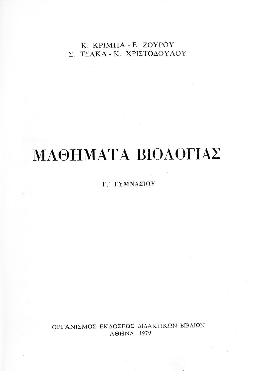 Σχολικό εγχειρίδιο Βιολογίας Γ΄ Γυμνασίου που εστιάζει στις συνθήκες γέννησης, μεταβολής και θανάτου των έμβιων οργανισμών. Φέρει το σύμβολο της δικτατορίας.