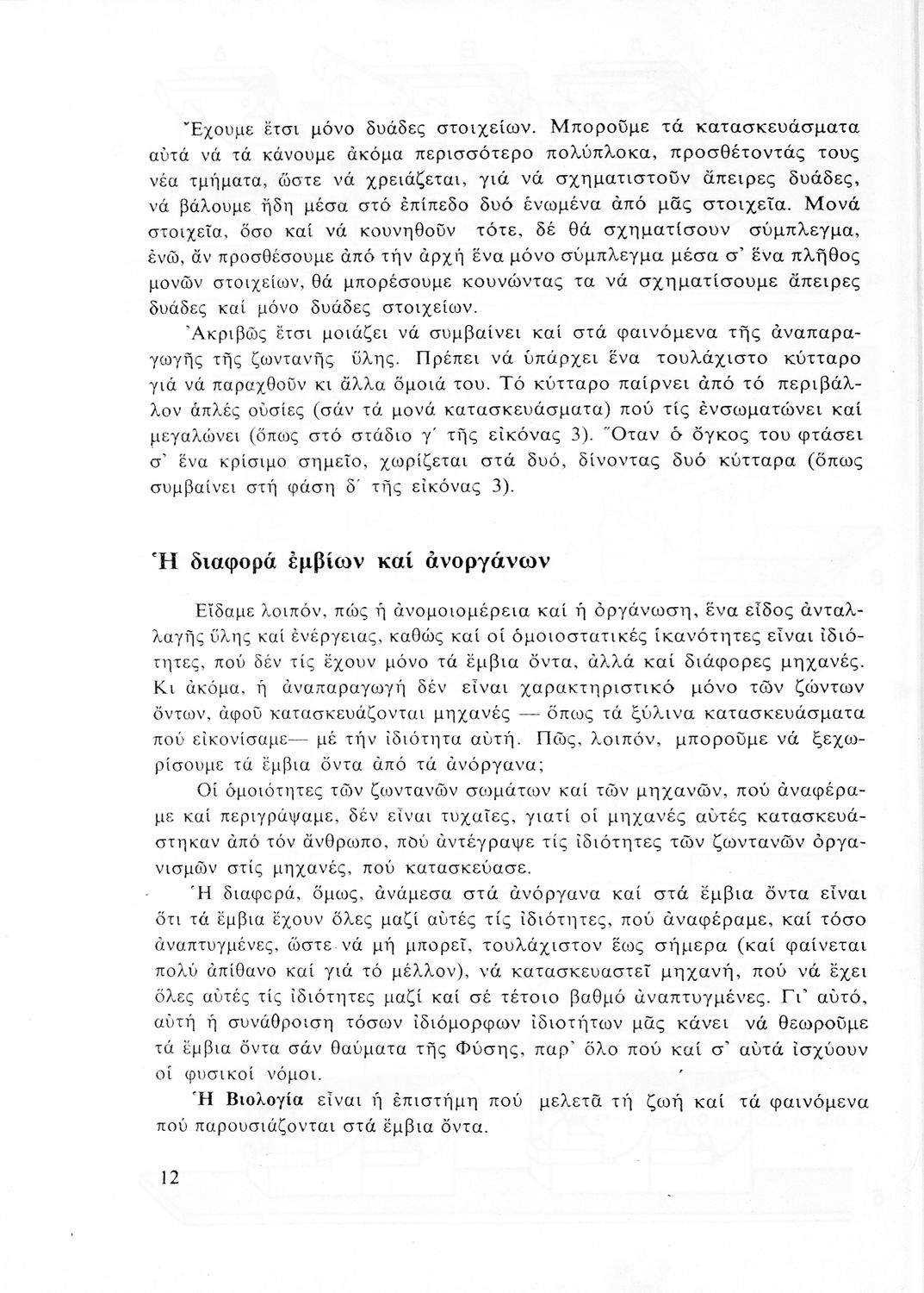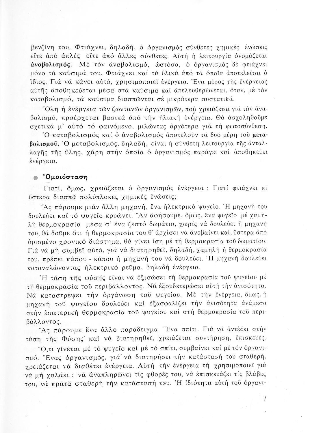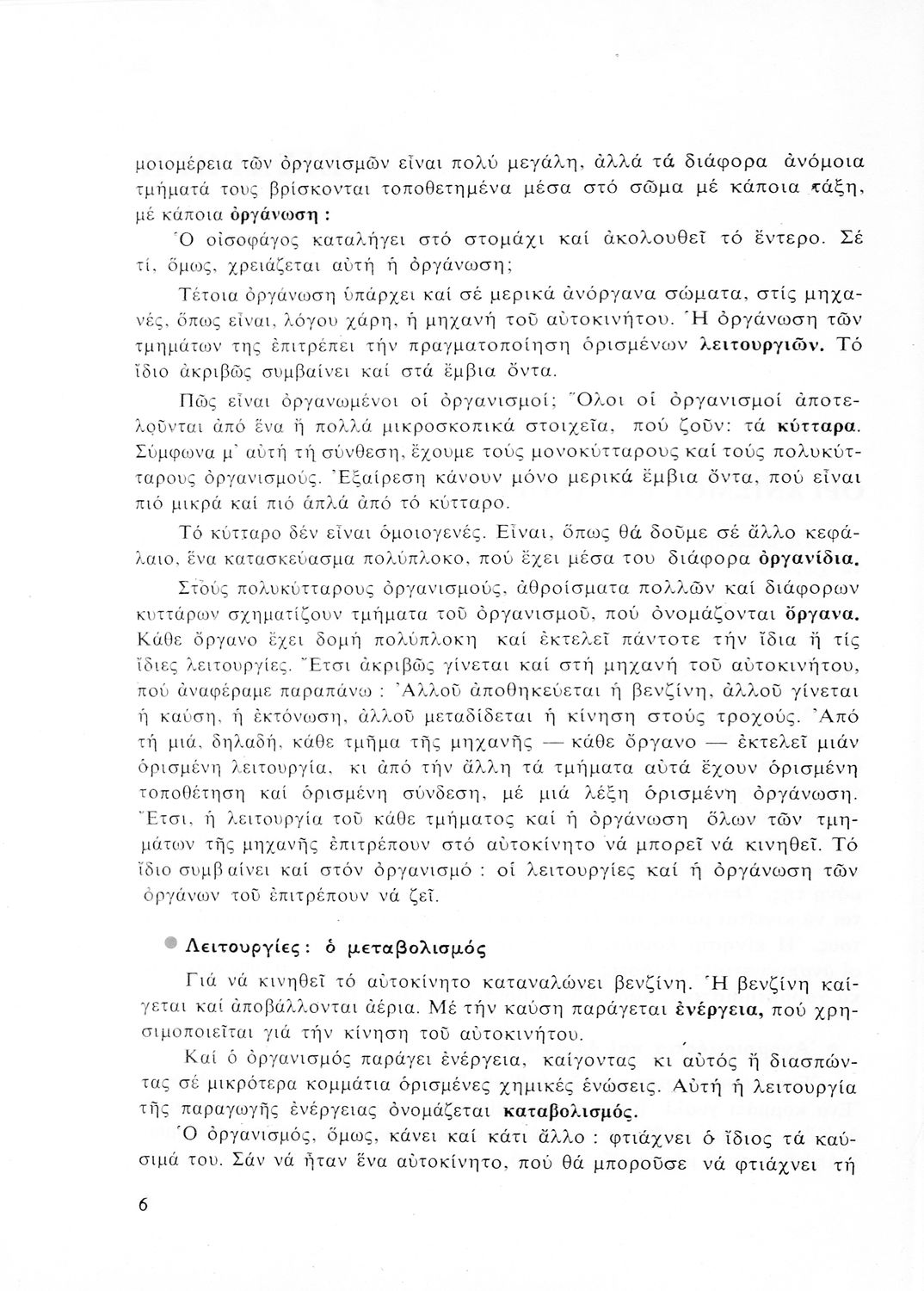 Σχολικό εγχειρίδιο Βιολογίας ΣΤ΄ Γυμνασίου που εστιάζει στις συνθήκες γέννησης, μεταβολής και θανάτου των έμβιων οργανισμών. Φέρει το σύμβολο της δικτατορίας. Ο συγγραφέας ήταν υφηγητής του Πανεπιστημίου ...